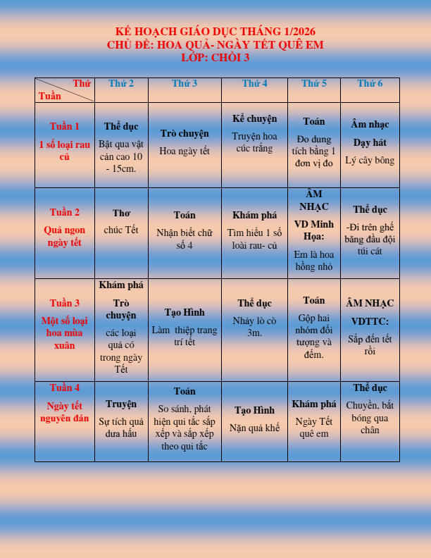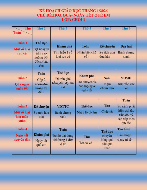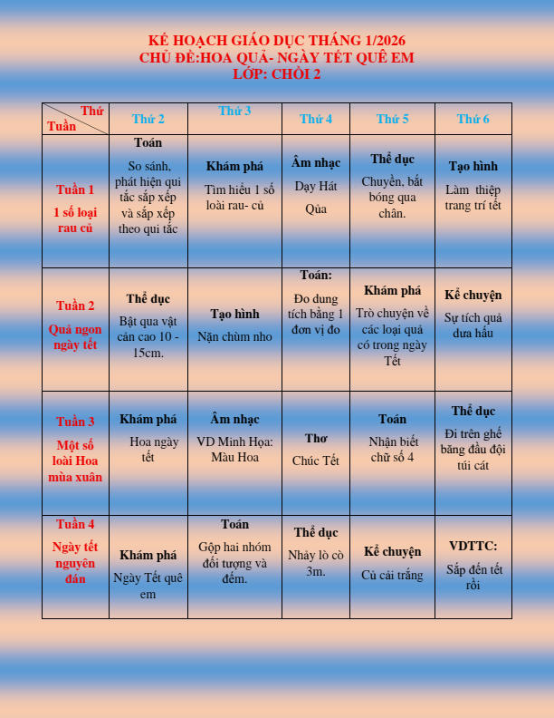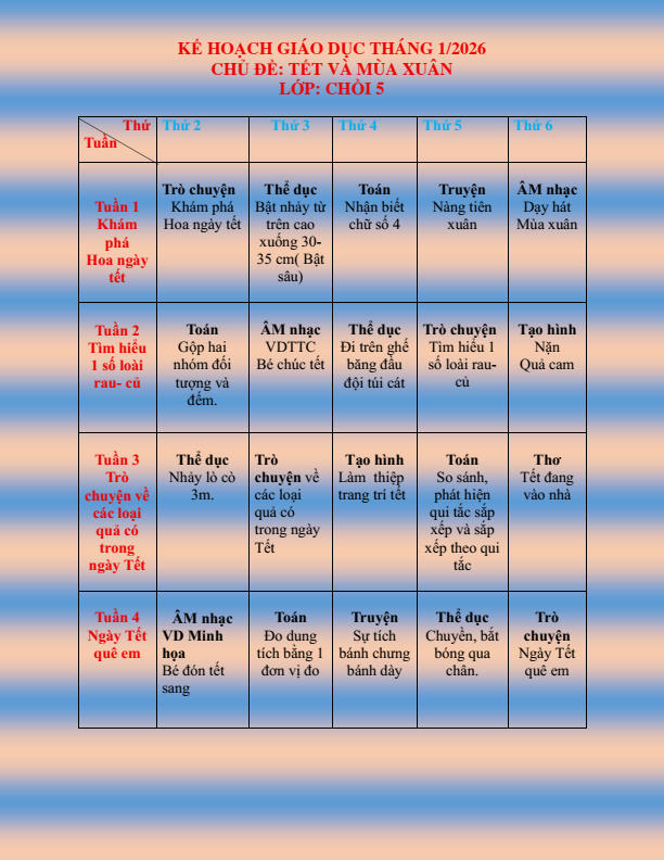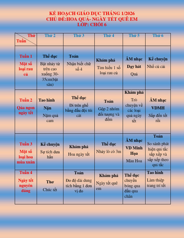 CHƯƠNG TRÌNH HỌC KHỐI CHỒI THÁNG 1.2026