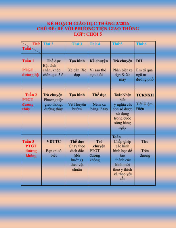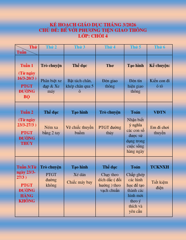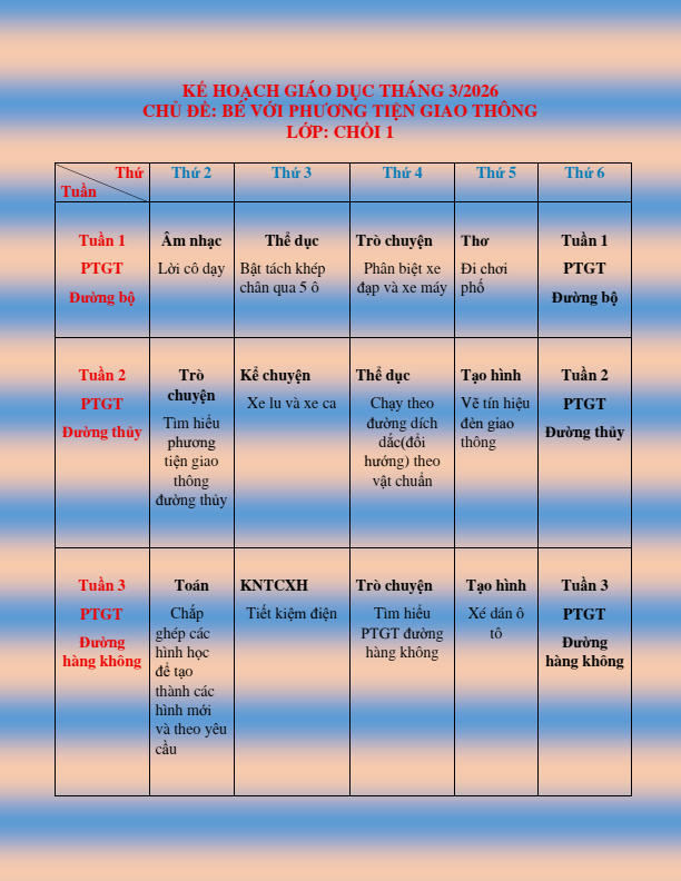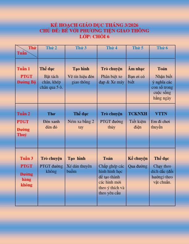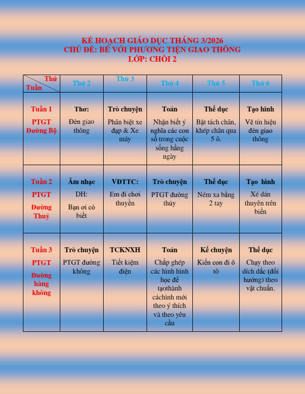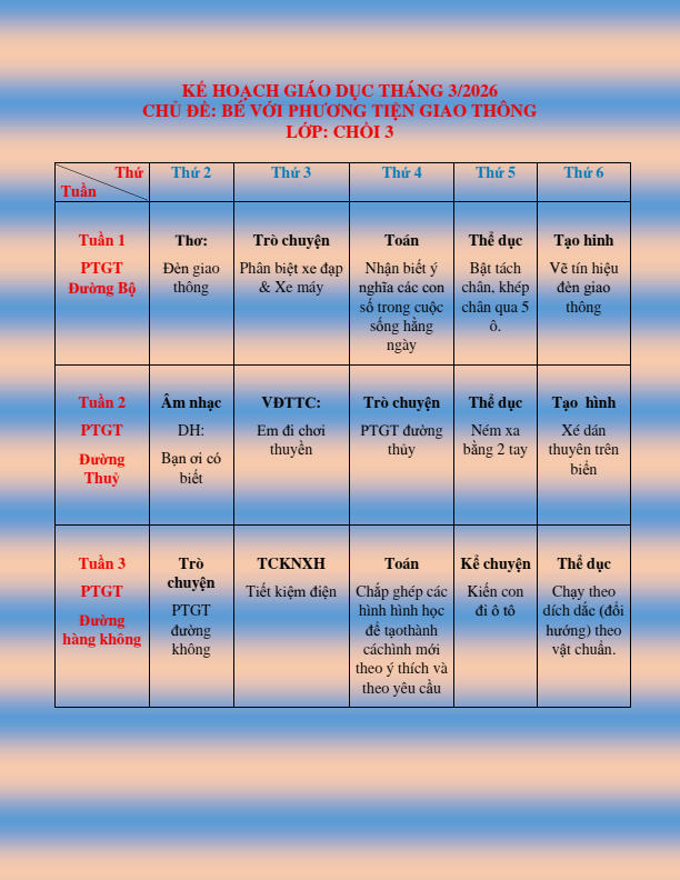 CHƯƠNG TRÌNH HỌC KHỐI CHỒI THÁNG 3.2026