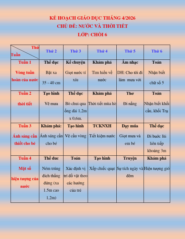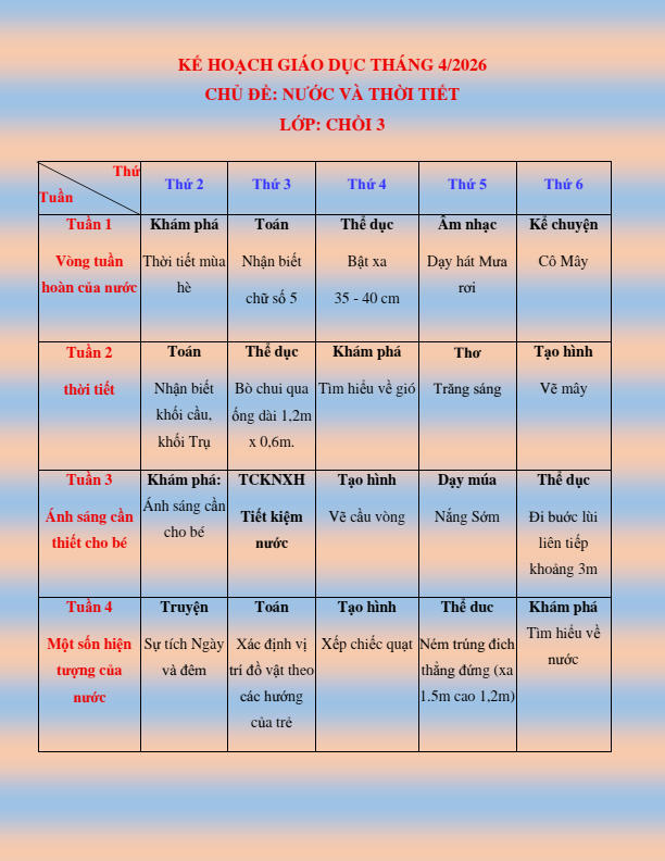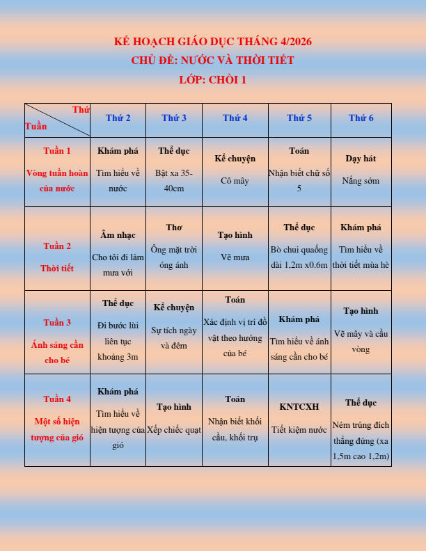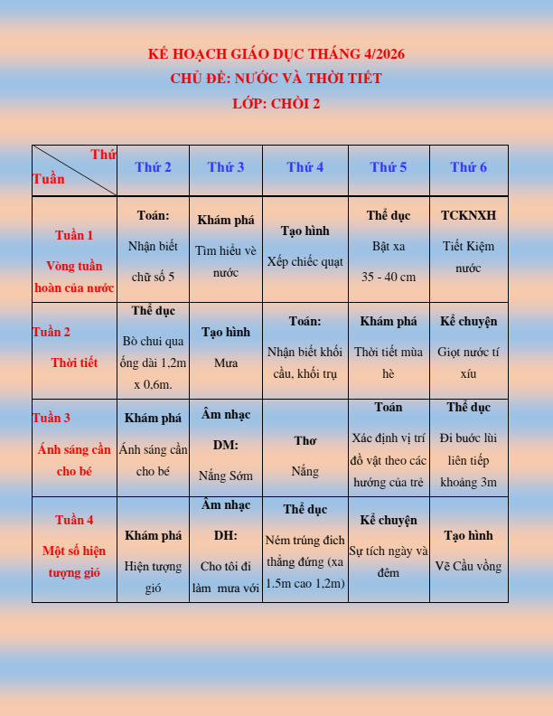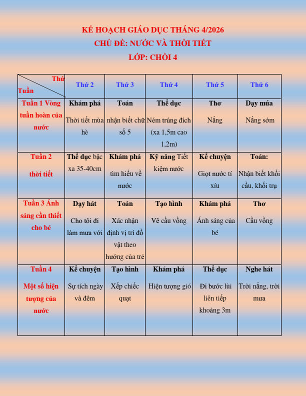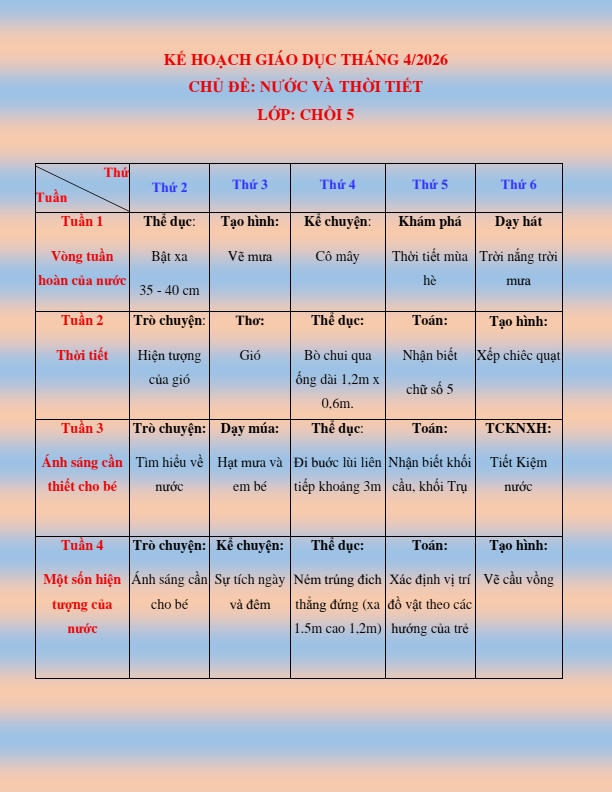 CHƯƠNG TRÌNH HỌC KHỐI CHỒI THÁNG 4.2026