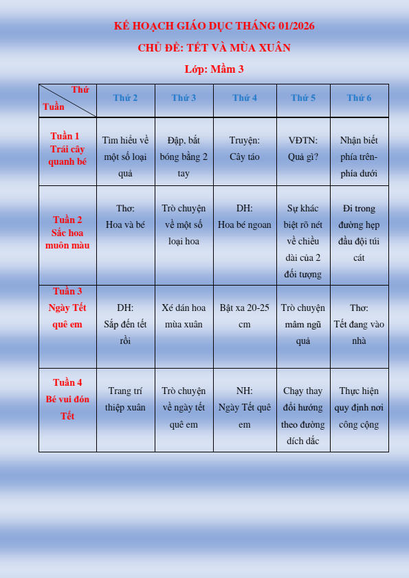 CHƯƠNG TRÌNH HỌC KHỐI MẦM THÁNG 1.2026