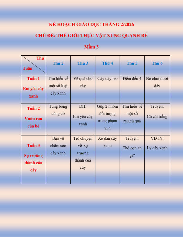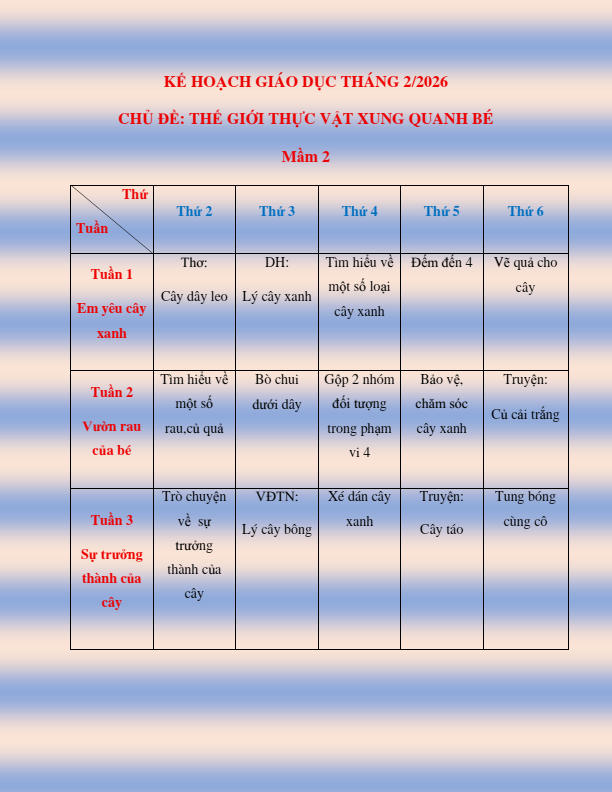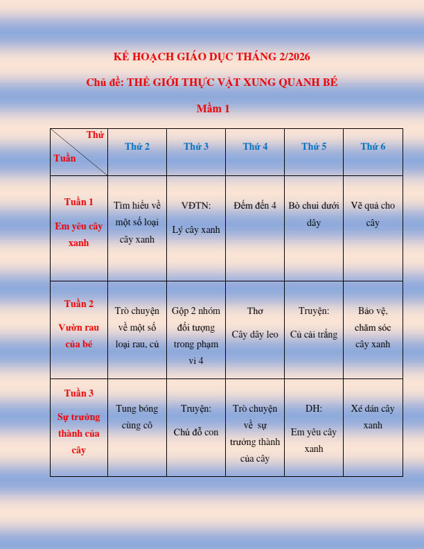 CHƯƠNG TRÌNH HỌC KHỐI MẦM THÁNG 2.2026