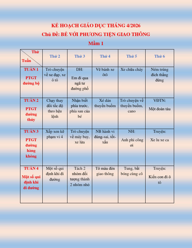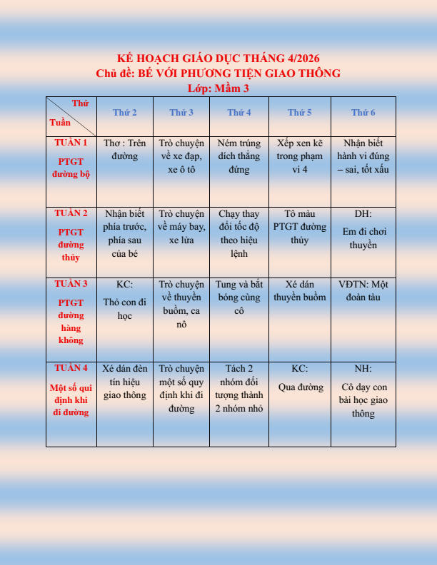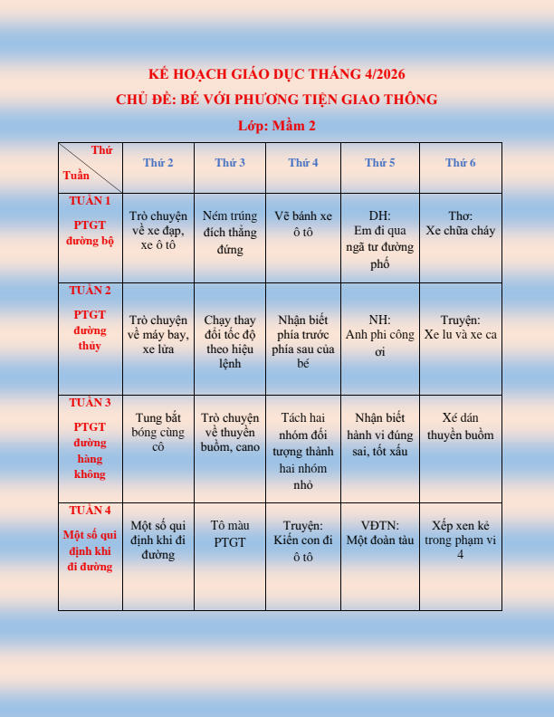 CHƯƠNG TRÌNH HỌC KHỐI MẦM THÁNG 4.2026