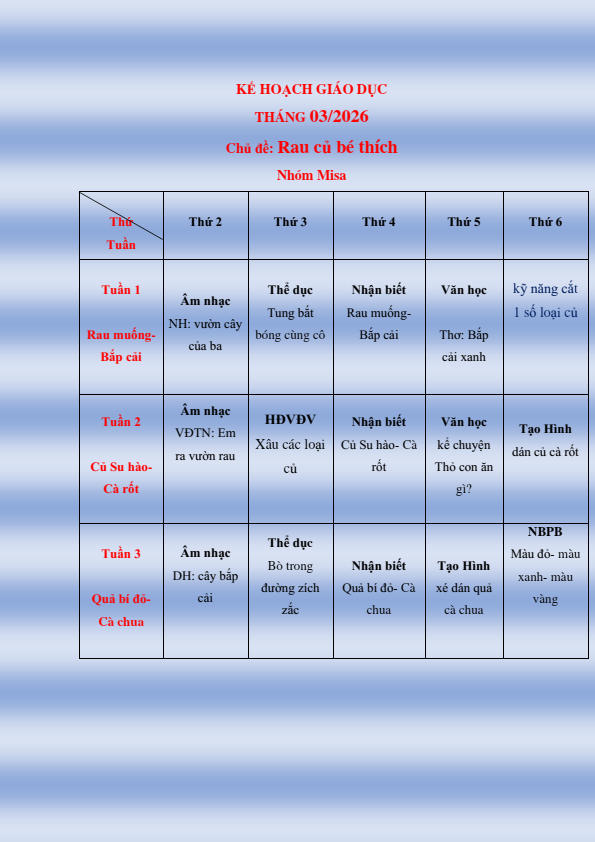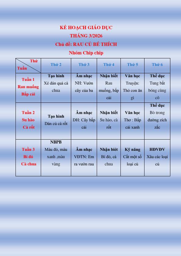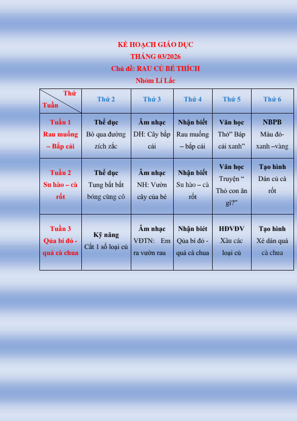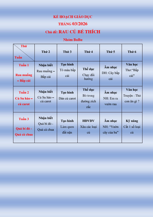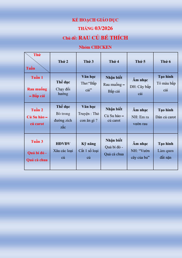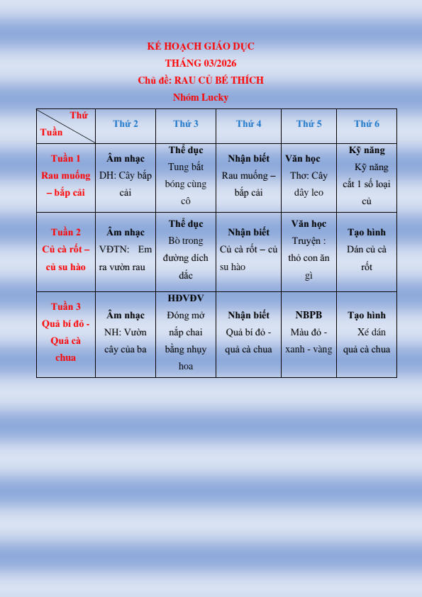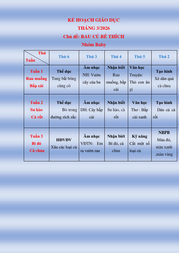 CHƯƠNG TRÌNH HỌC KHỐI NHÀ TRẺ THÁNG 3.2026