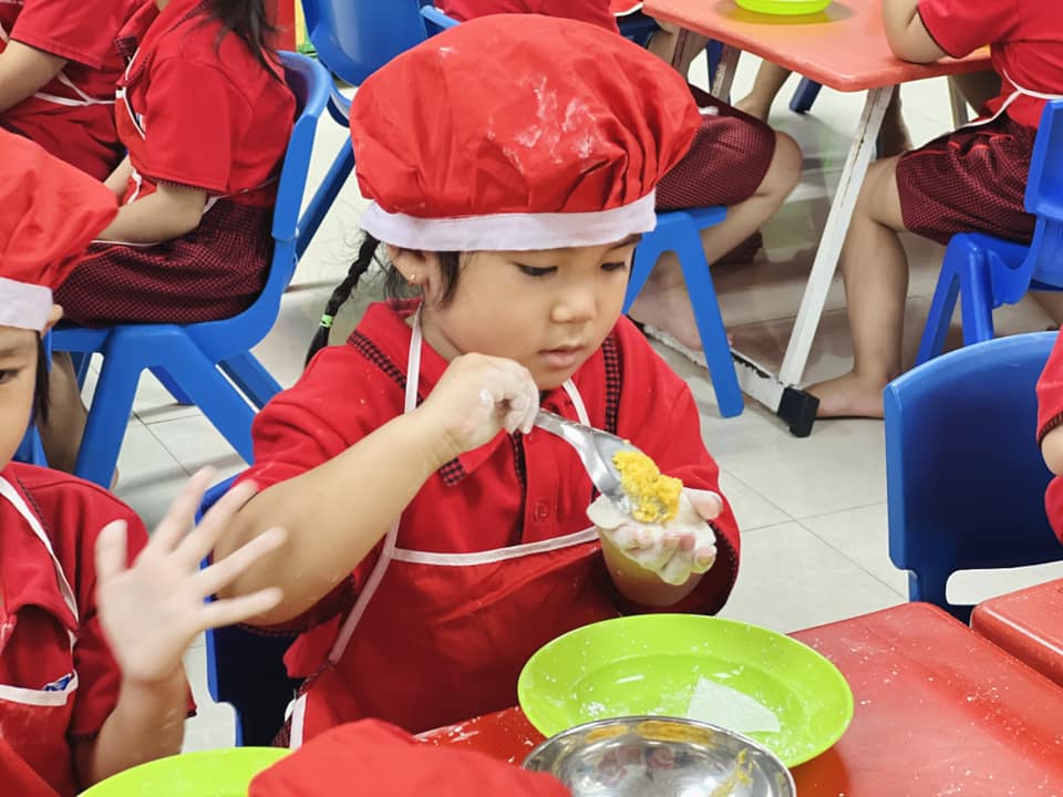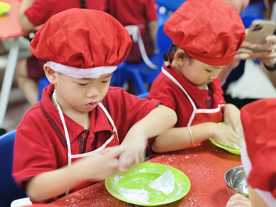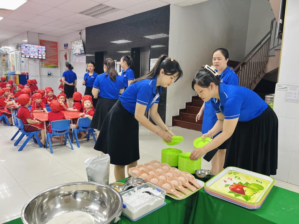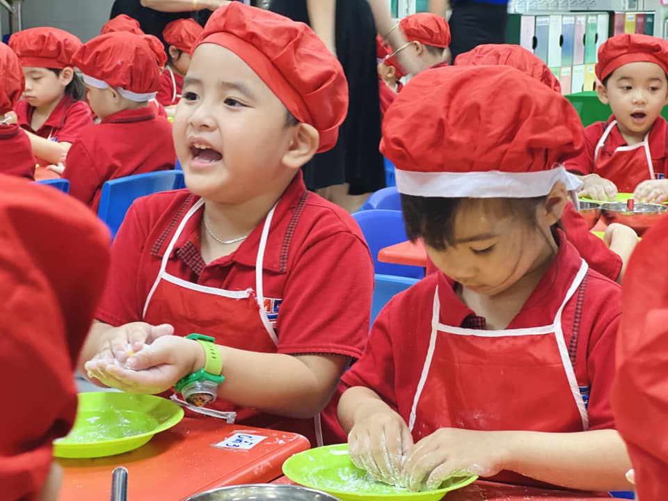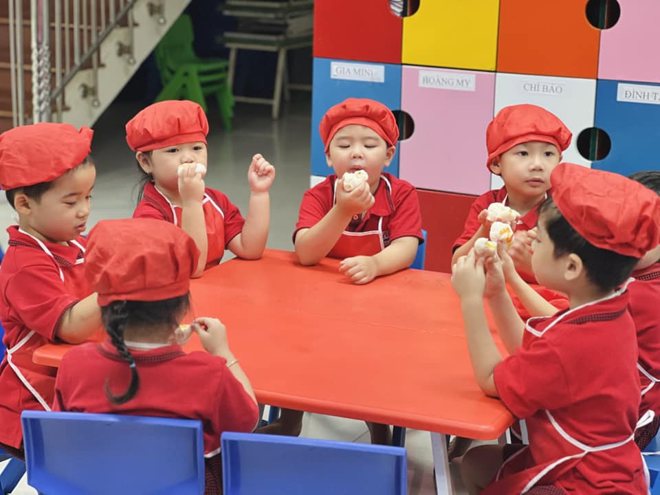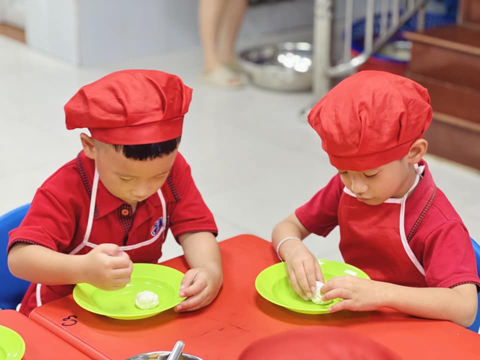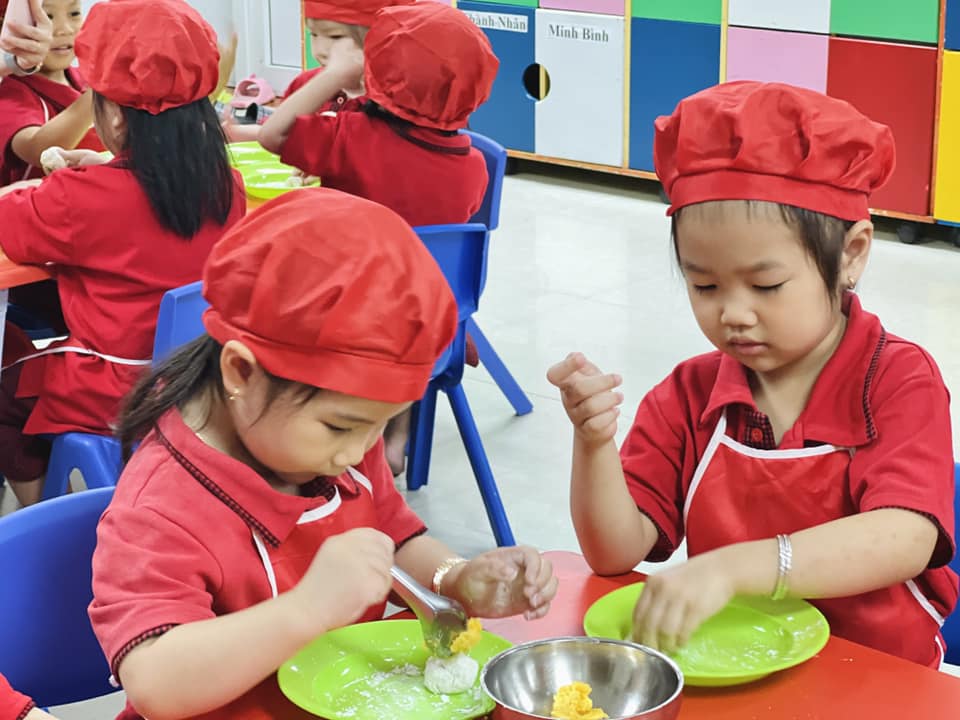 Những “đầu bếp nhí” khối Chồi hôm nay thật đáng yêu với gương mặt lấm tấm bột, đôi tay trắng xóa nhưng ánh mắt thì rạng rỡ niềm vui!