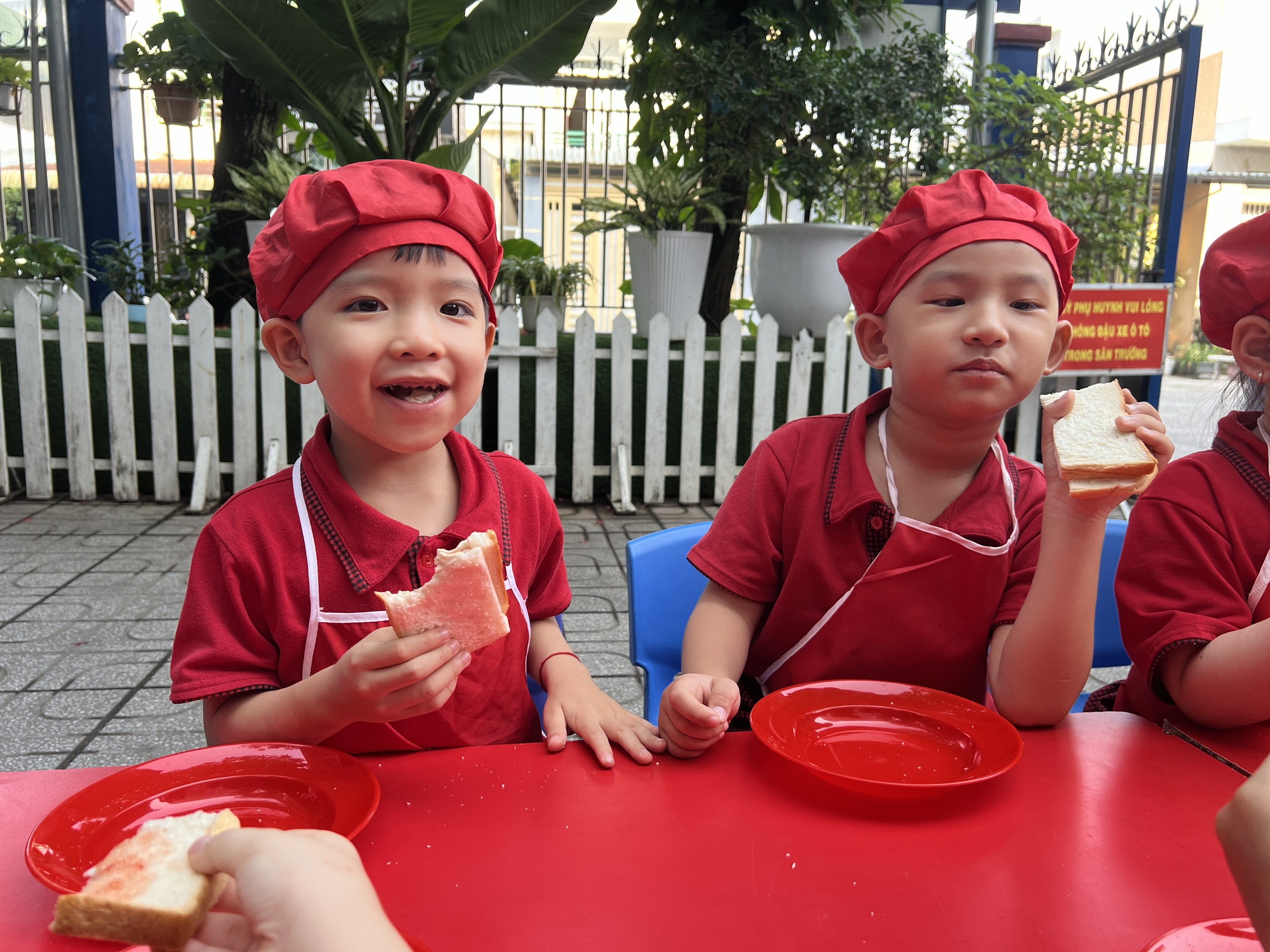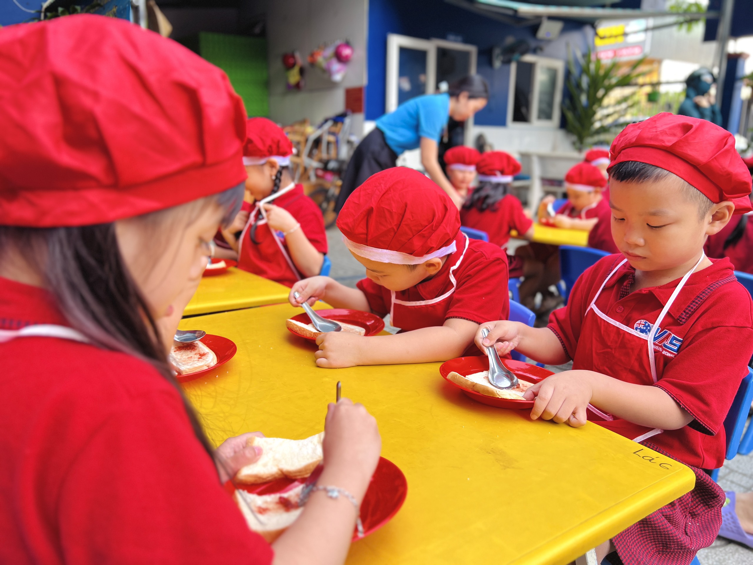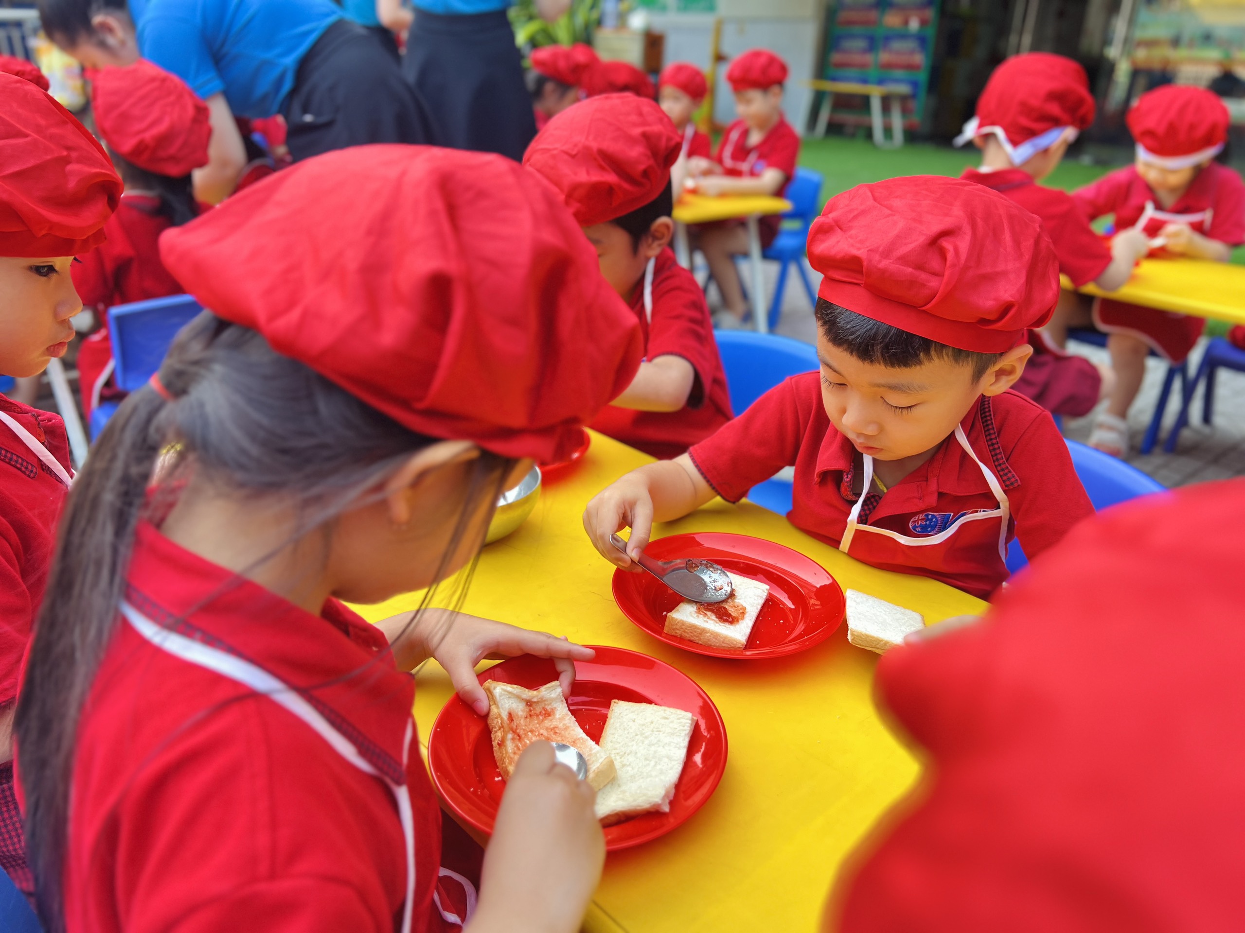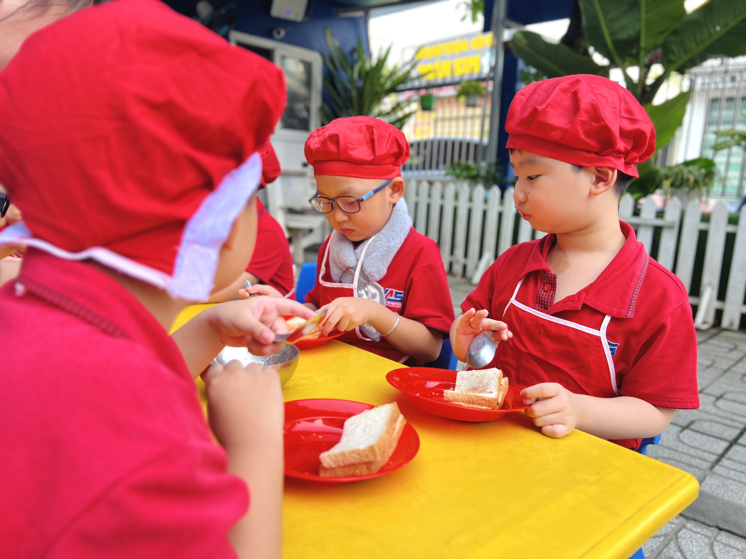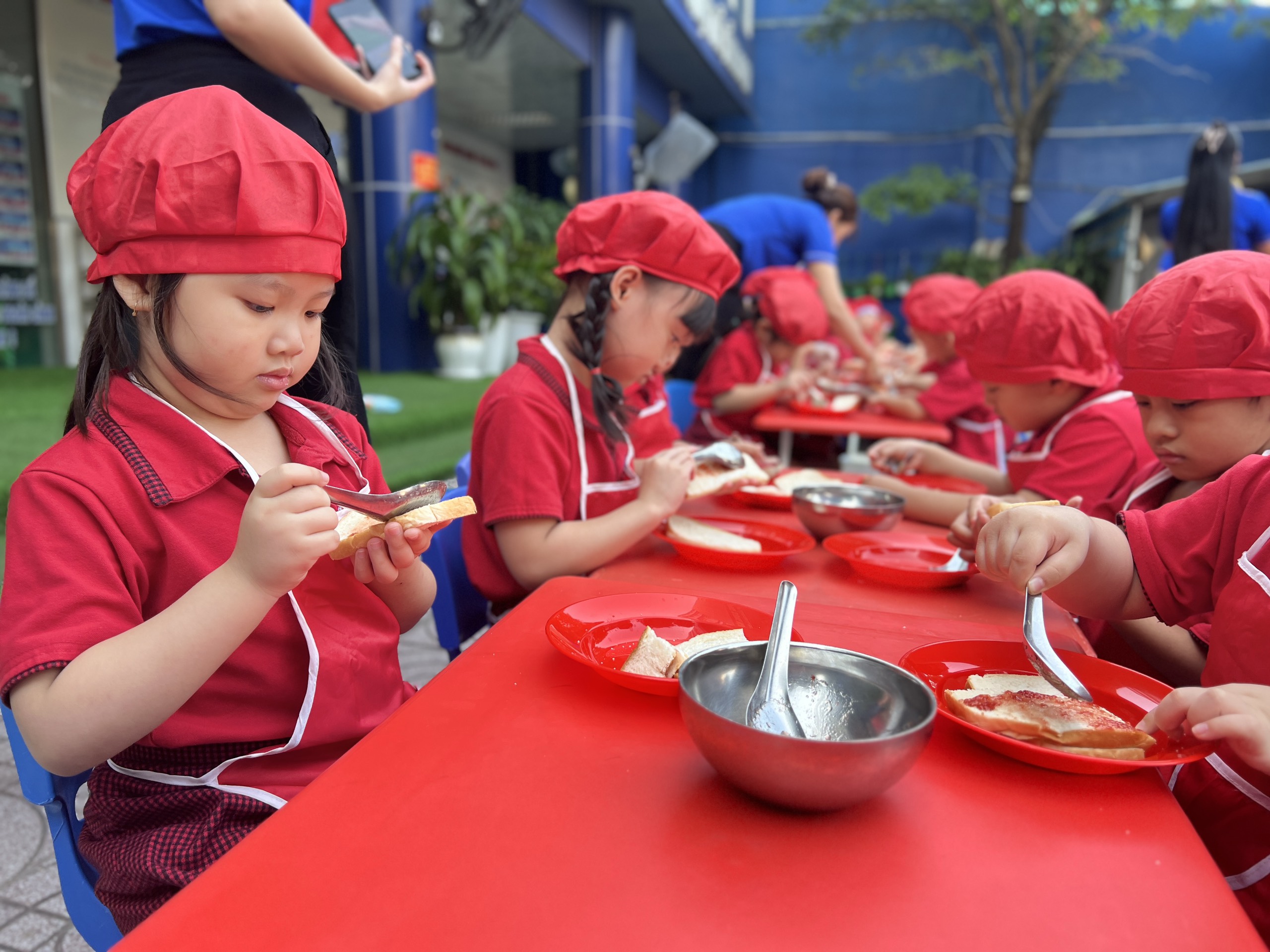 Một buổi trải nghiệm vô cùng thú vị với hoạt động làm bánh mì sandwich phết mứt dâu của các đầu bếp nhí