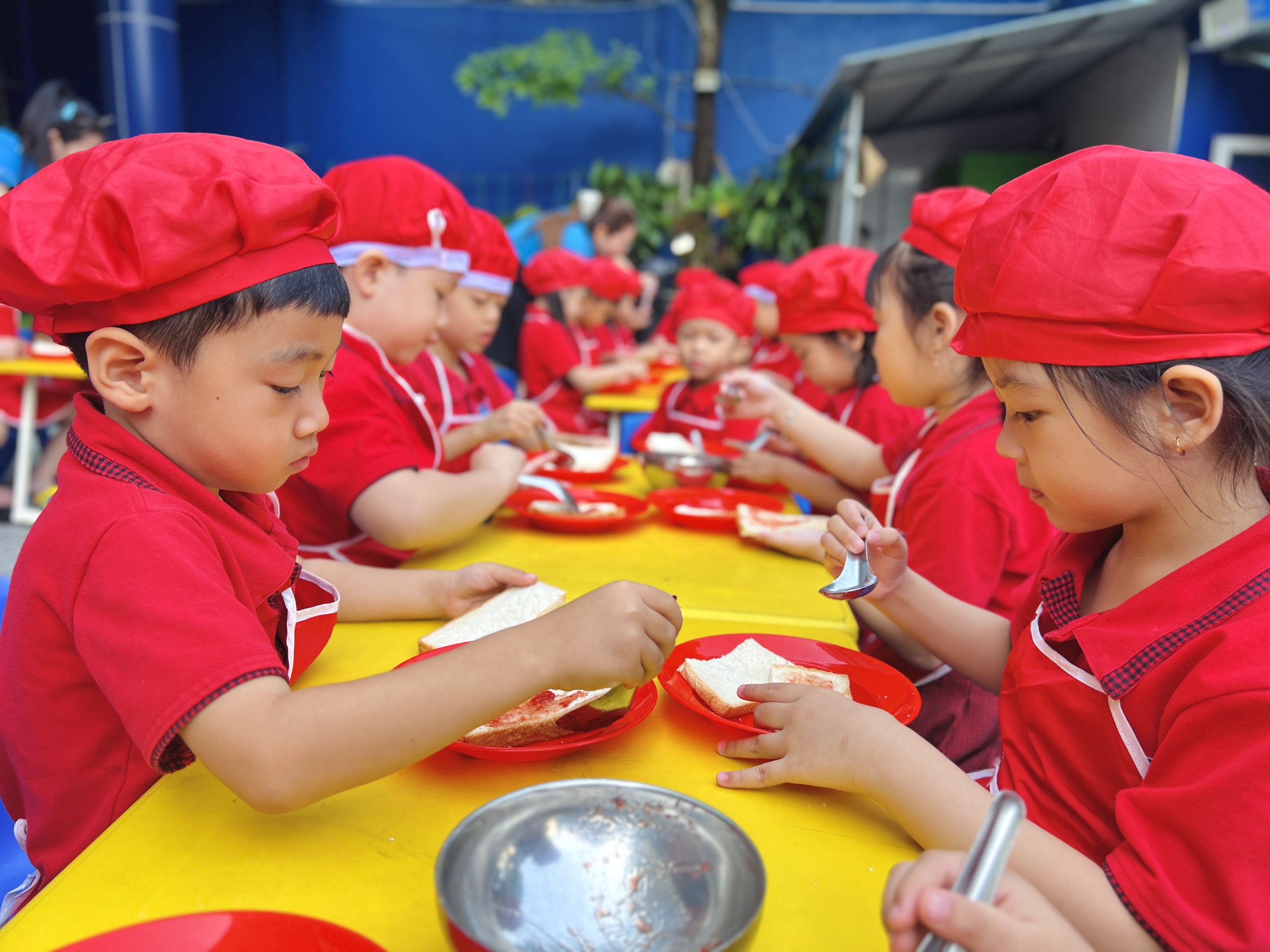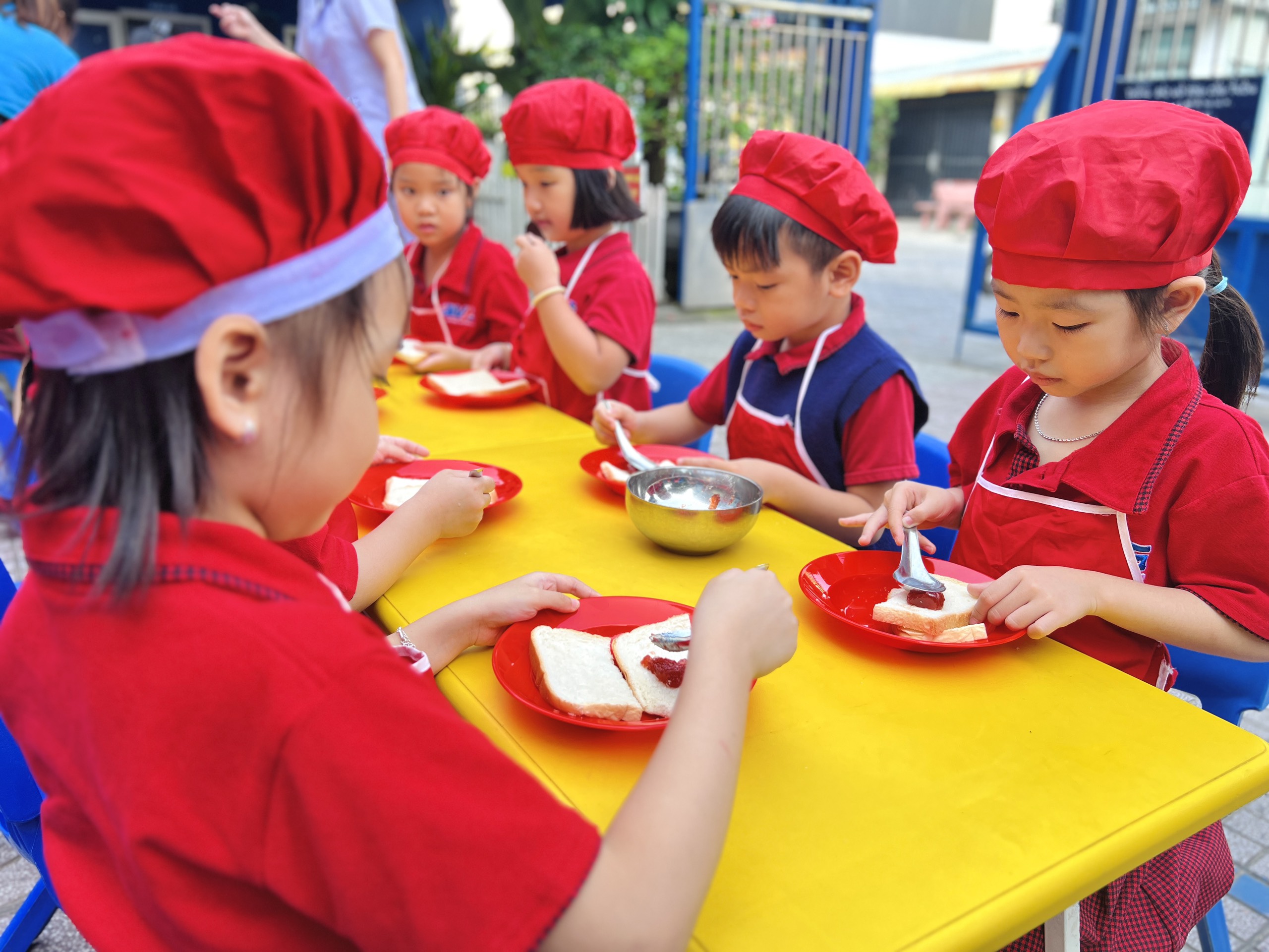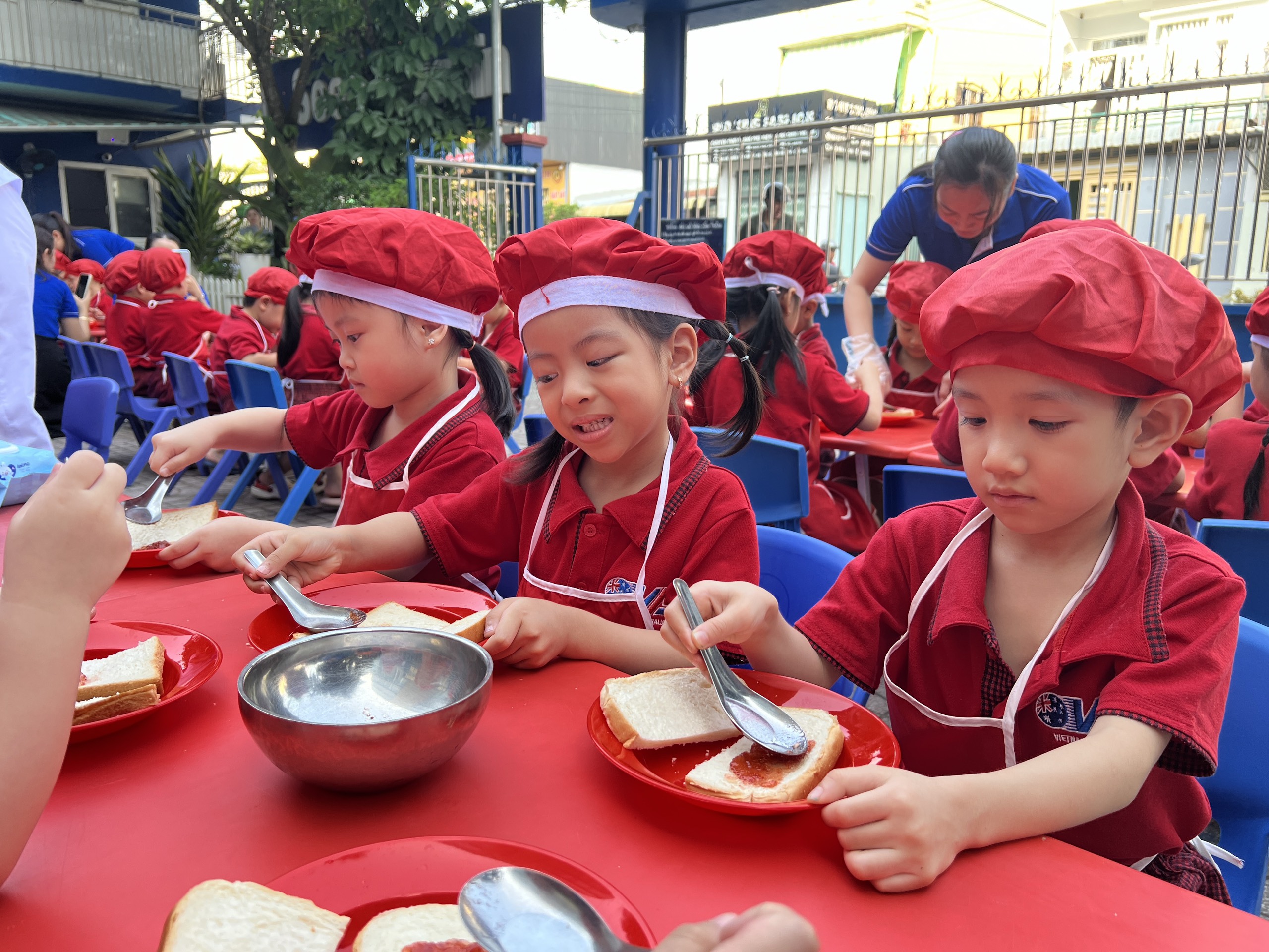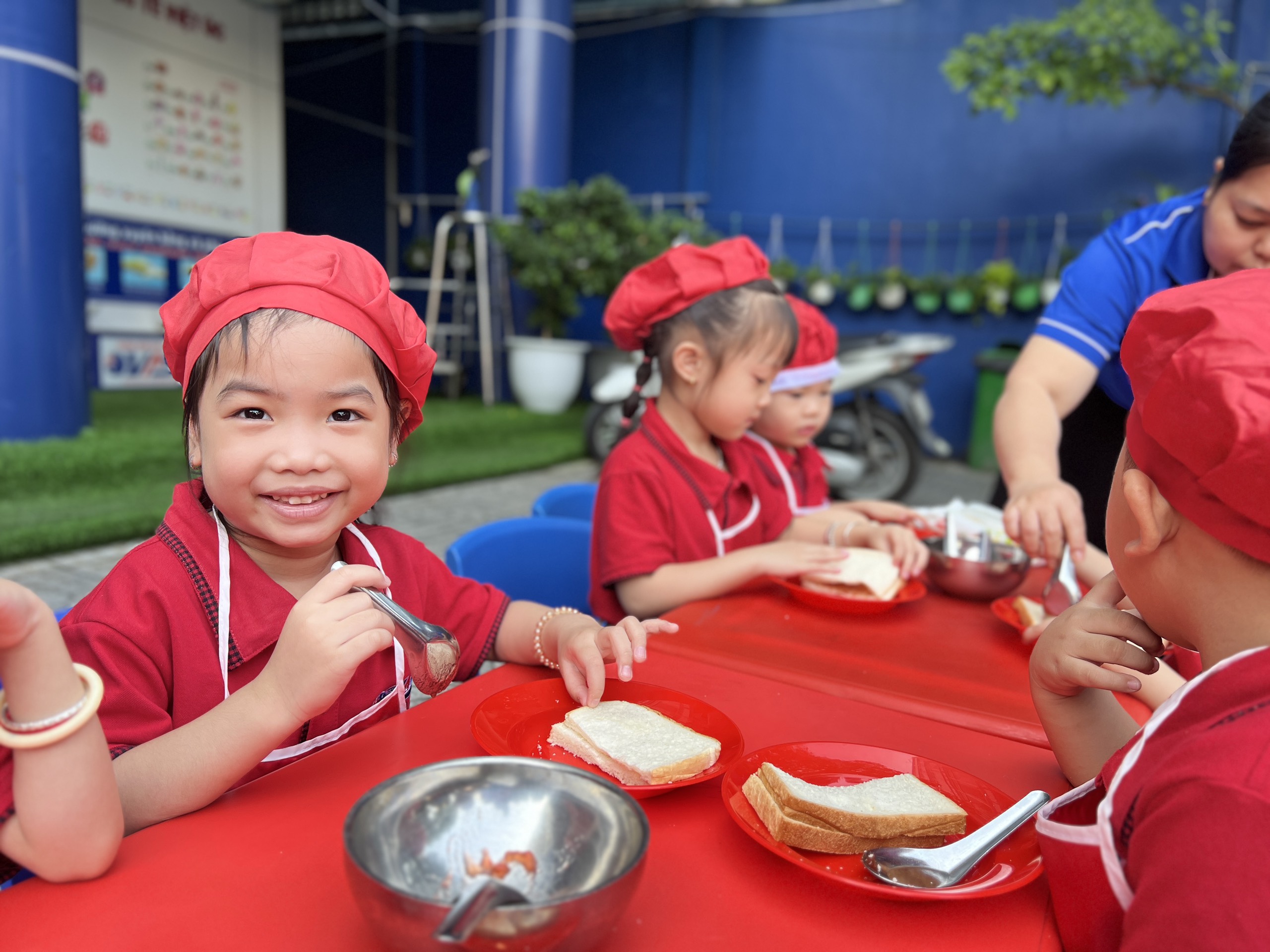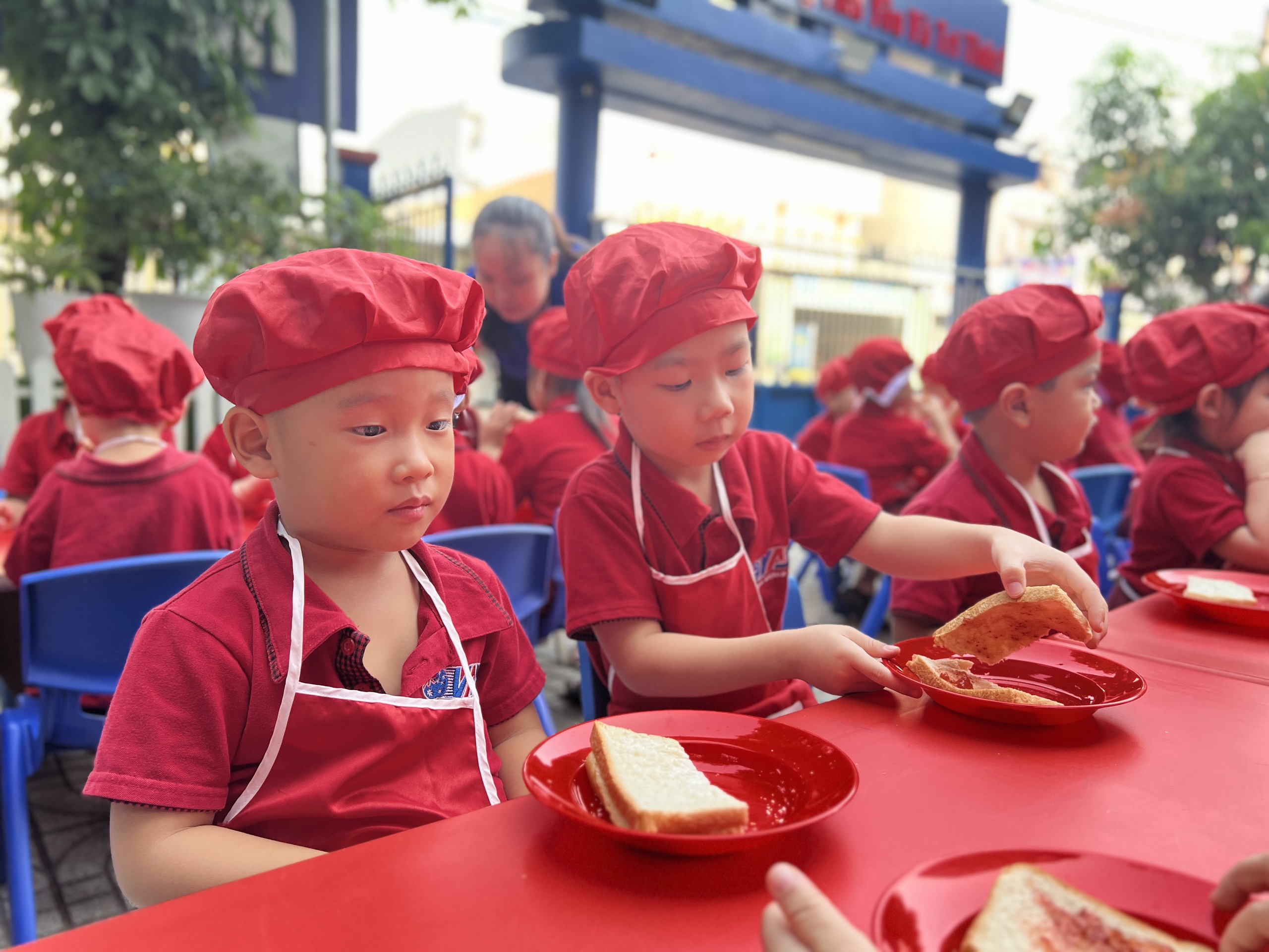Một buổi trải nghiệm vô cùng thú vị với hoạt động làm bánh mì sandwich phết mứt dâu của các đầu bếp nhí