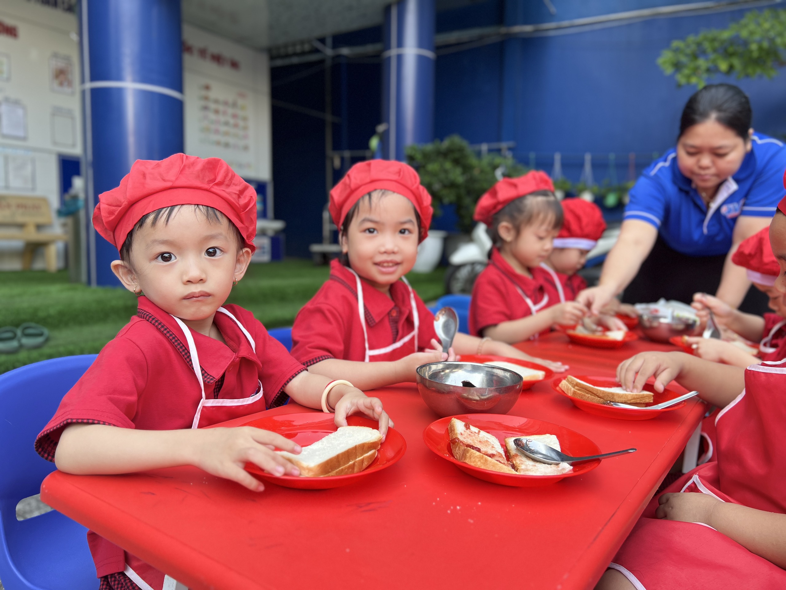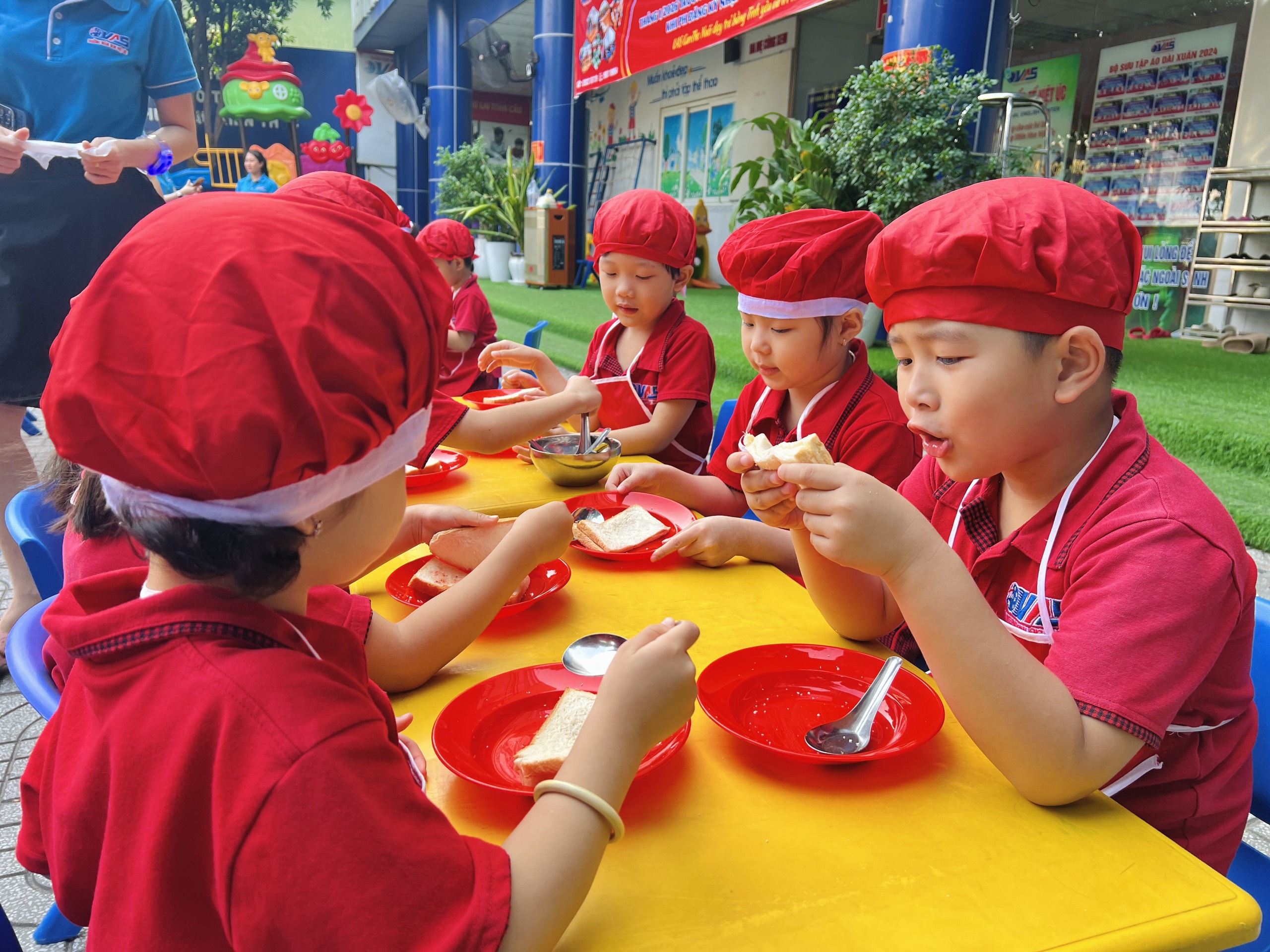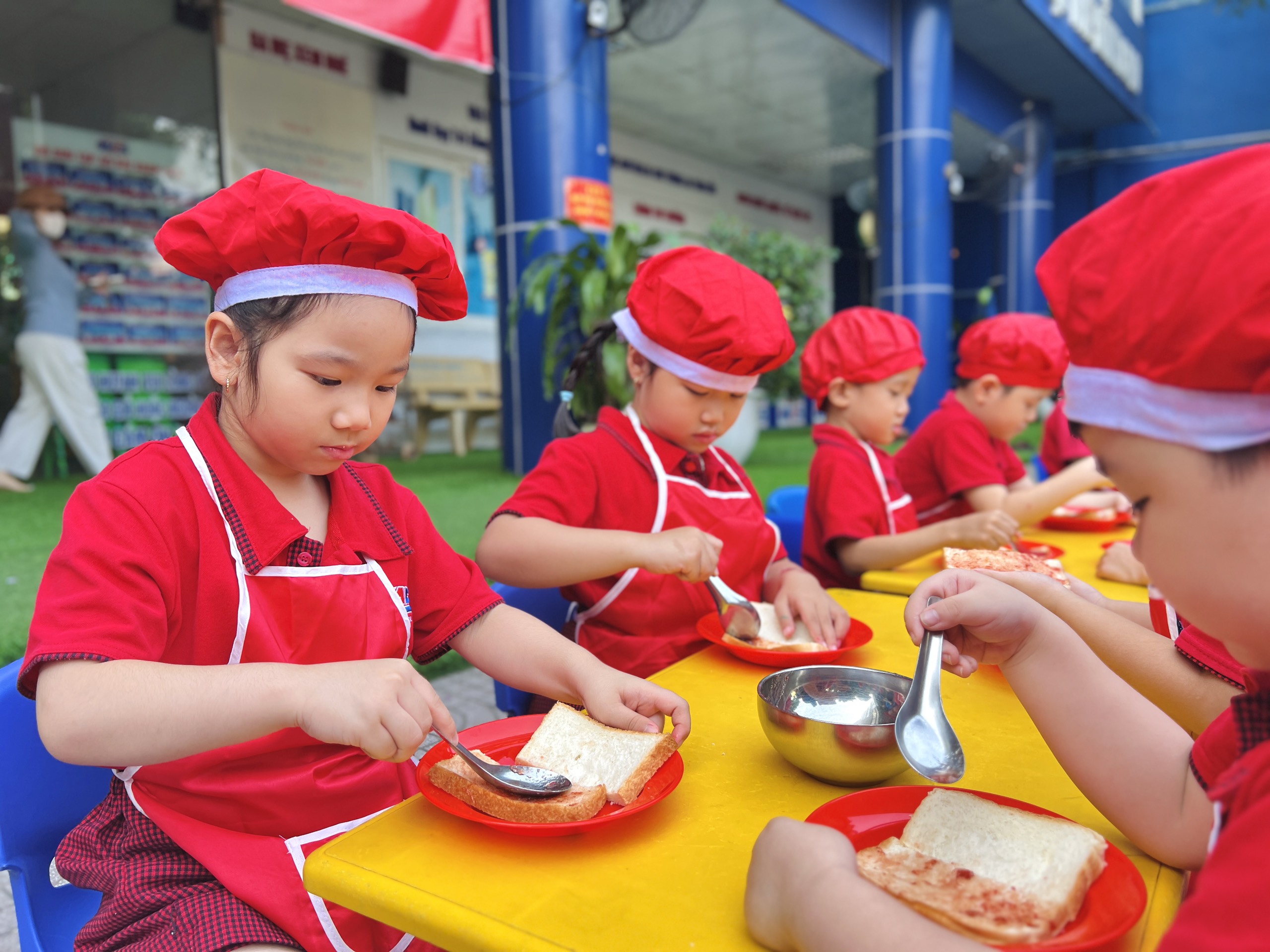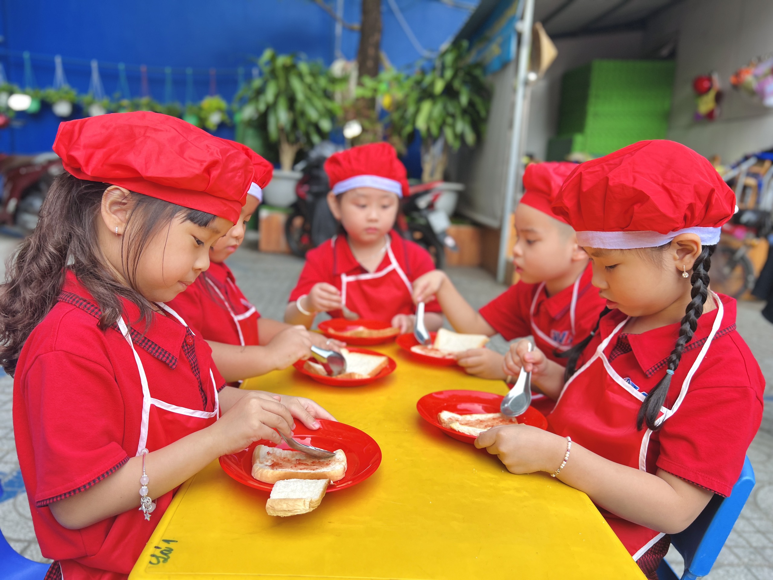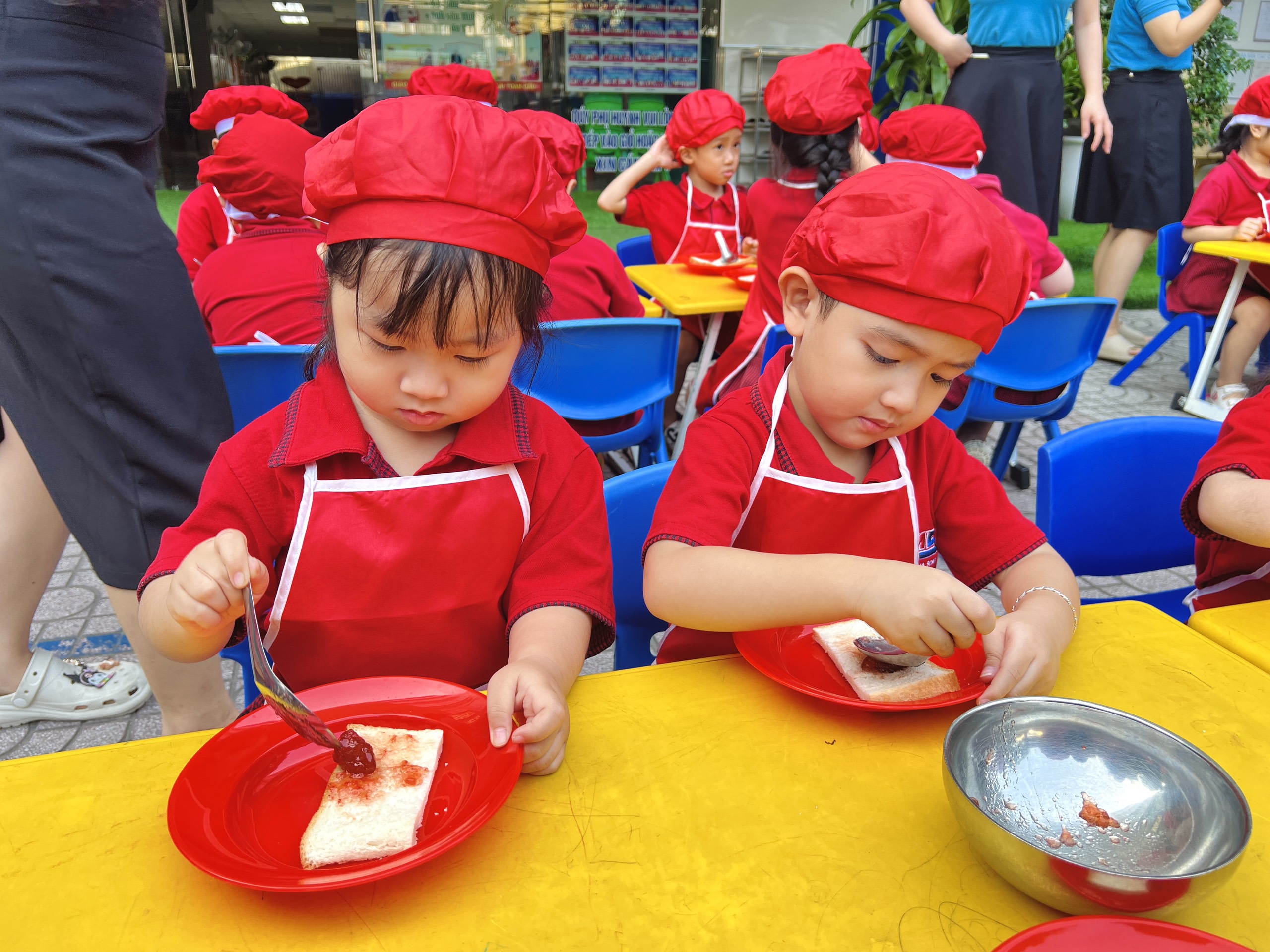 Một buổi trải nghiệm vô cùng thú vị với hoạt động làm bánh mì sandwich phết mứt dâu của các đầu bếp nhí
