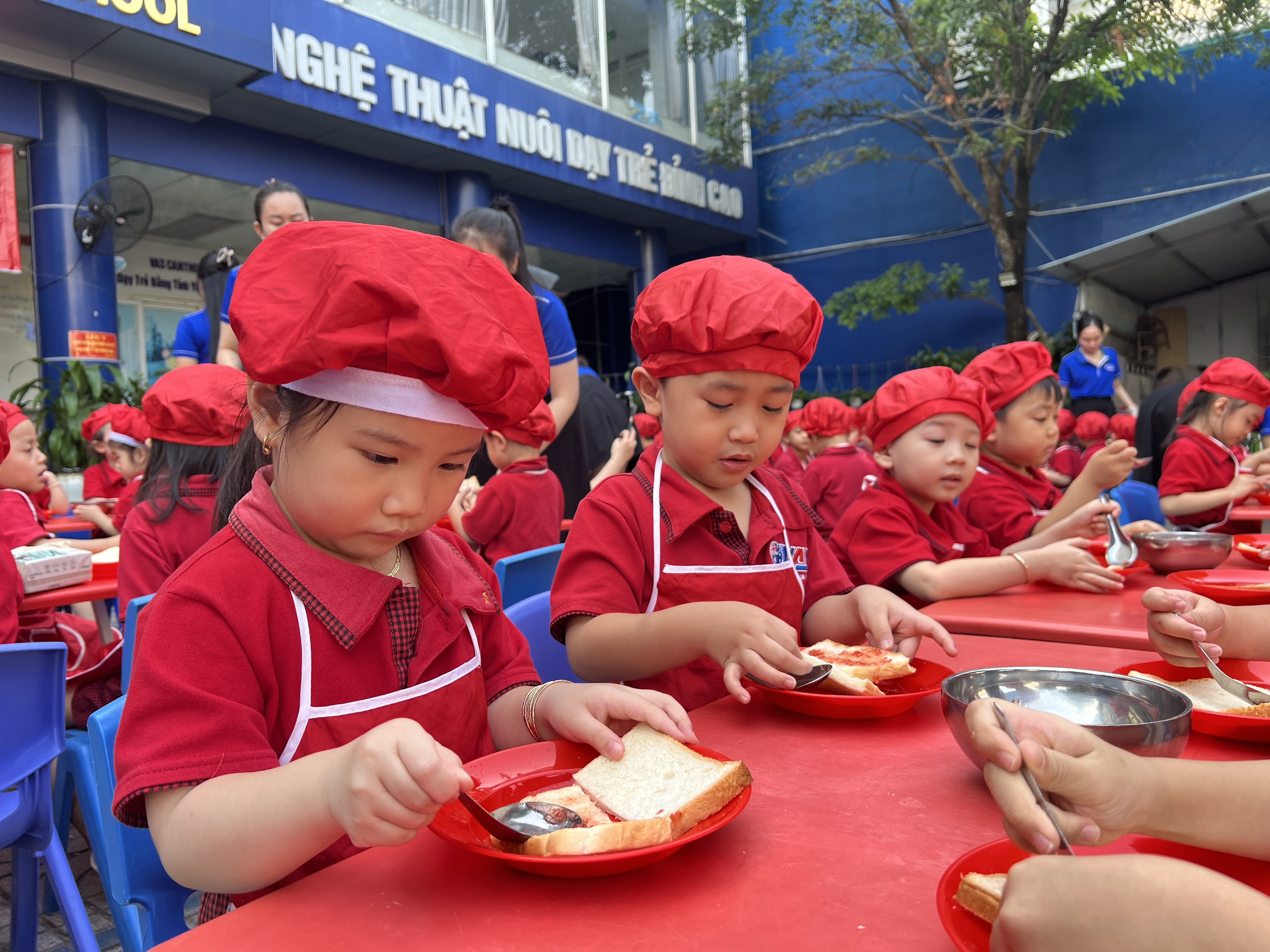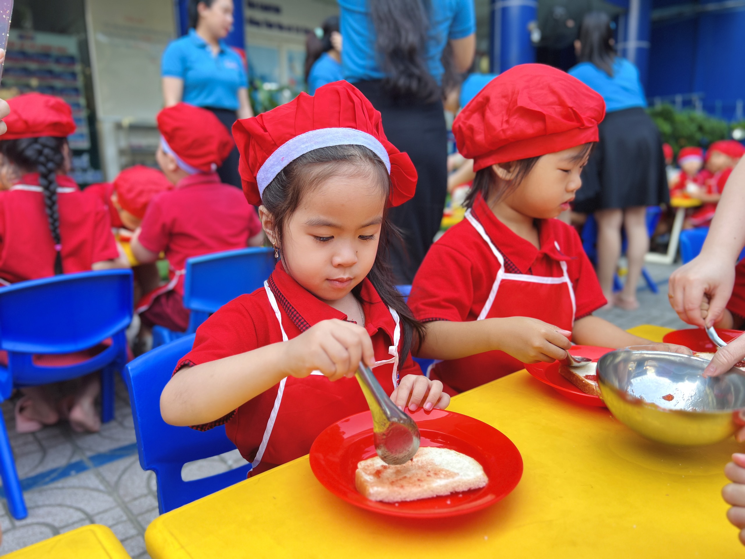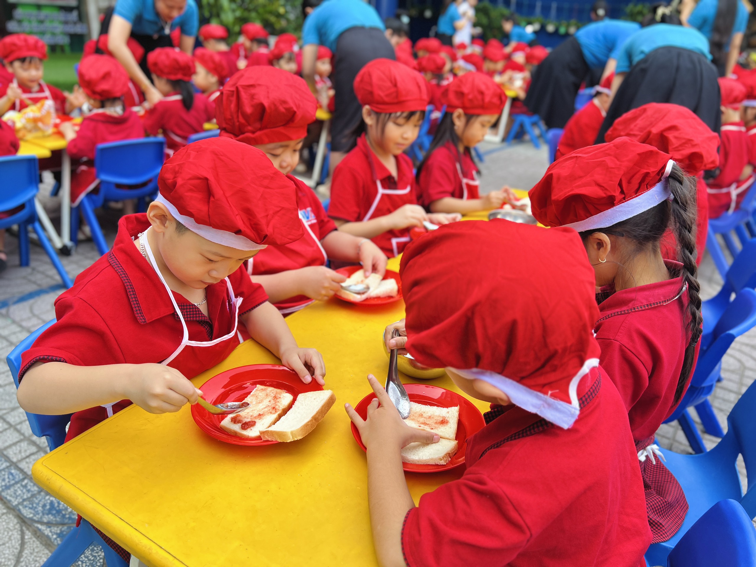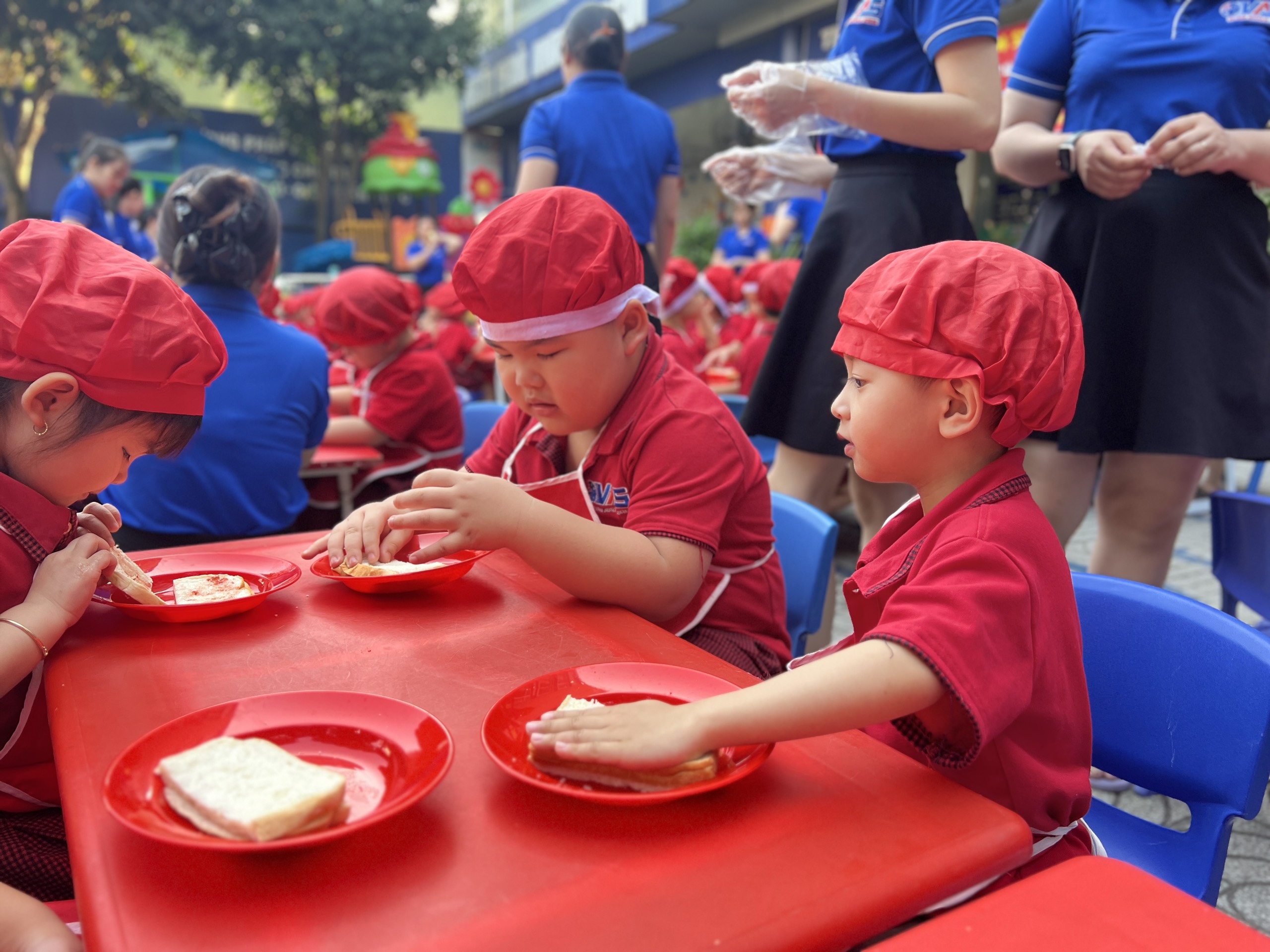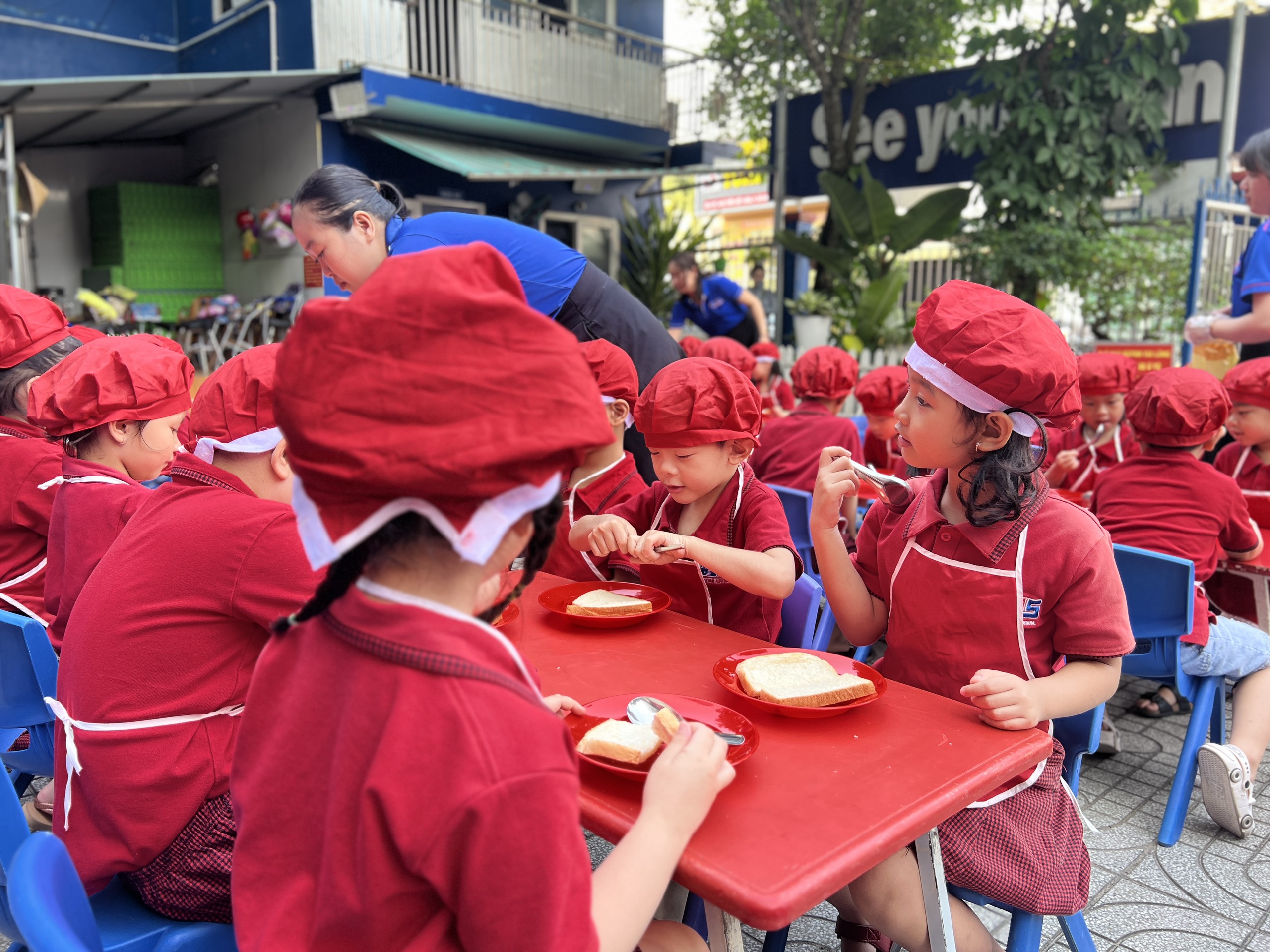 Một buổi trải nghiệm vô cùng thú vị với hoạt động làm bánh mì sandwich phết mứt dâu của các đầu bếp nhí