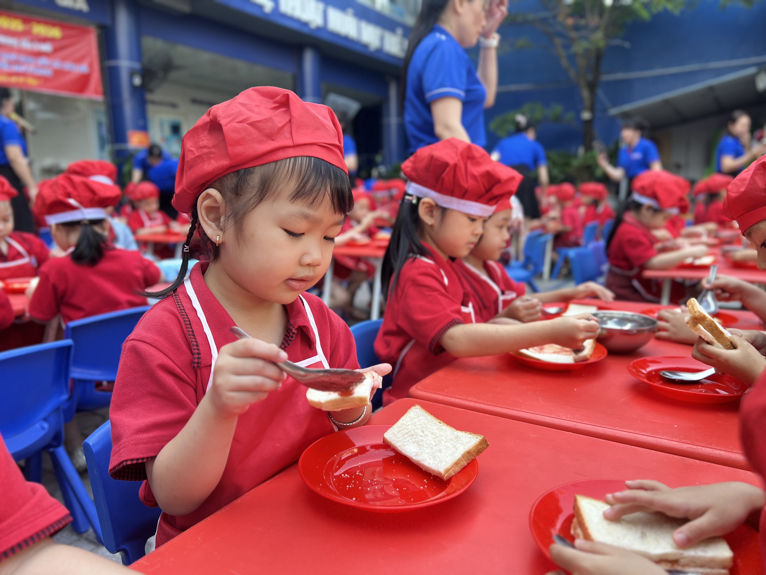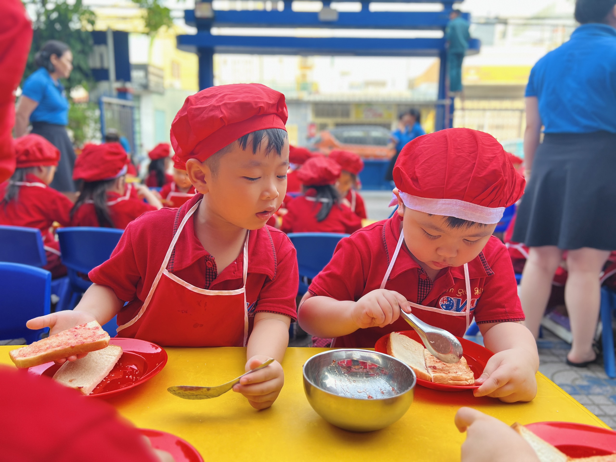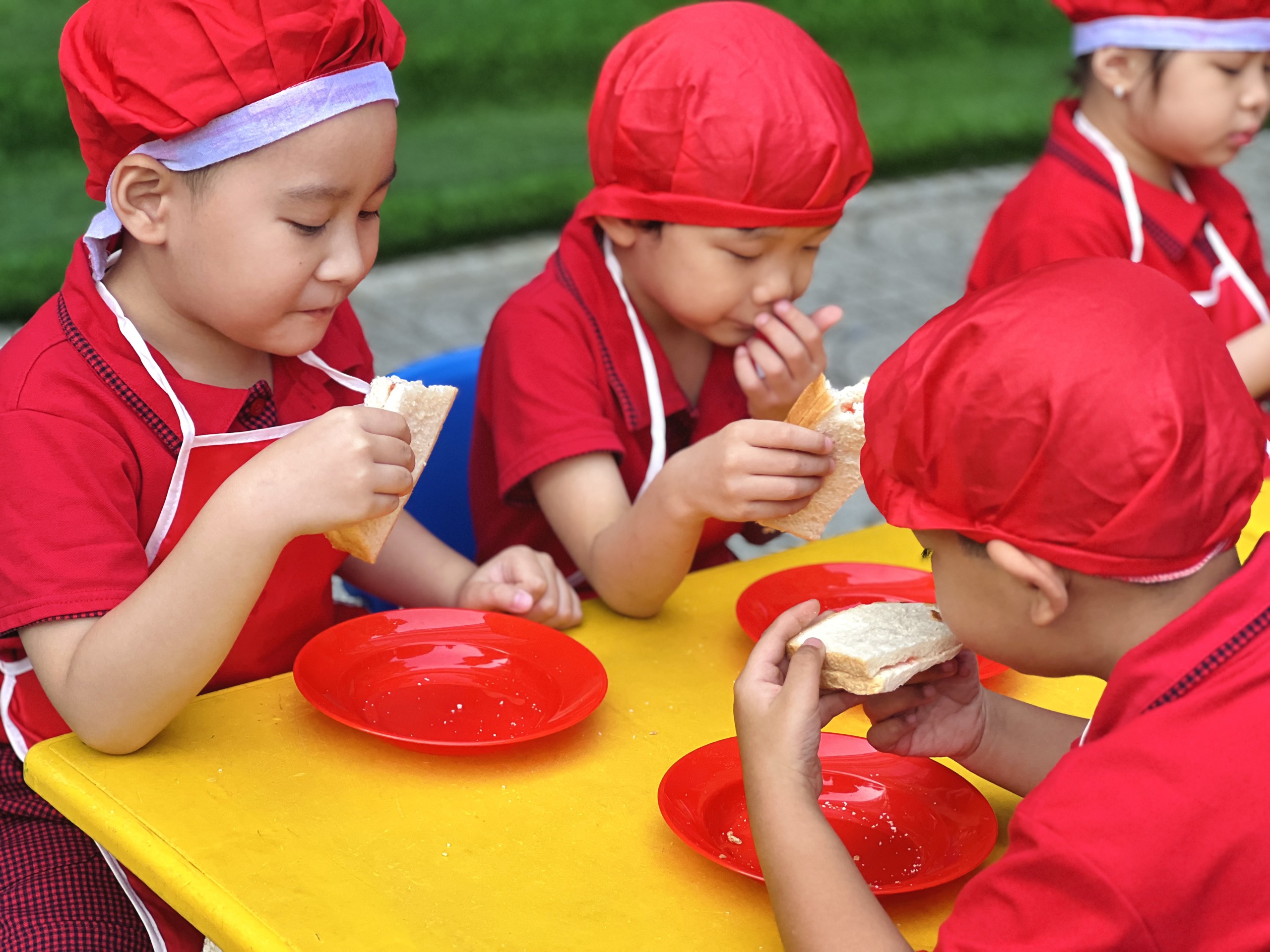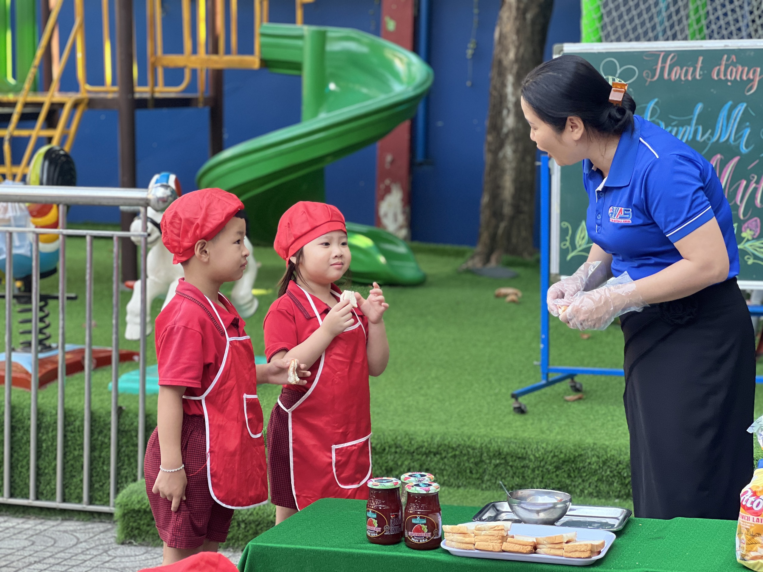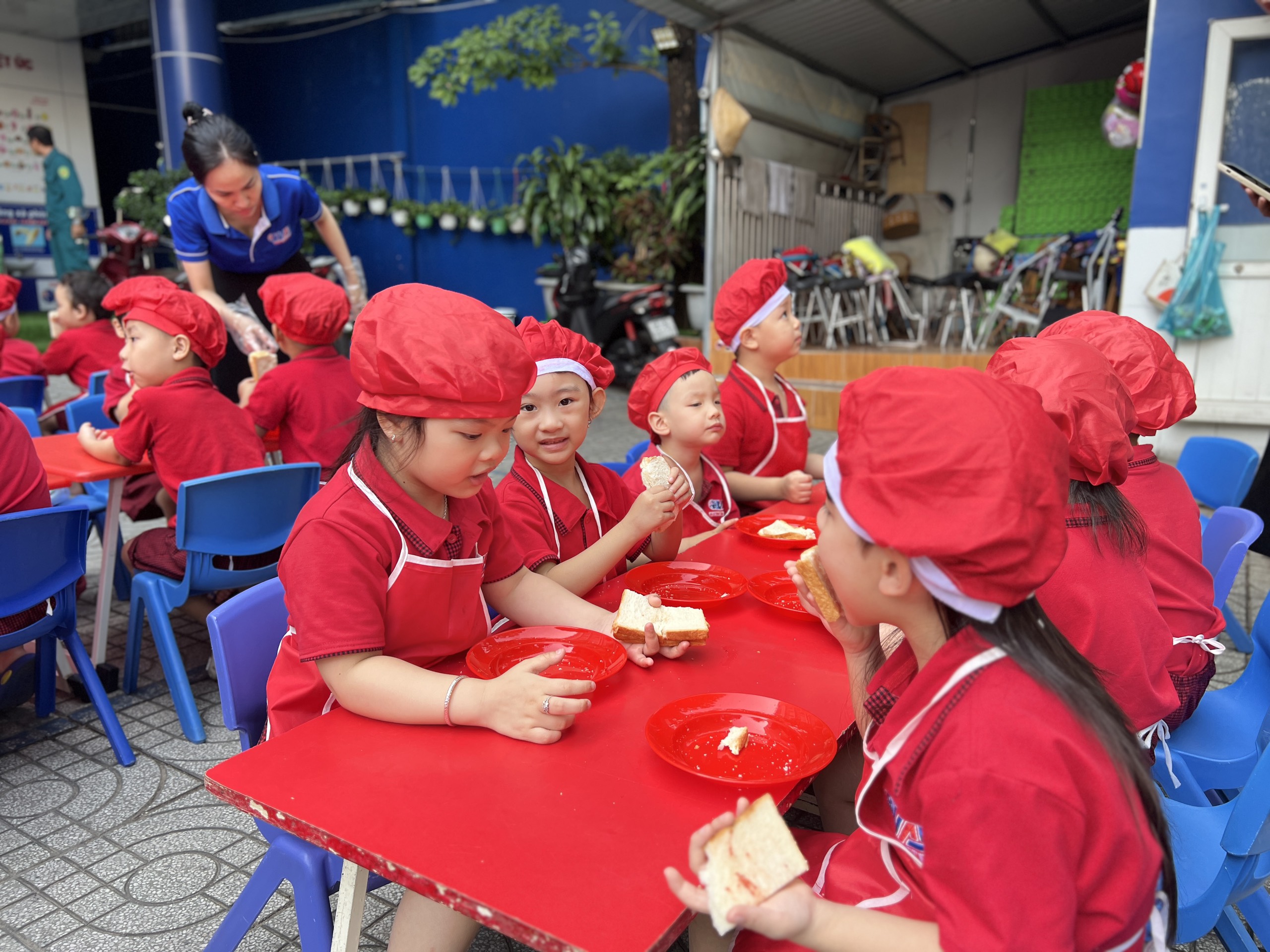 Một buổi trải nghiệm vô cùng thú vị với hoạt động làm bánh mì sandwich phết mứt dâu của các đầu bếp nhí