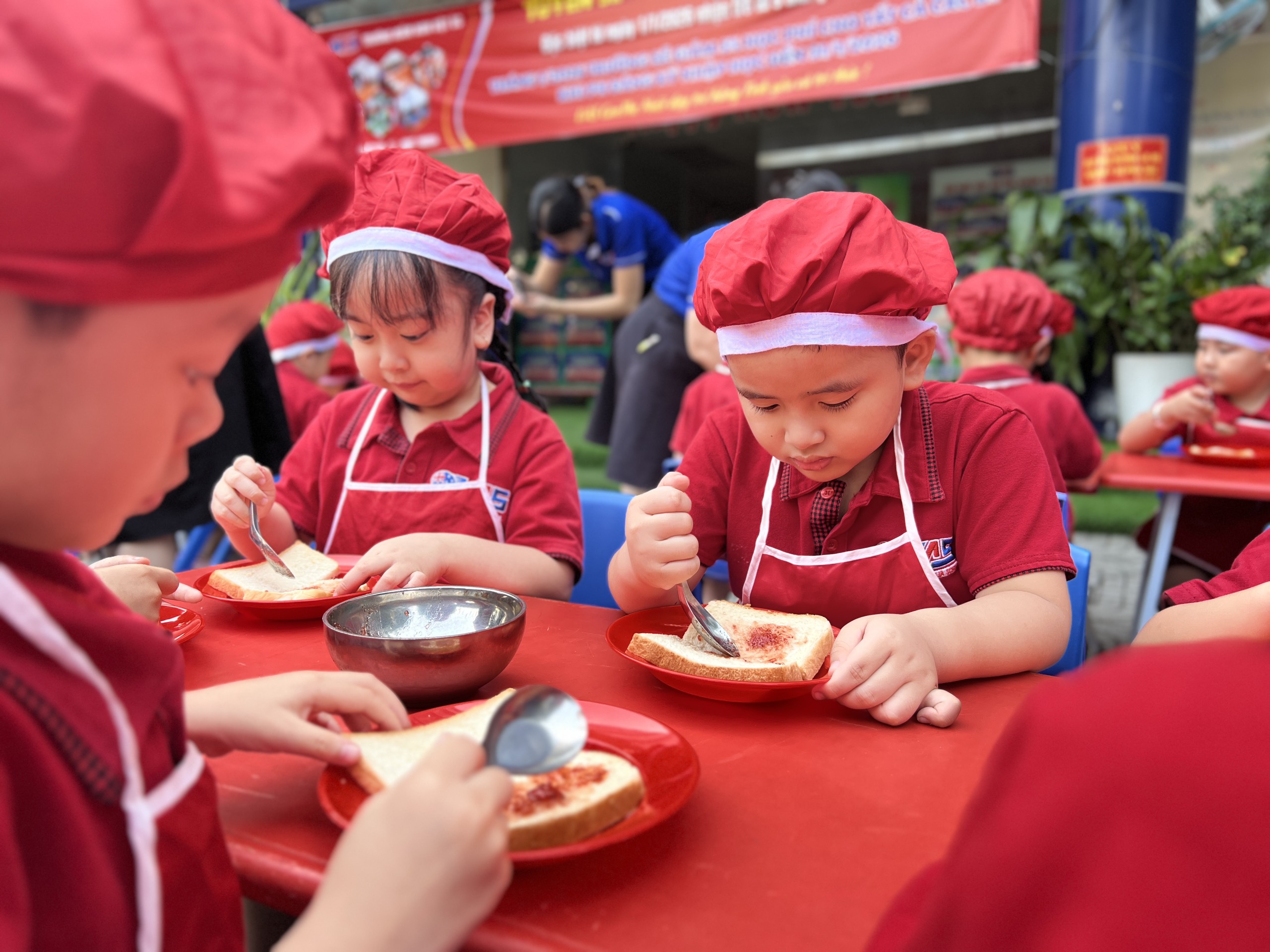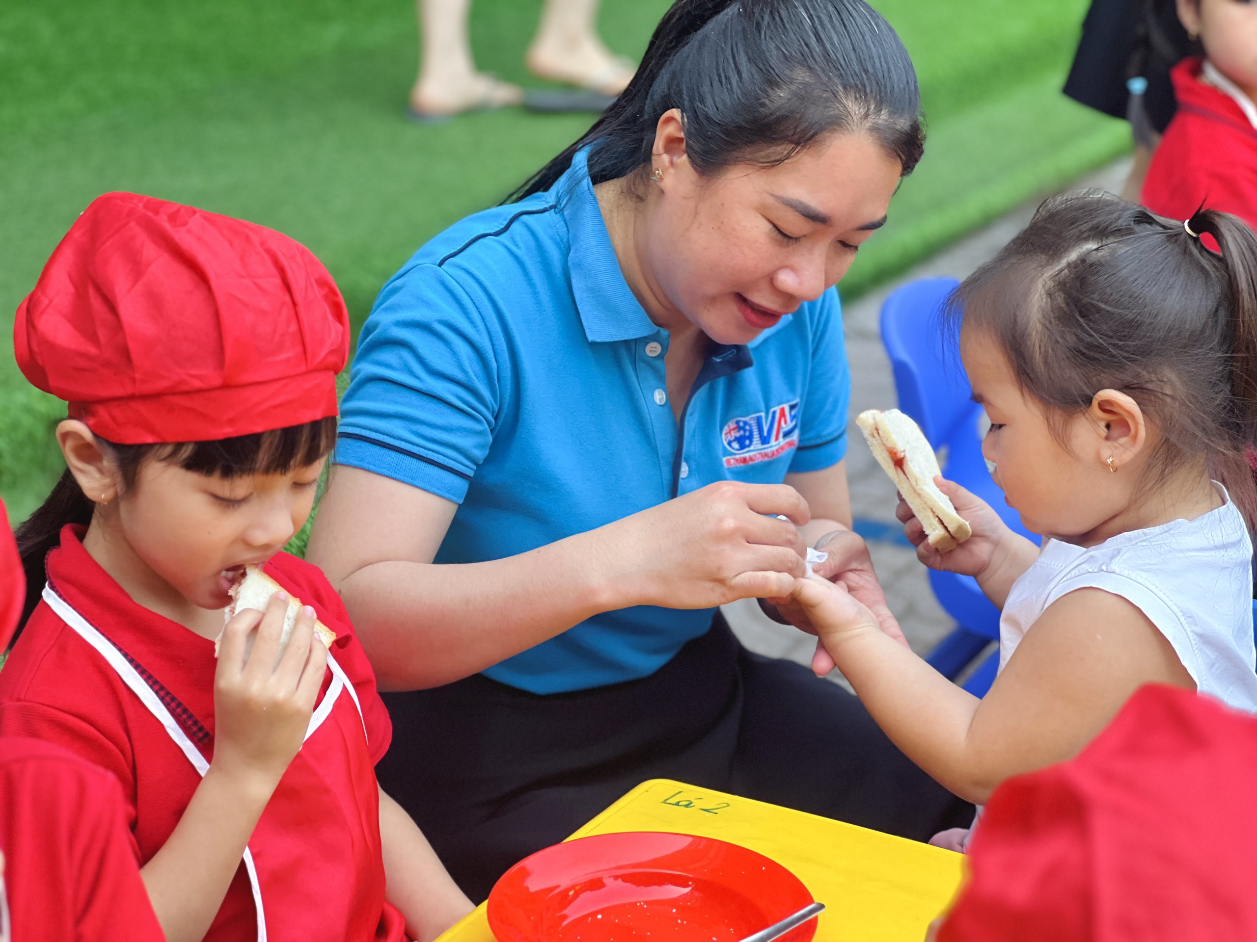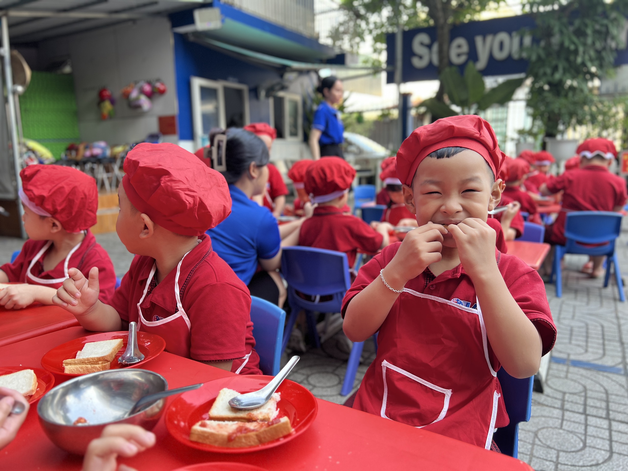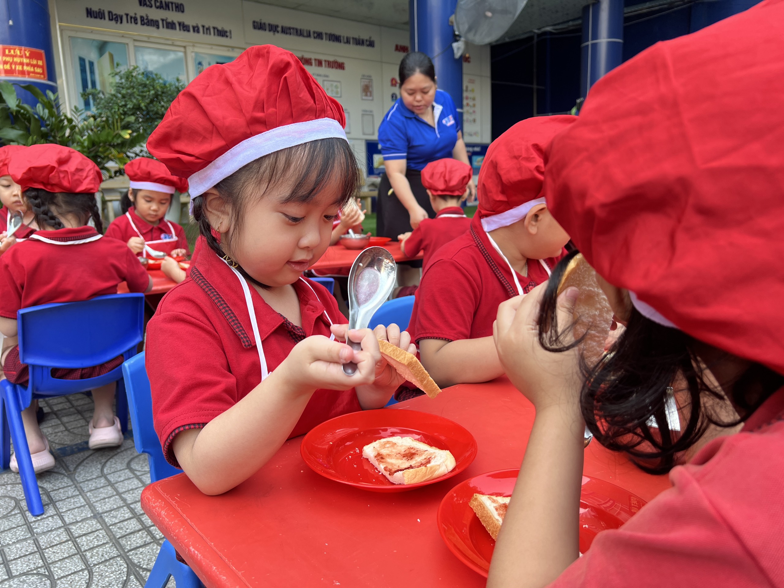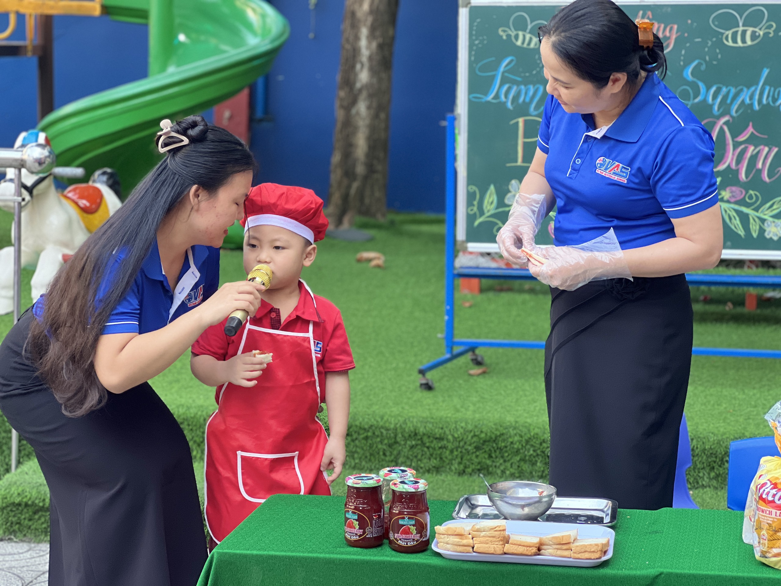Một buổi trải nghiệm vô cùng thú vị với hoạt động làm bánh mì sandwich phết mứt dâu của các đầu bếp nhí