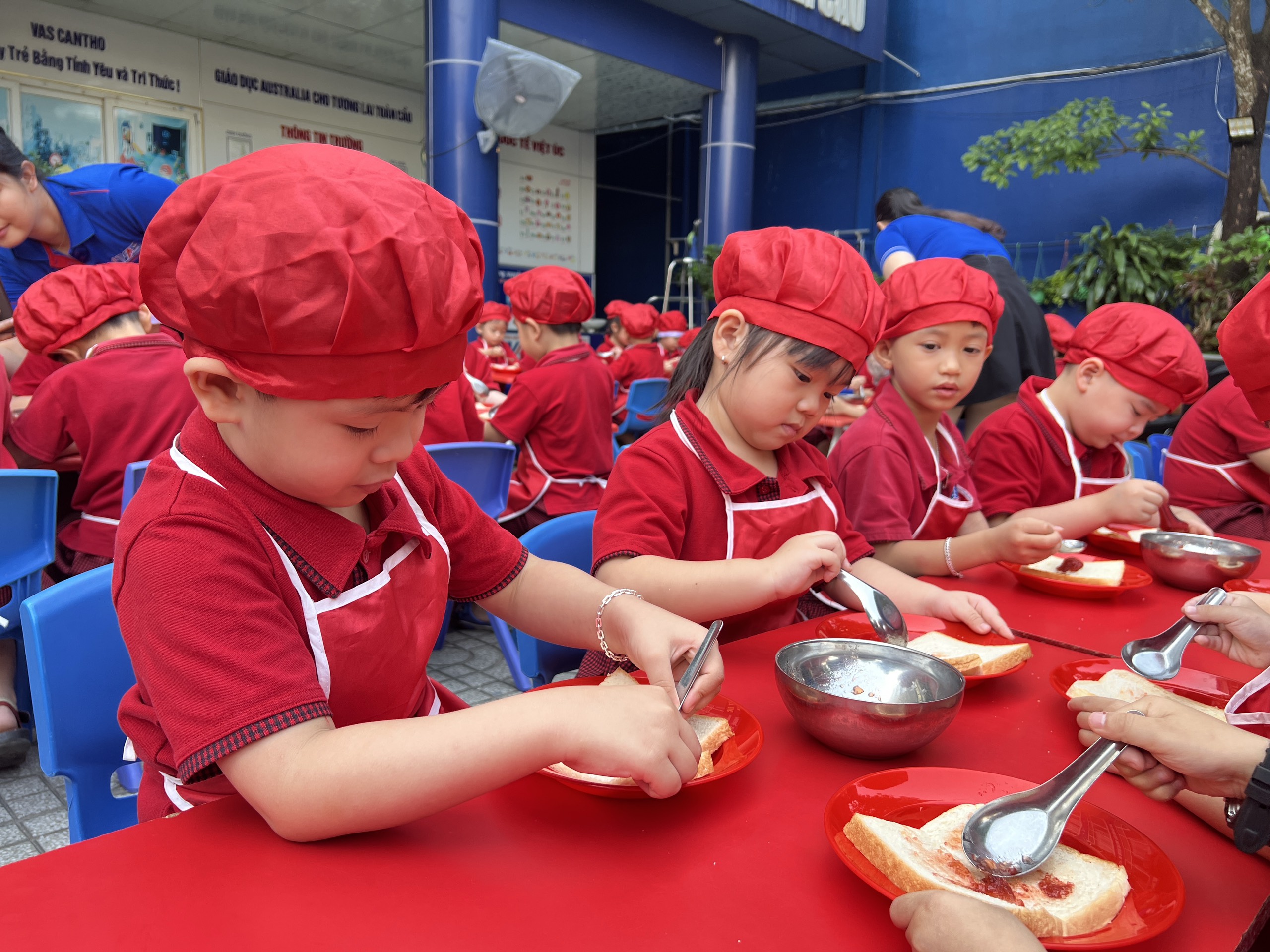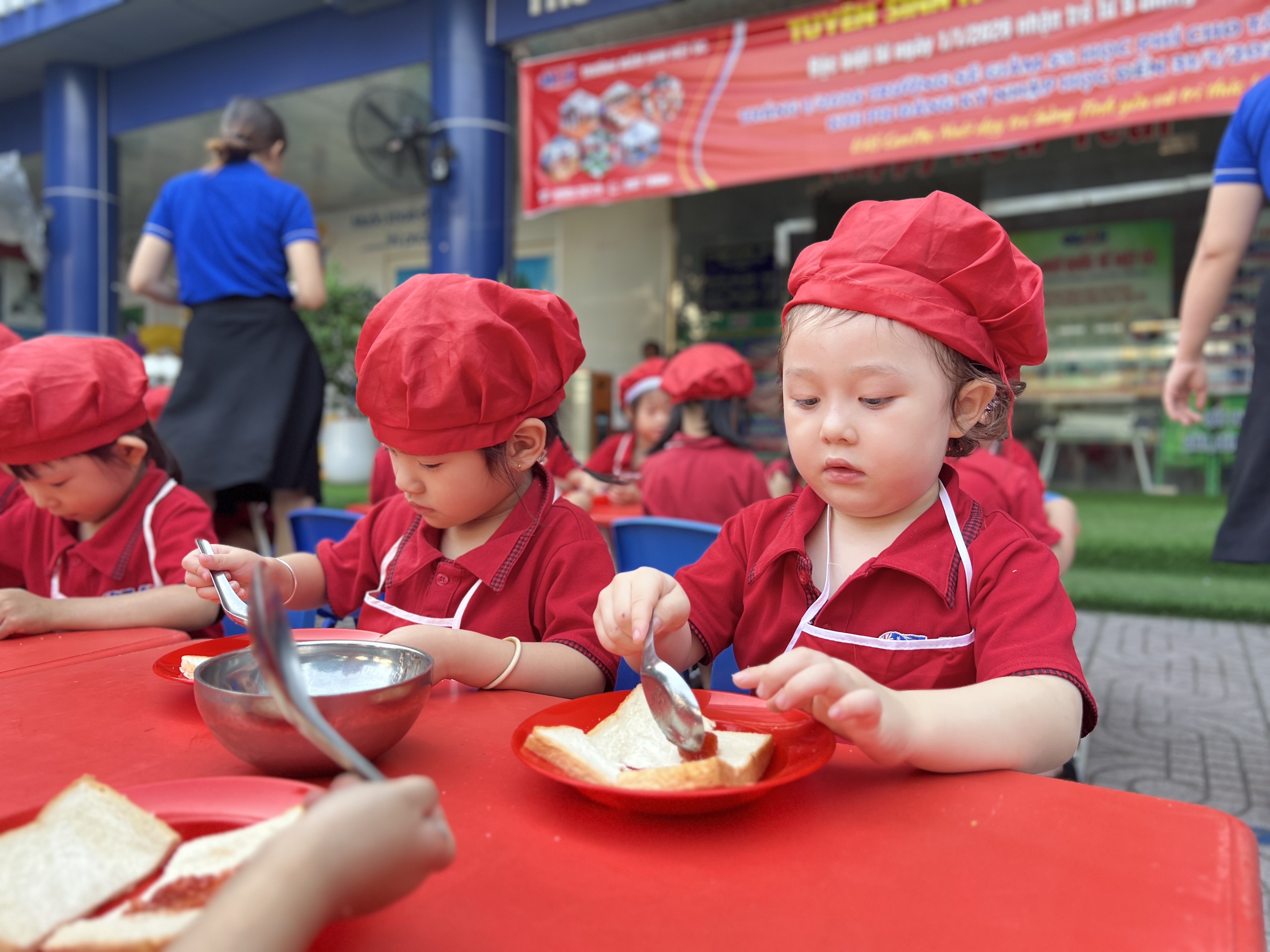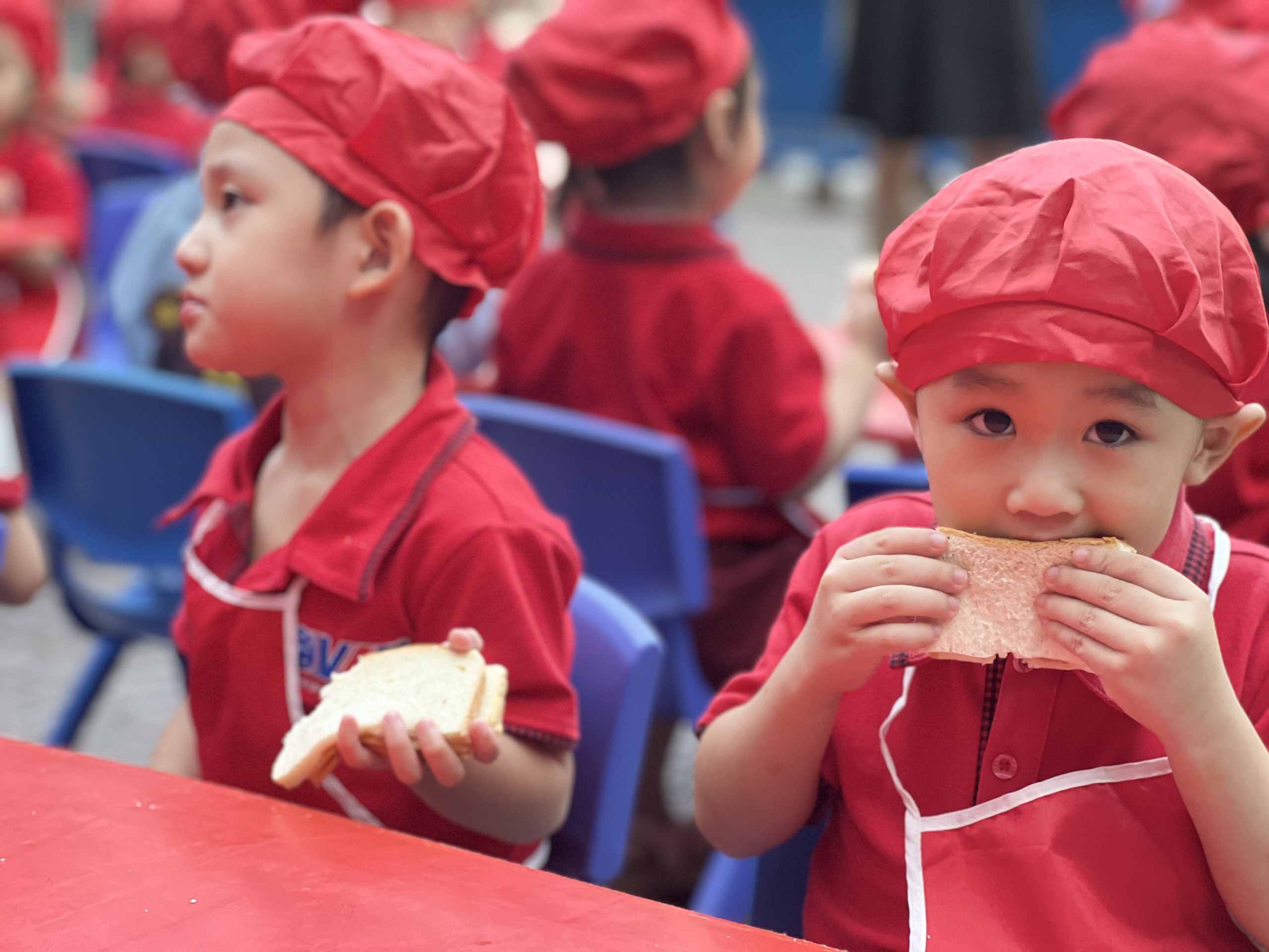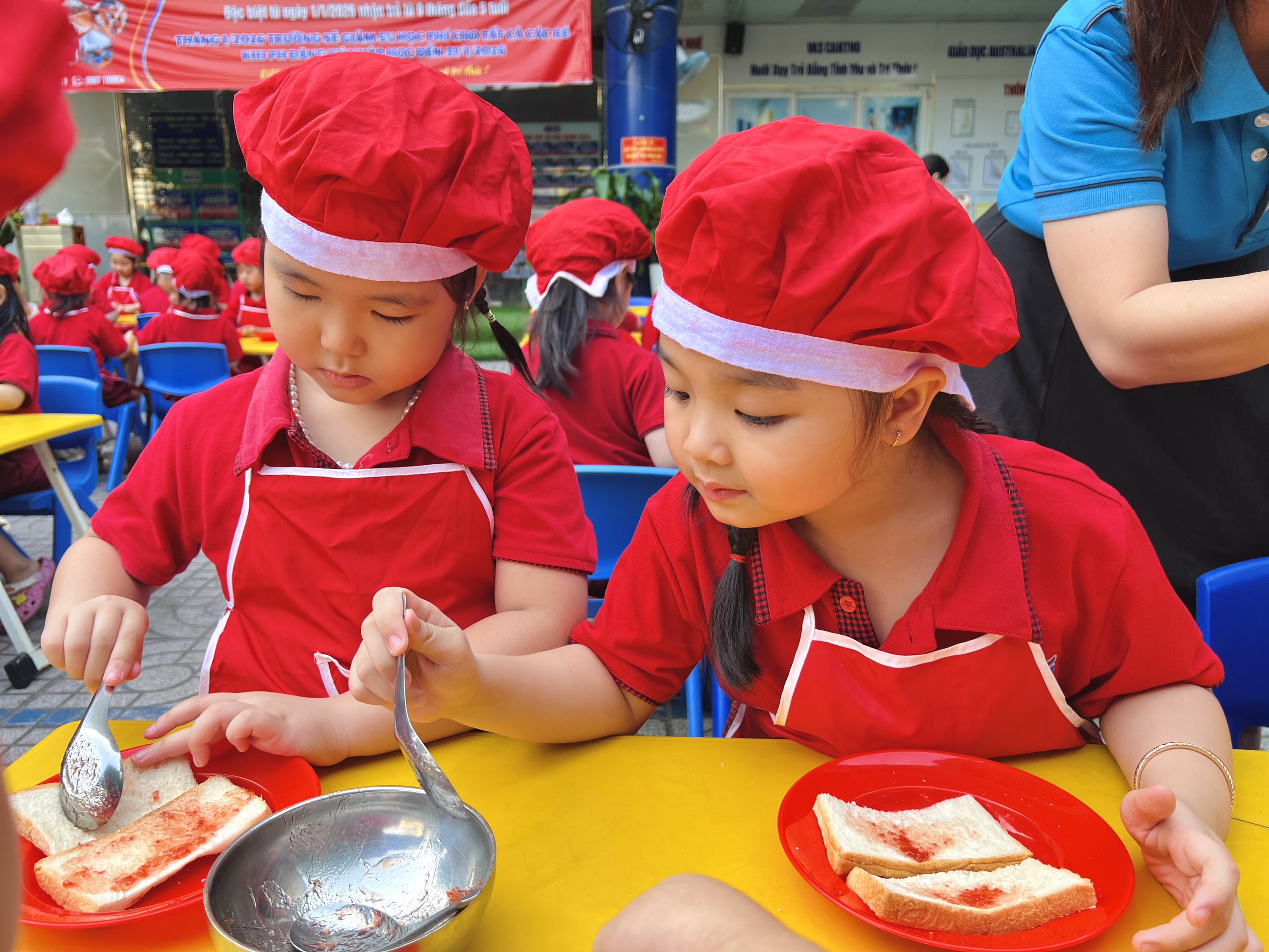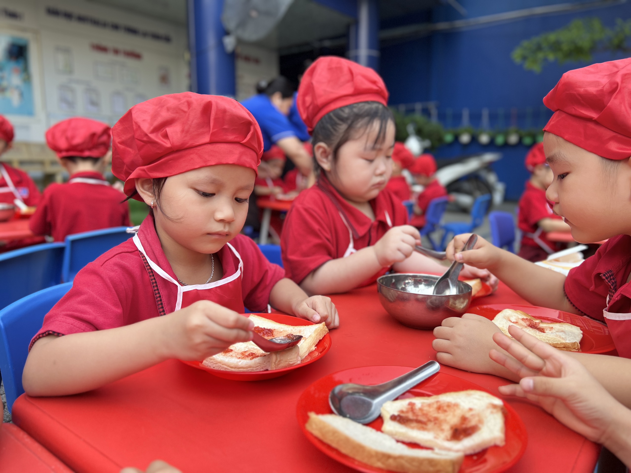 Một buổi trải nghiệm vô cùng thú vị với hoạt động làm bánh mì sandwich phết mứt dâu của các đầu bếp nhí