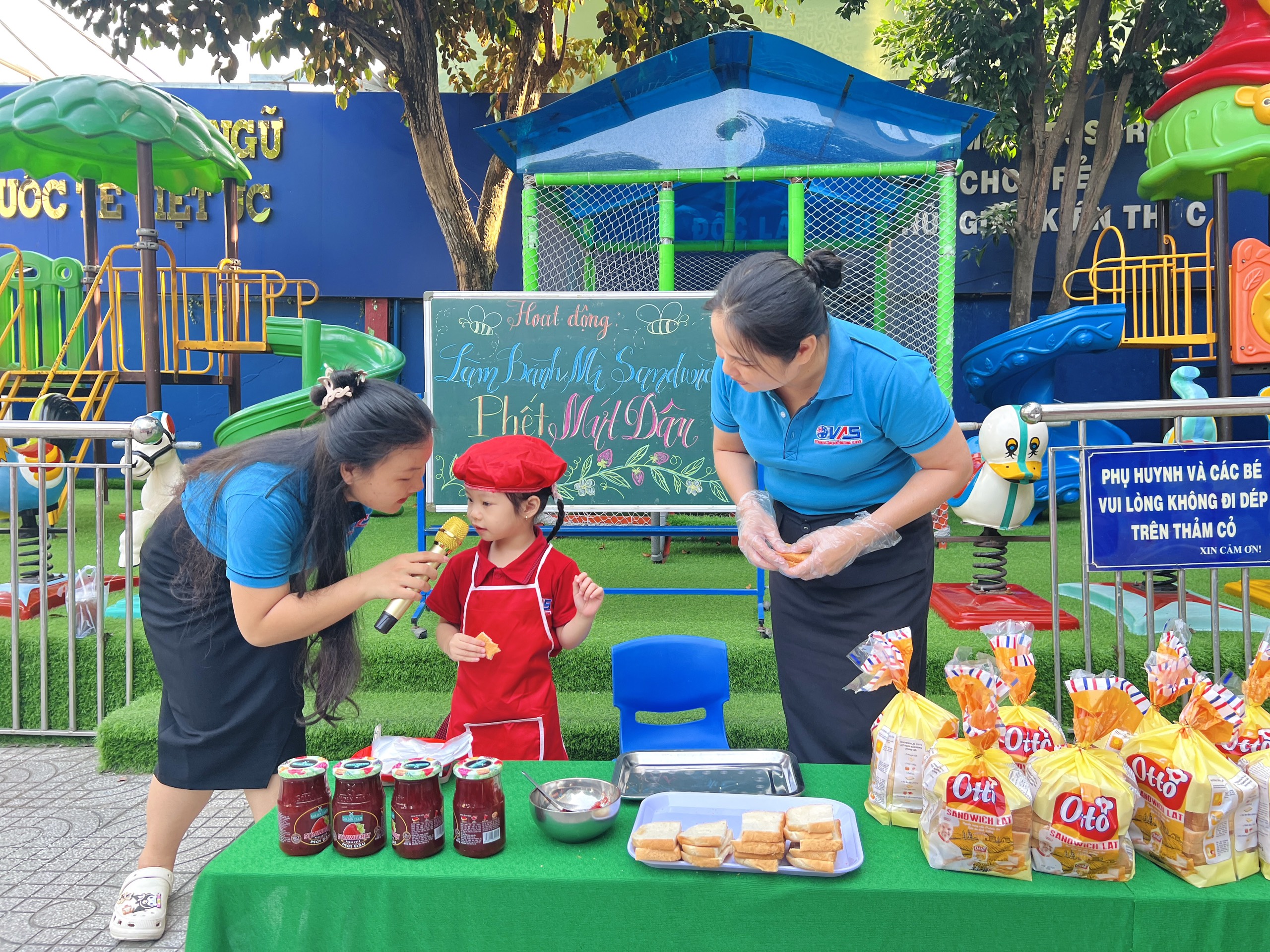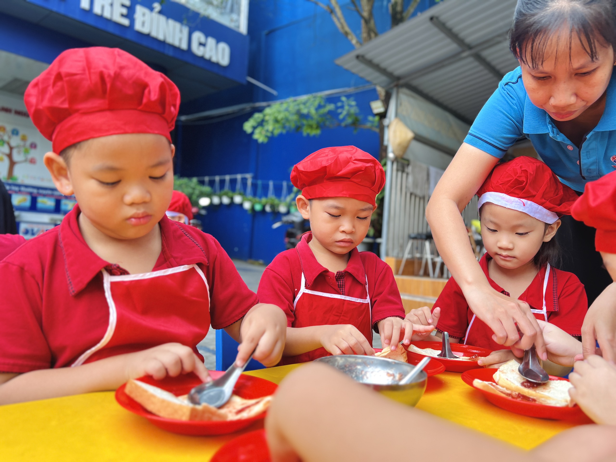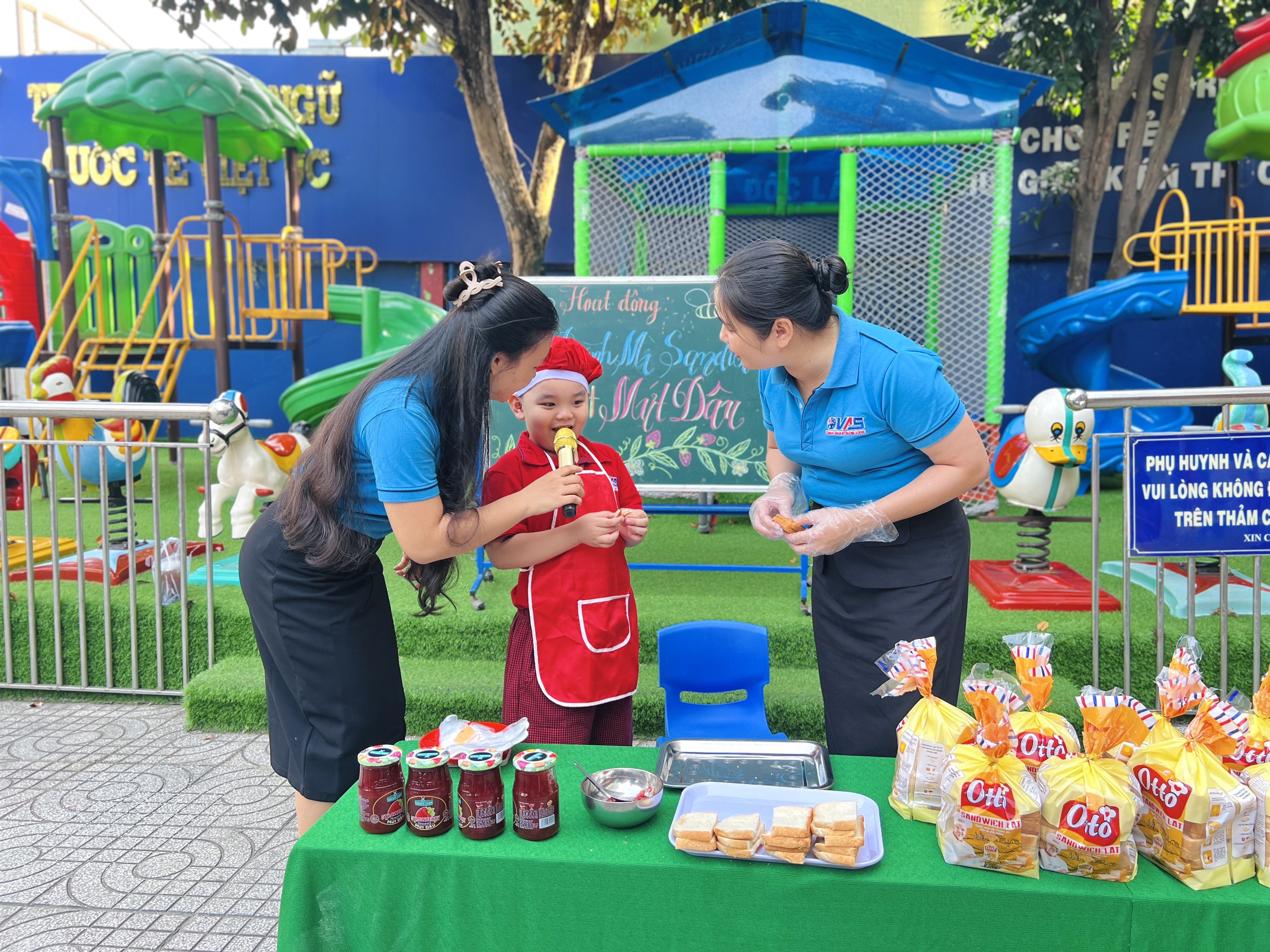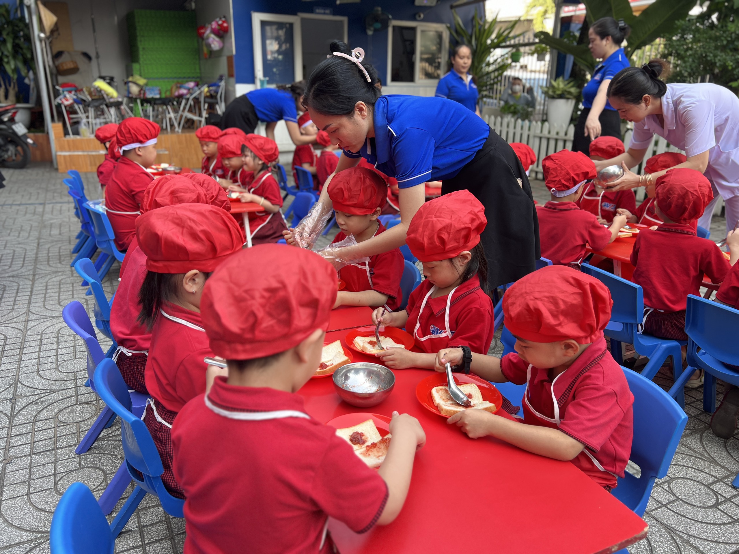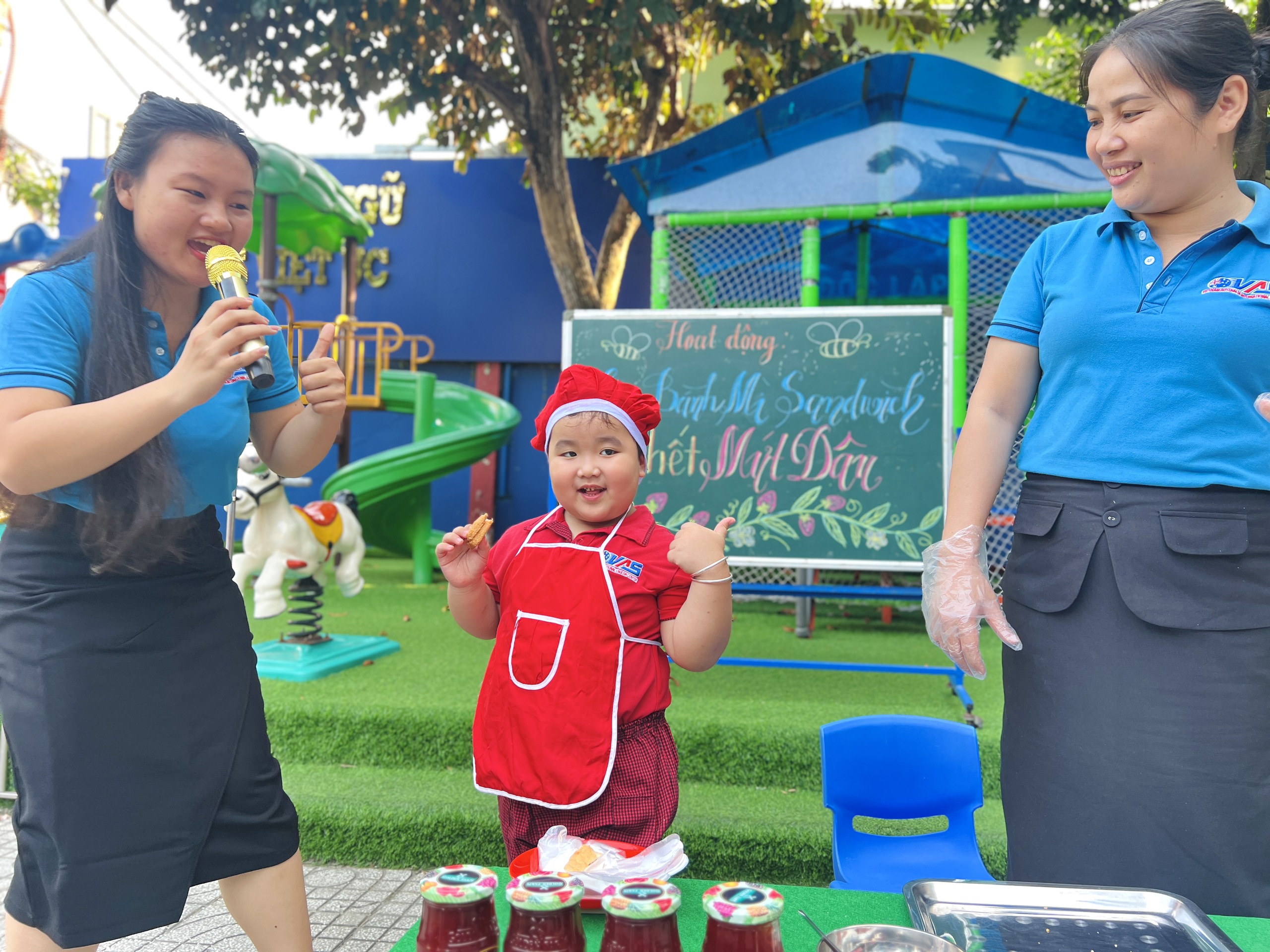 Một buổi trải nghiệm vô cùng thú vị với hoạt động làm bánh mì sandwich phết mứt dâu của các đầu bếp nhí