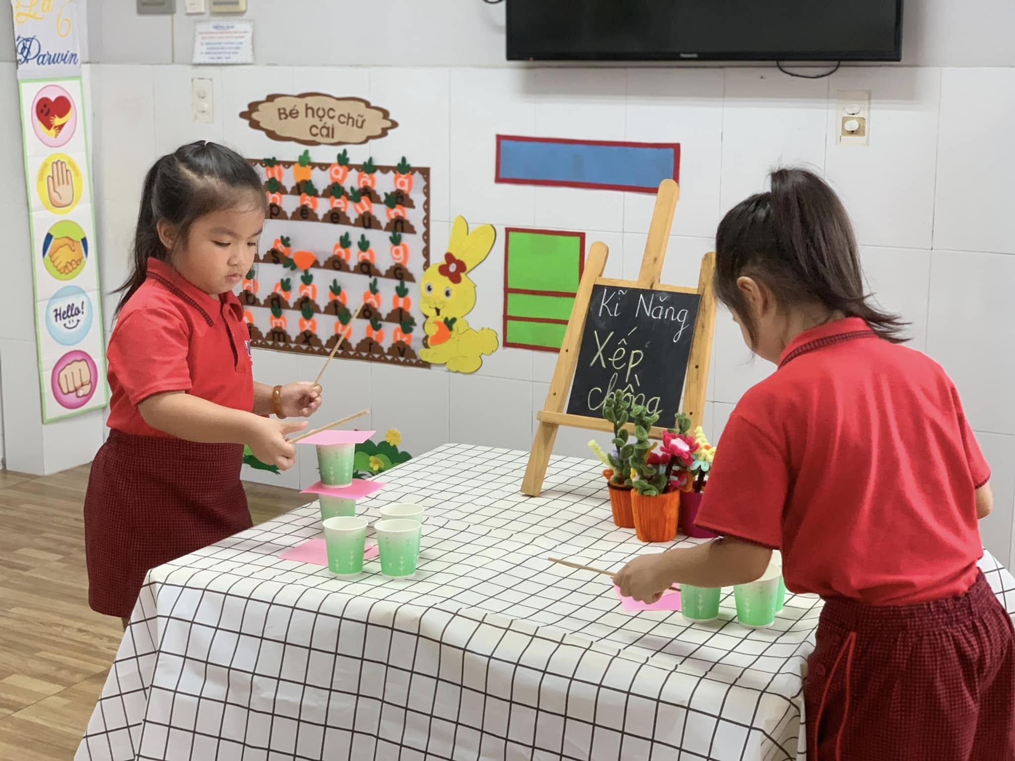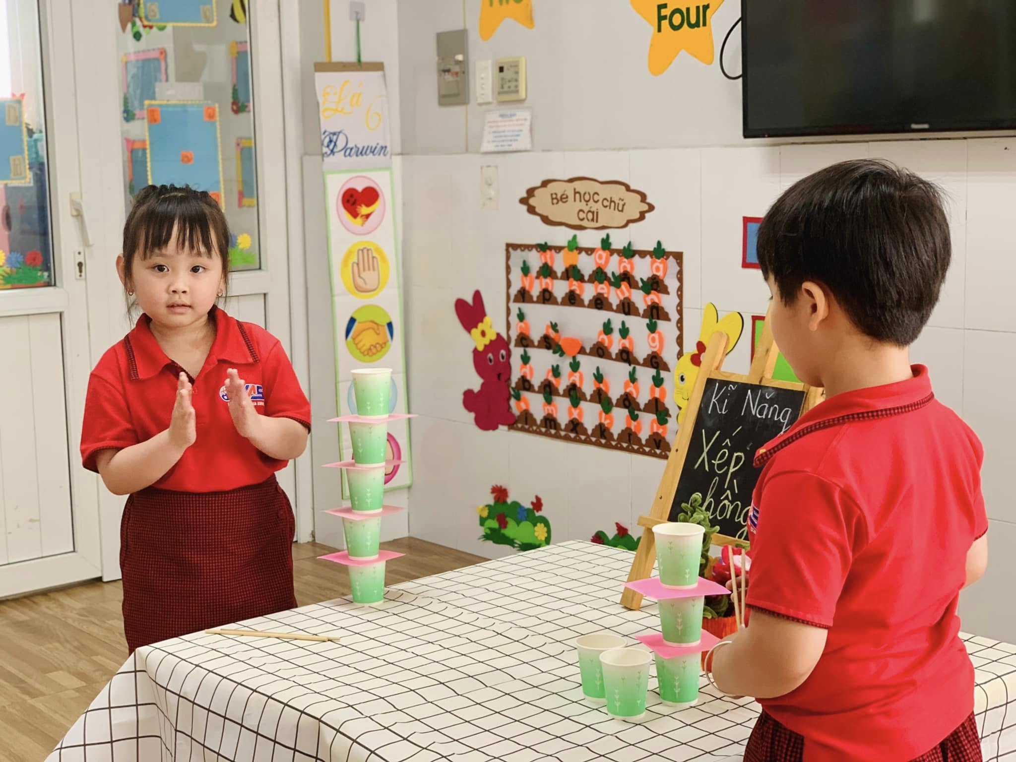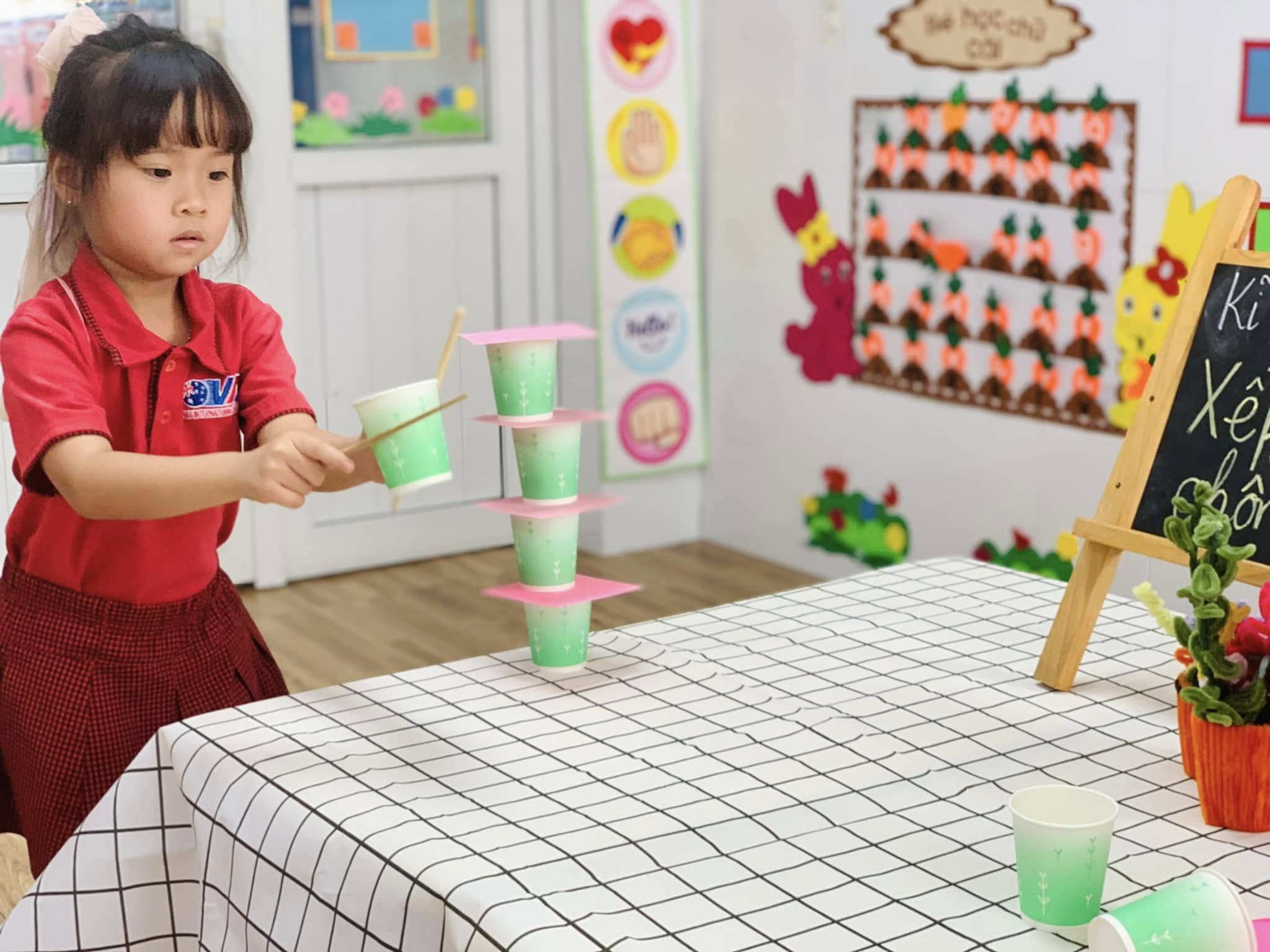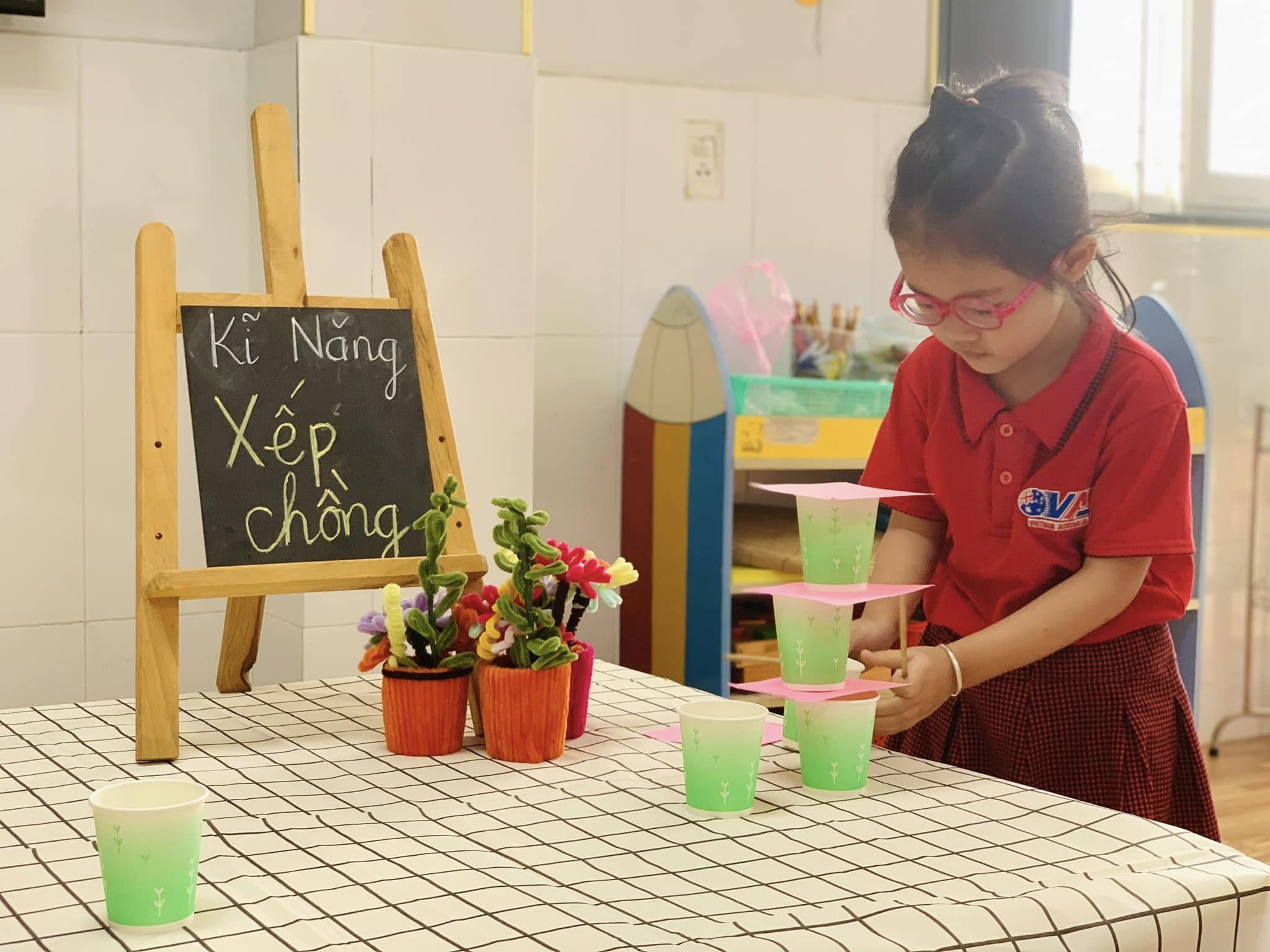 Với những chiếc ly đầy màu sắc, các bé hào hứng thử sức, từng bước cẩn thận xếp lên nhau để tạo thành những tòa tháp “mini” thật vững chắc.