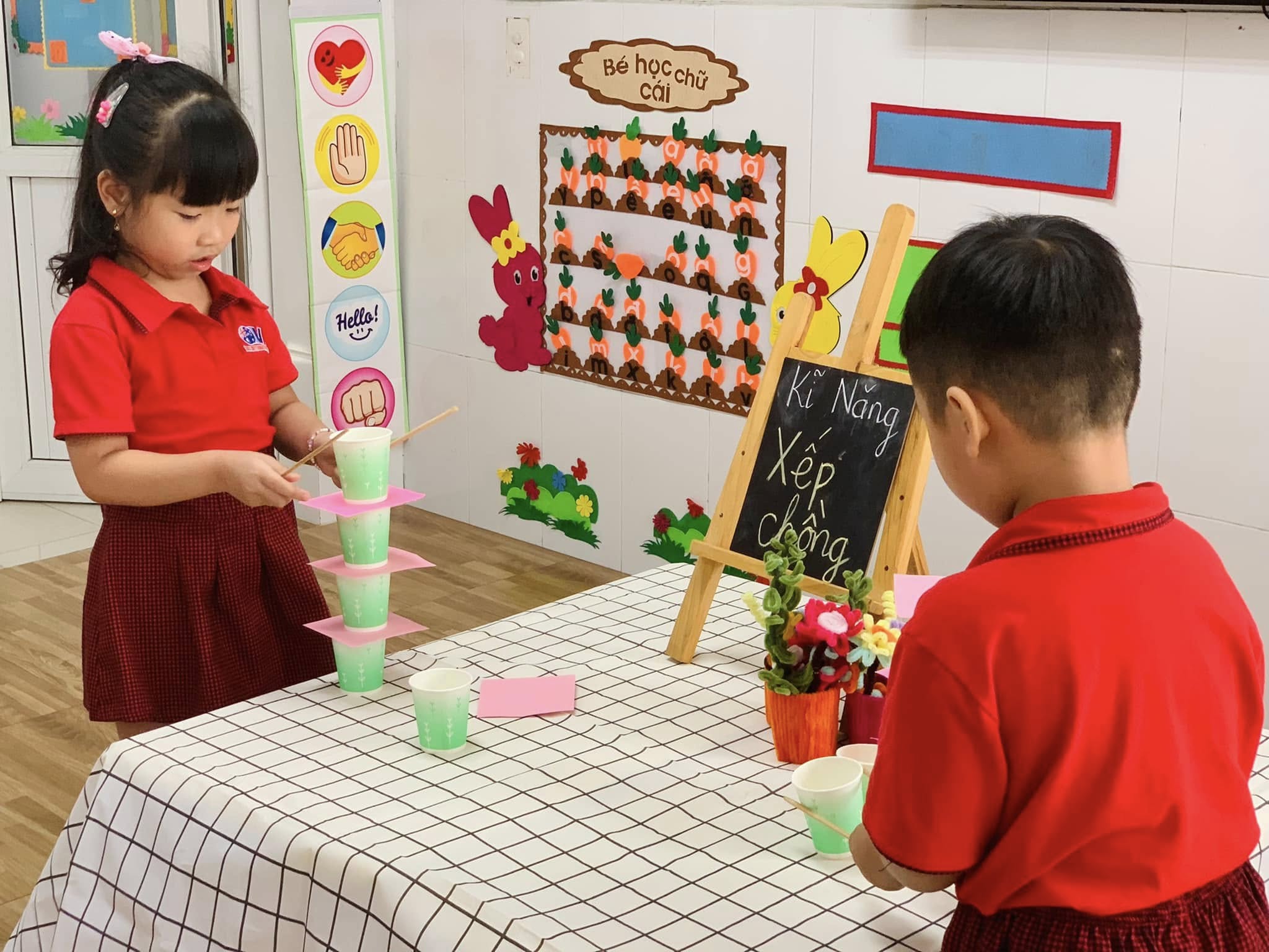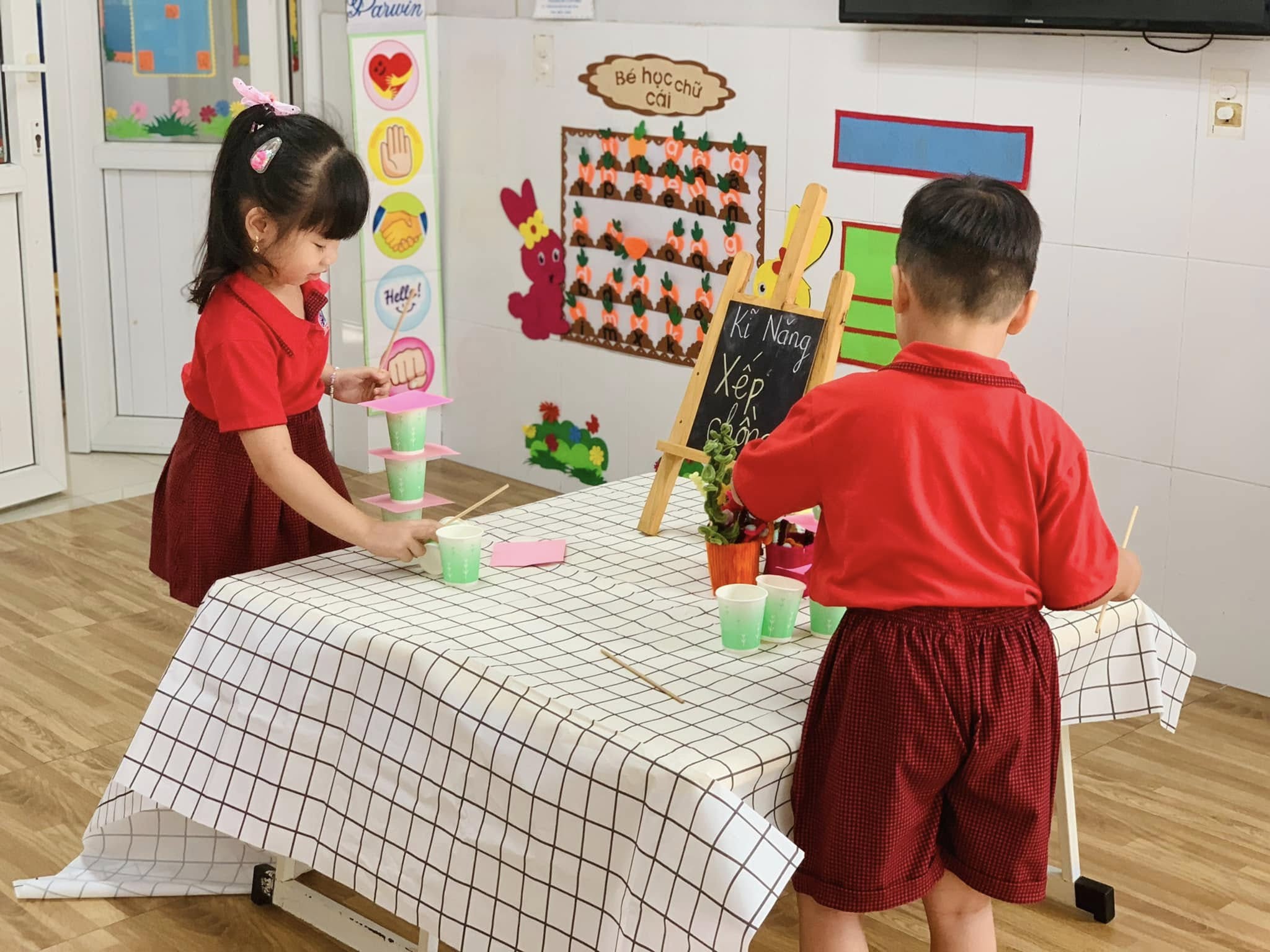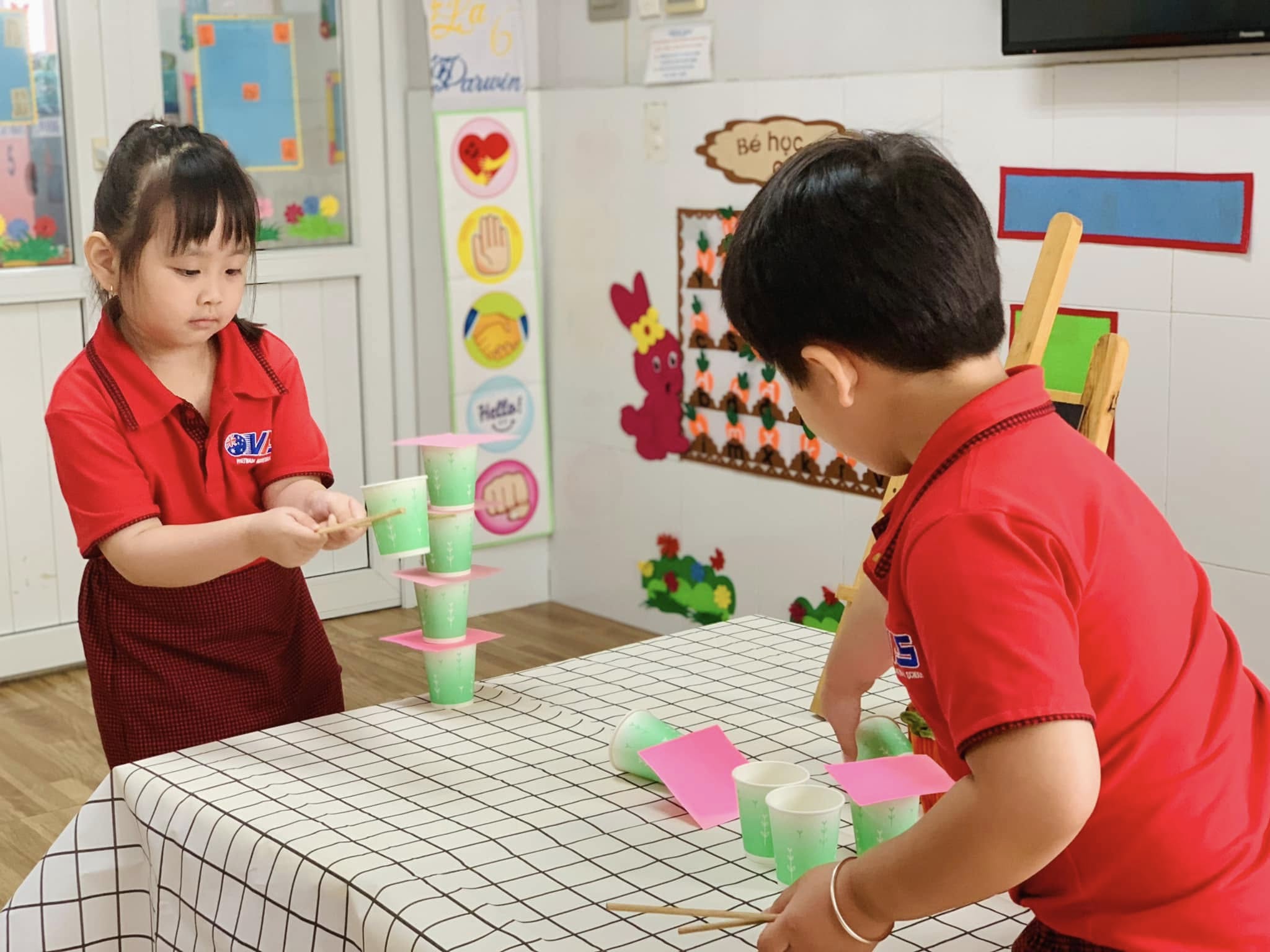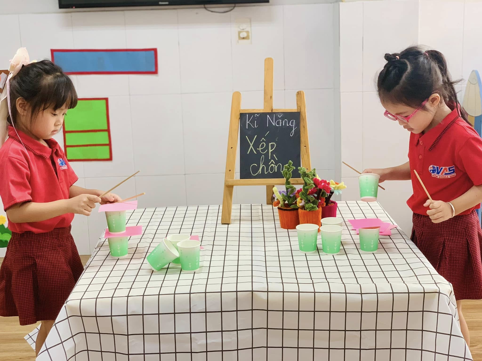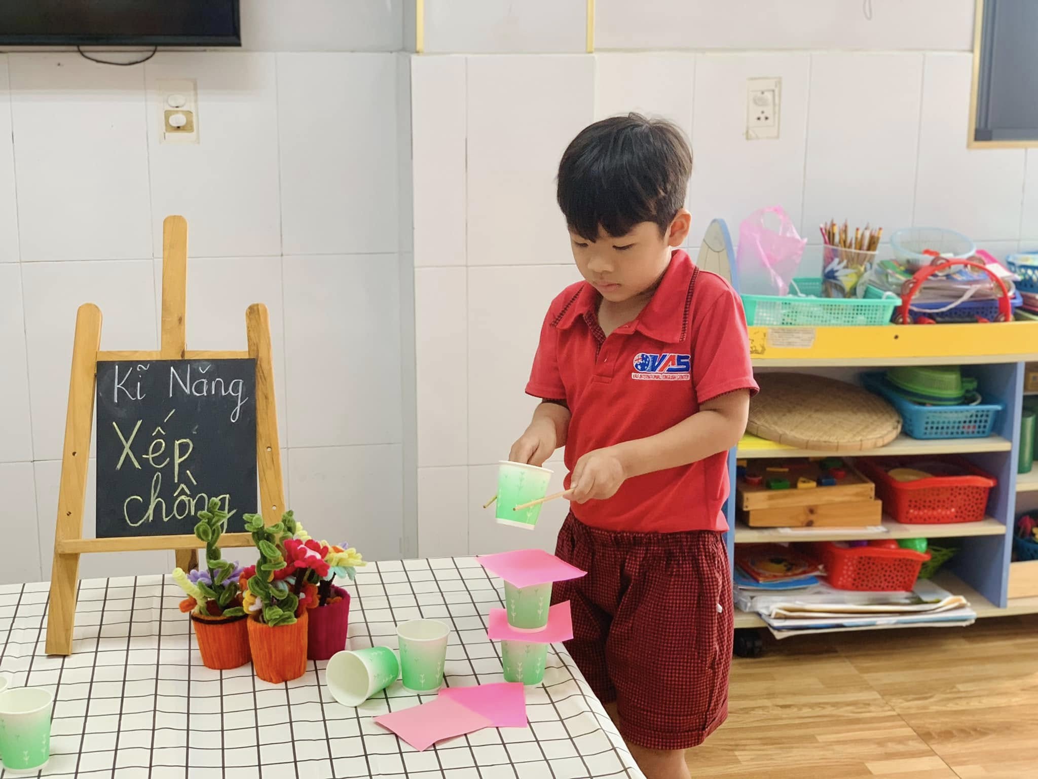 Với những chiếc ly đầy màu sắc, các bé hào hứng thử sức, từng bước cẩn thận xếp lên nhau để tạo thành những tòa tháp “mini” thật vững chắc.