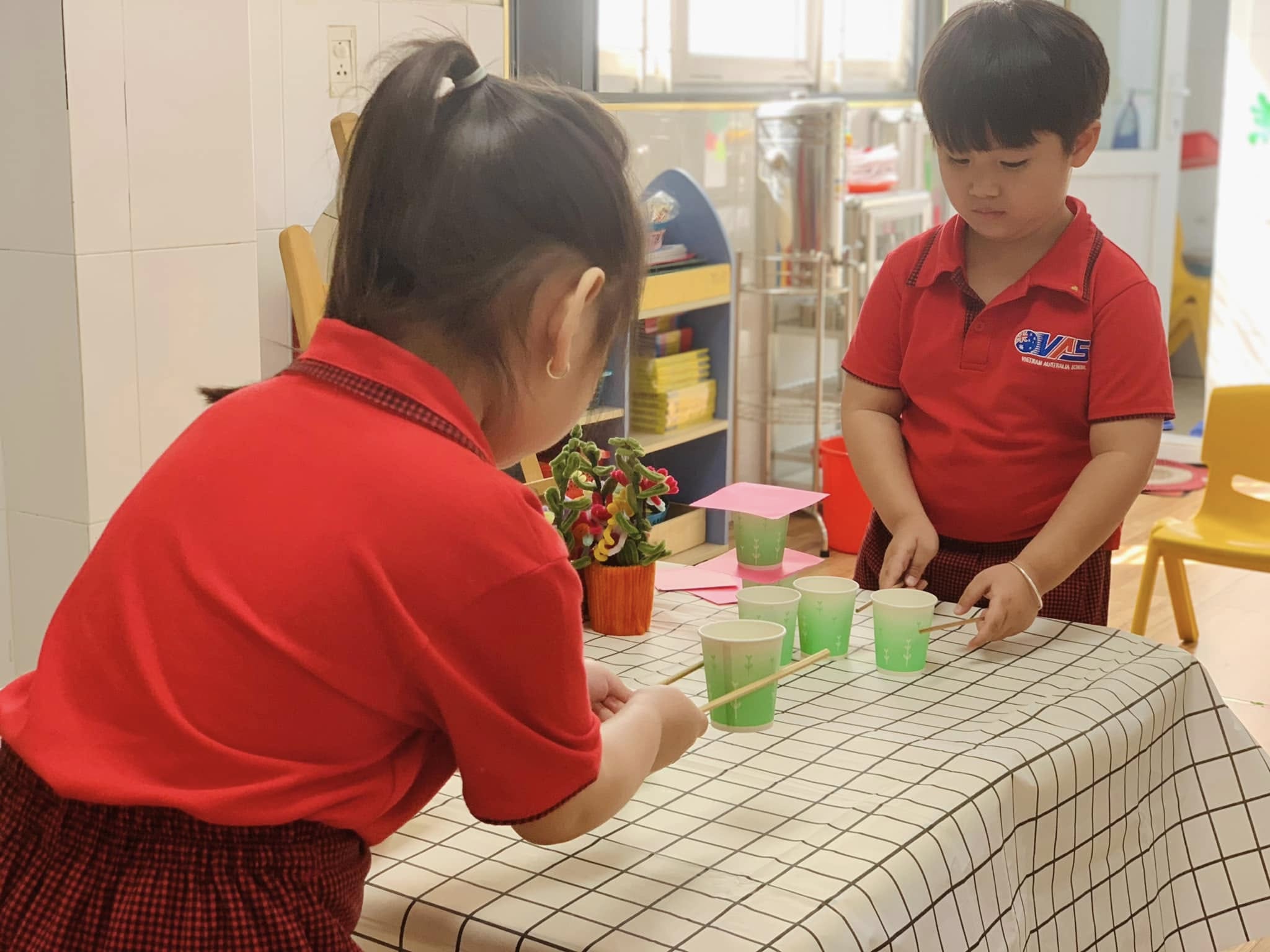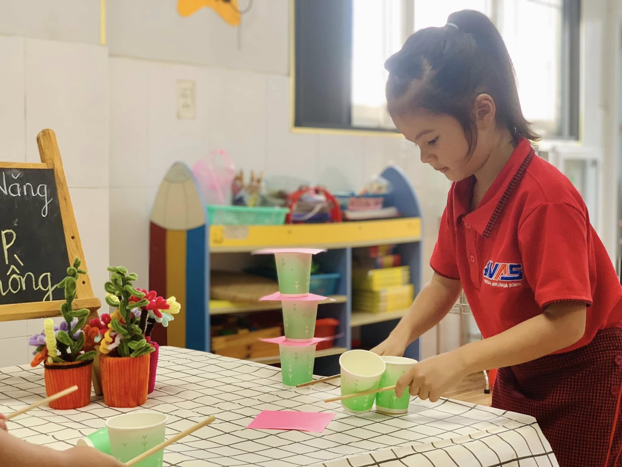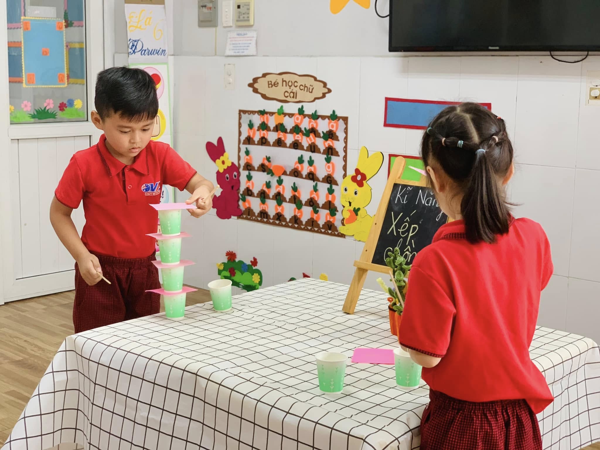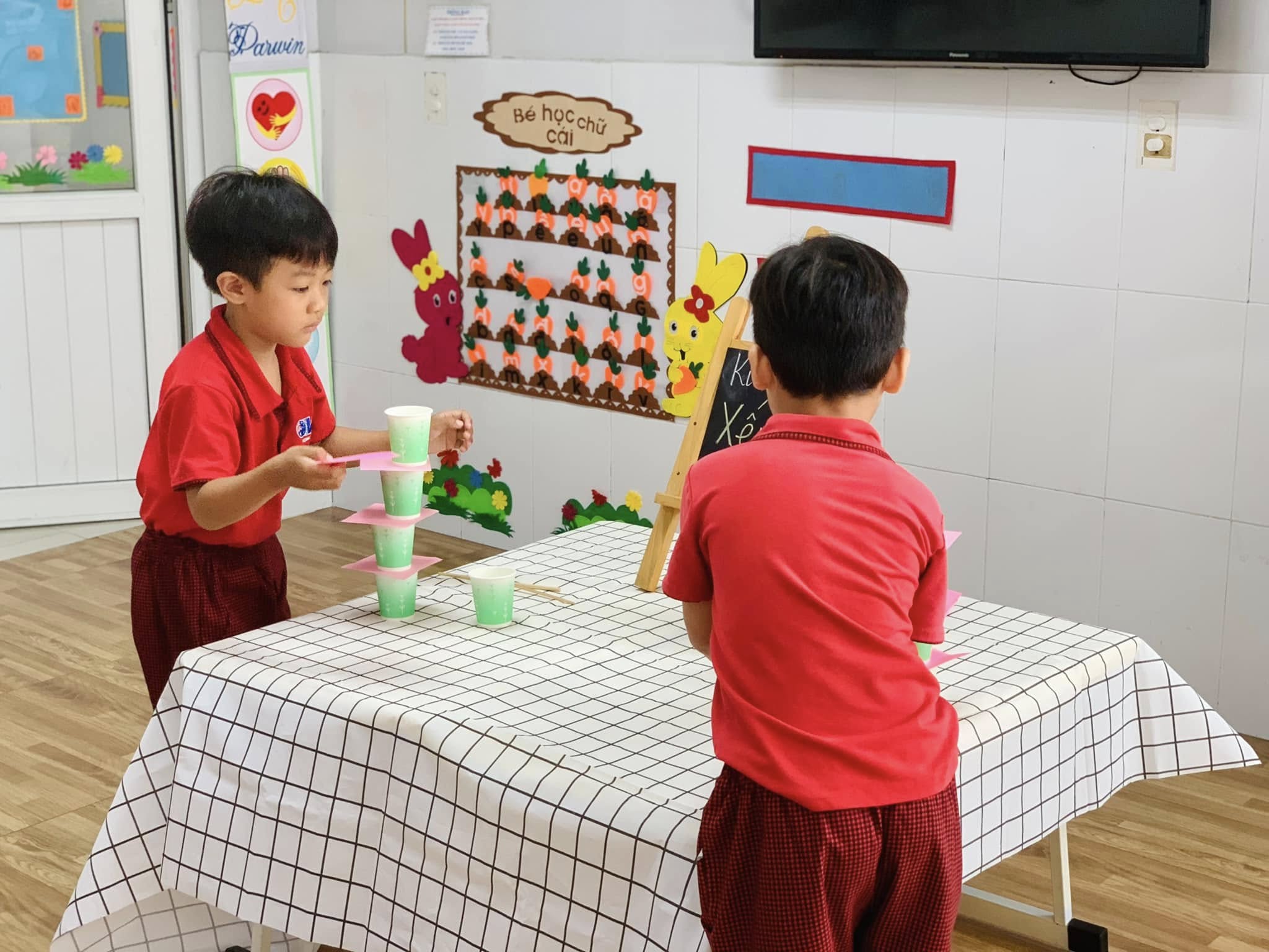 Với những chiếc ly đầy màu sắc, các bé hào hứng thử sức, từng bước cẩn thận xếp lên nhau để tạo thành những tòa tháp “mini” thật vững chắc.