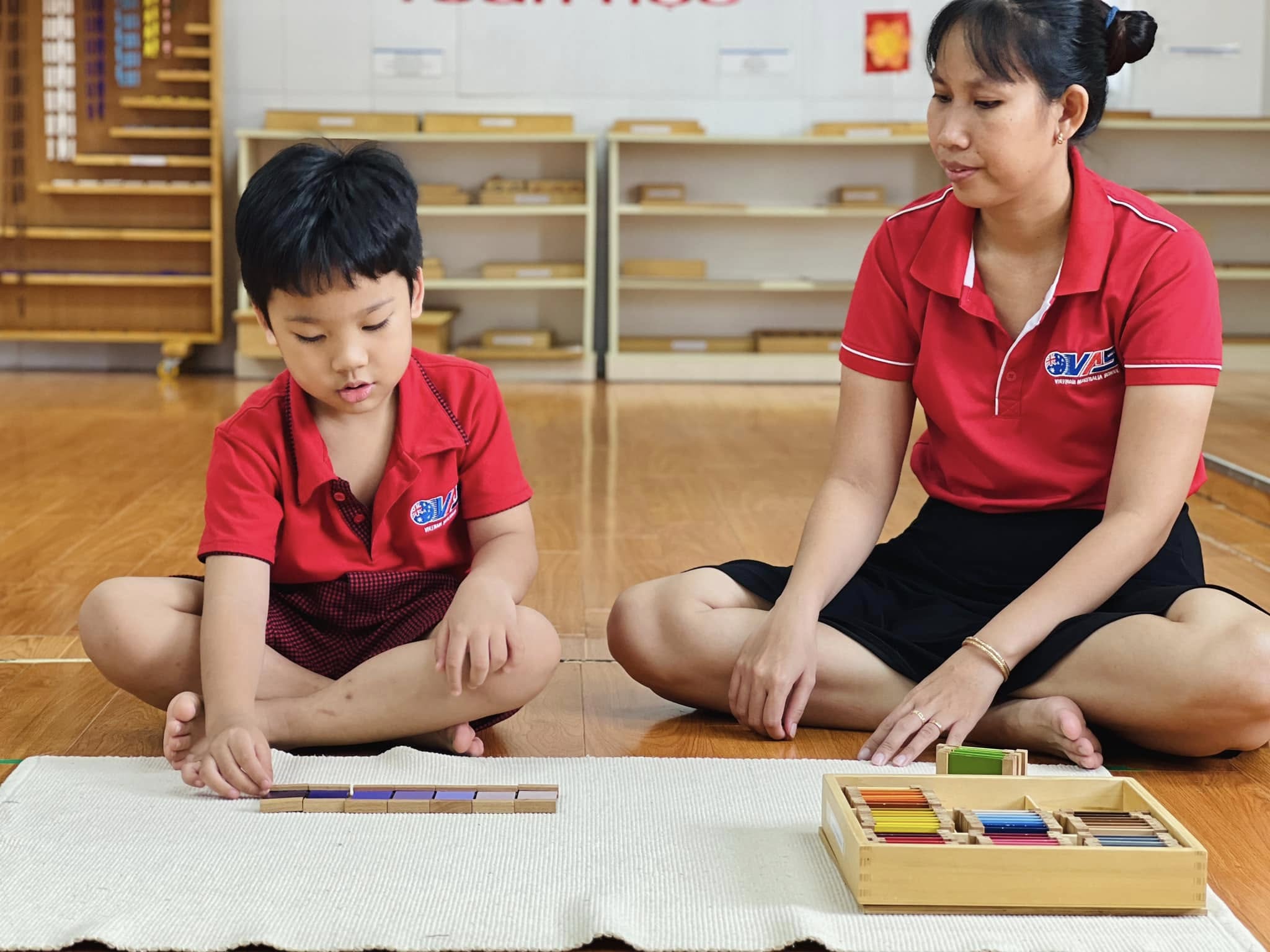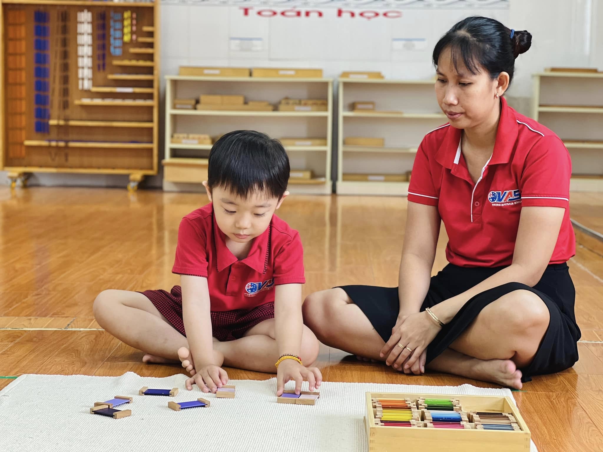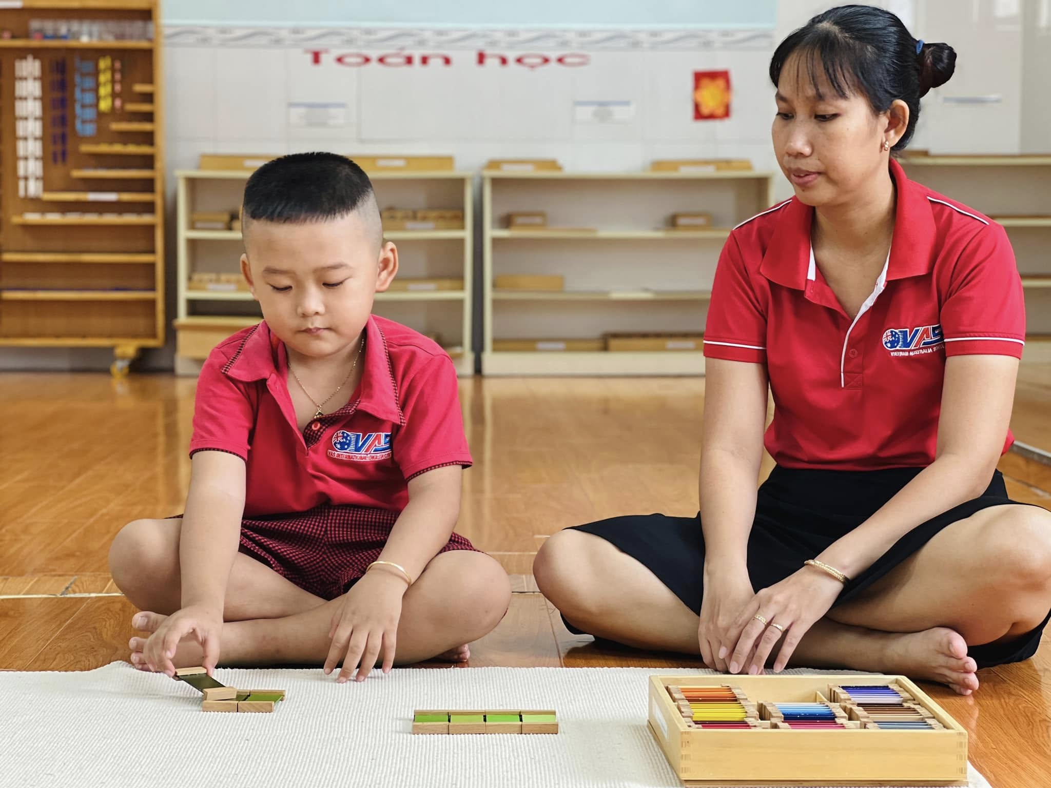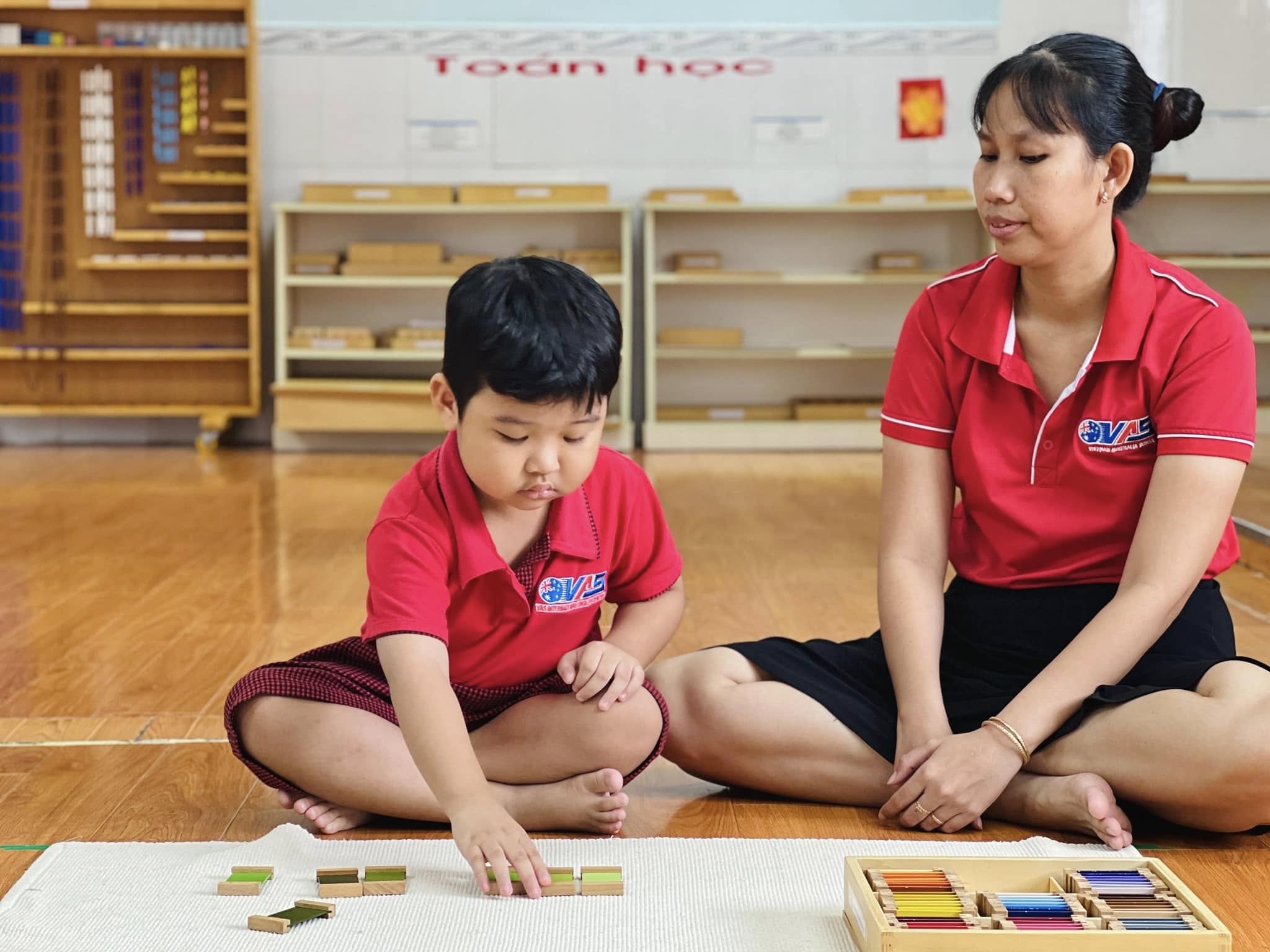 Trong tiết học Montessori hôm nay, các bé đã được trải nghiệm với bộ giáo cụ màu số 3 – nhận biết về màu sắc, màu sắc tương phản và cách phối hợp màu sắc.