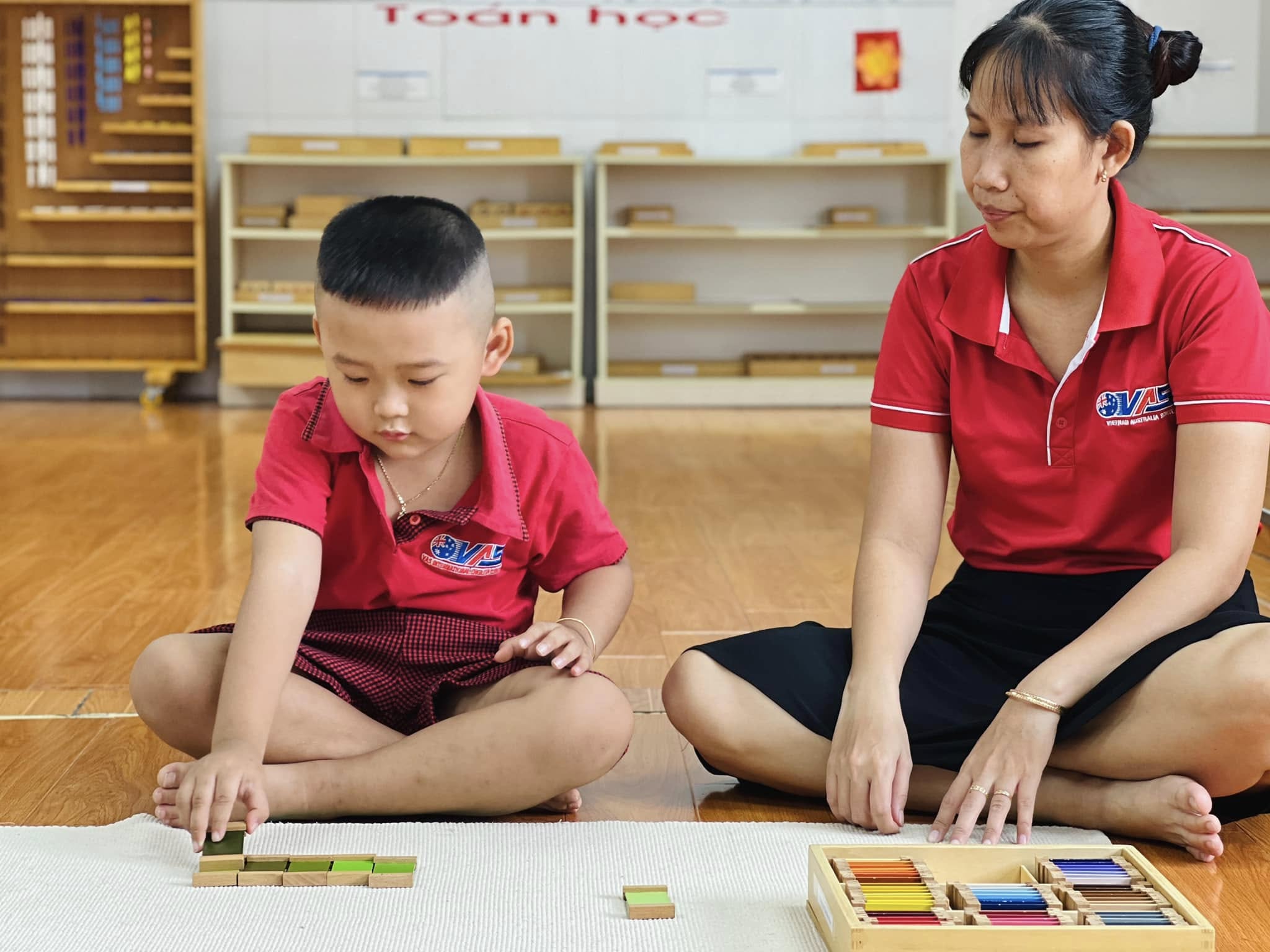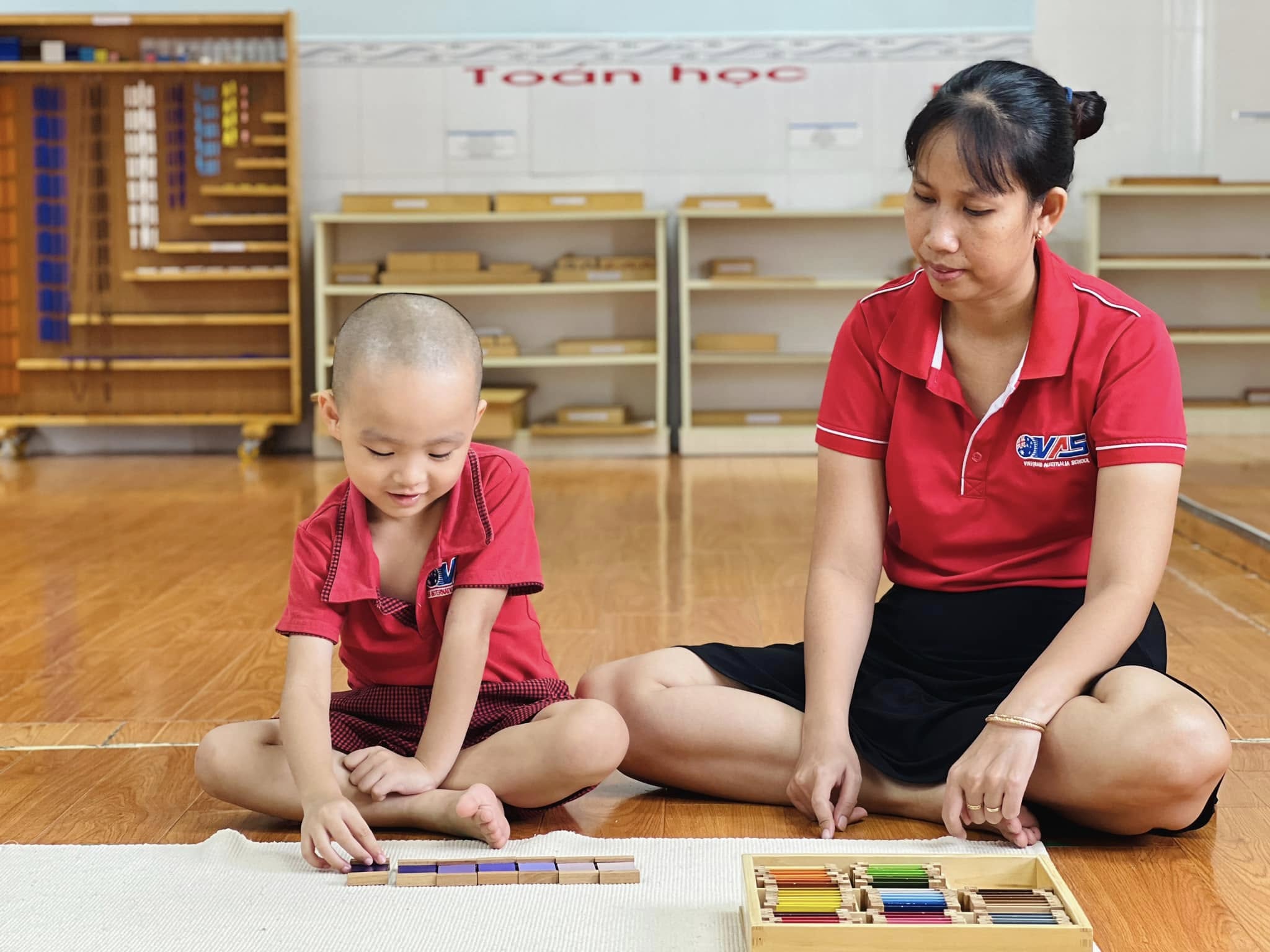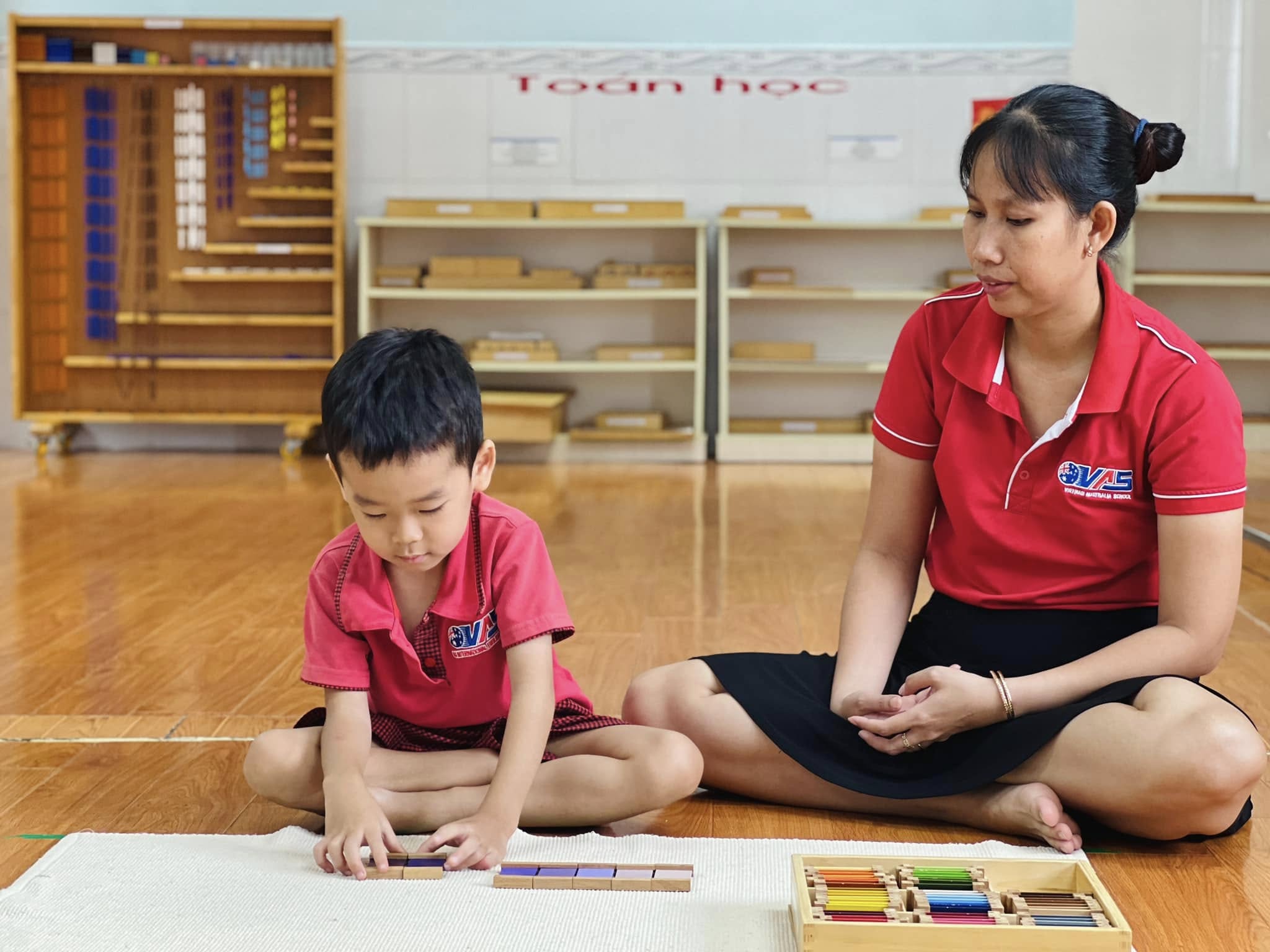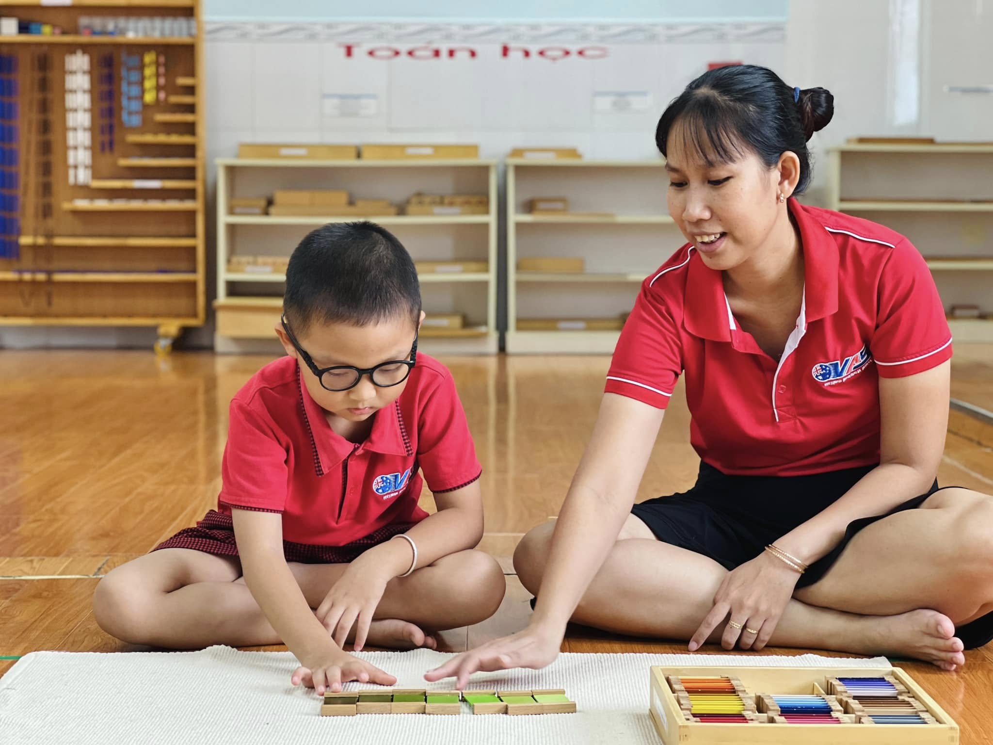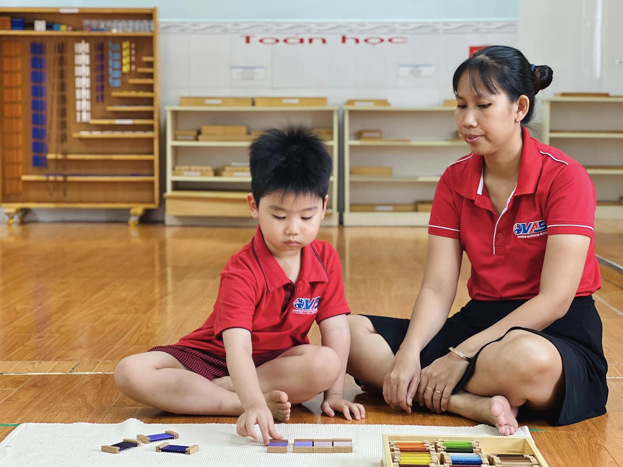 Trong tiết học Montessori hôm nay, các bé đã được trải nghiệm với bộ giáo cụ màu số 3 – nhận biết về màu sắc, màu sắc tương phản và cách phối hợp màu sắc.