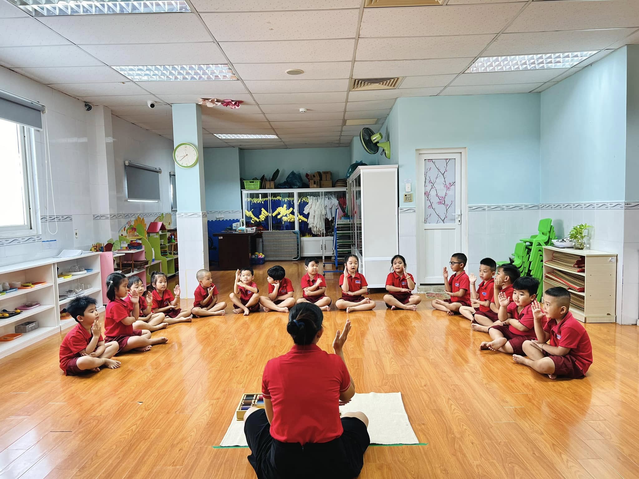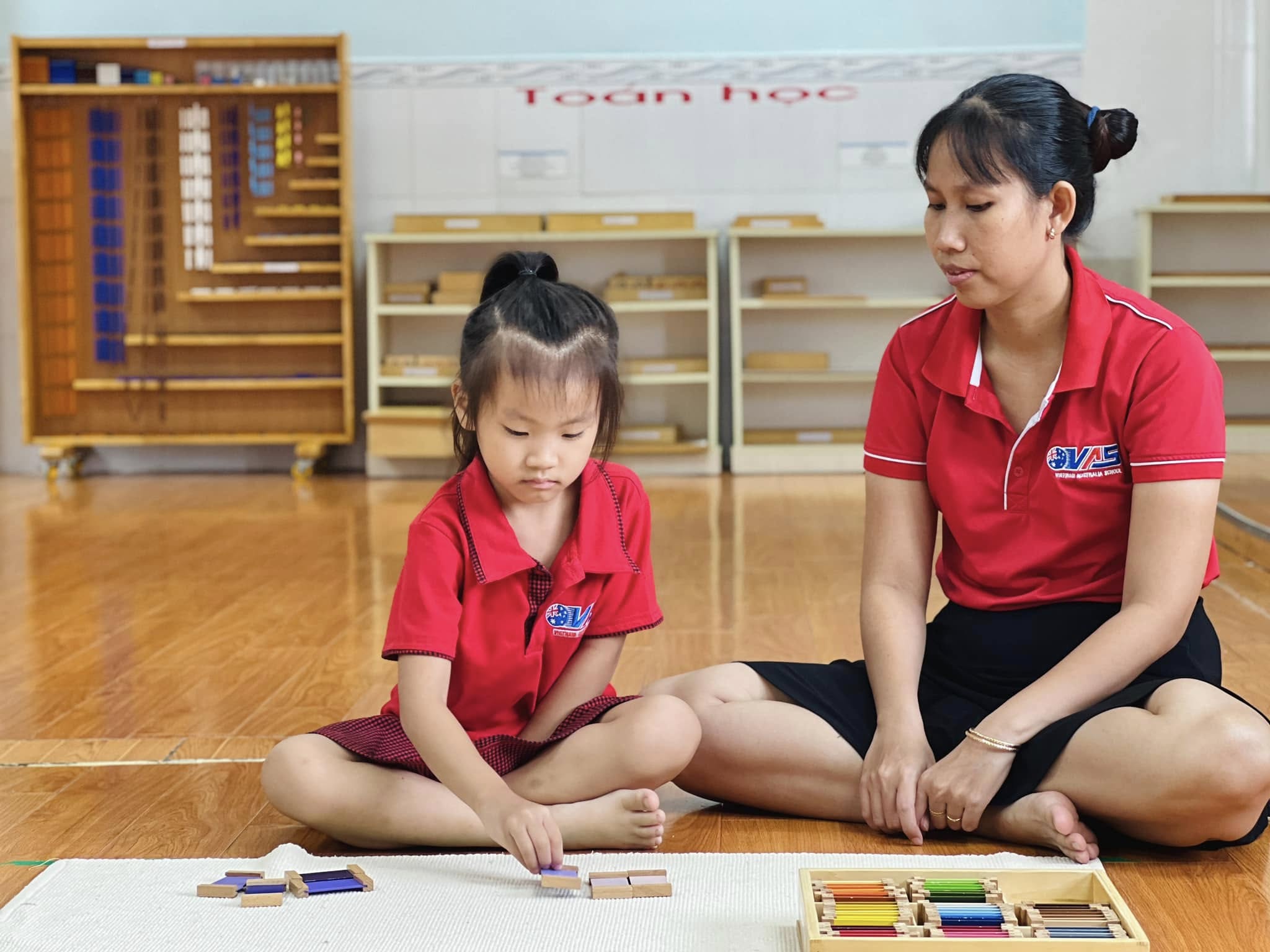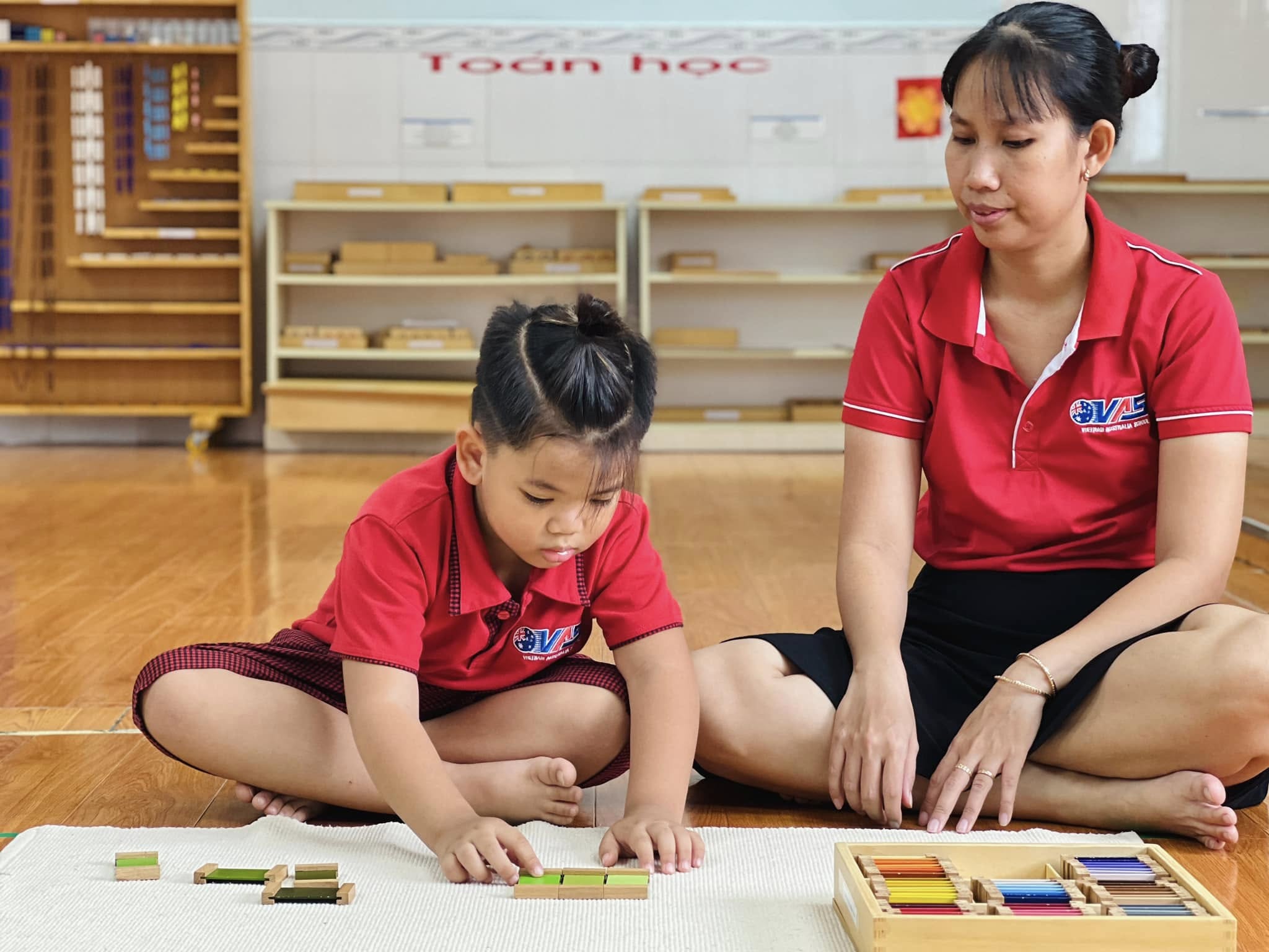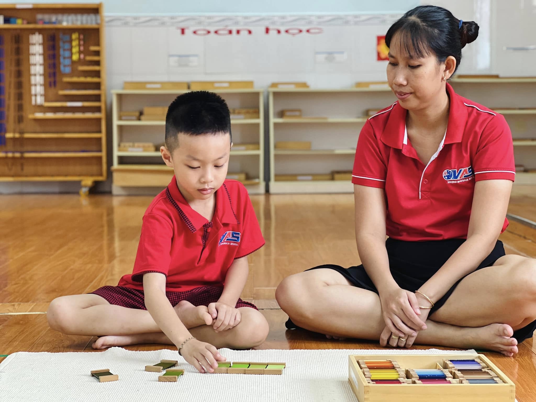 Trong tiết học Montessori hôm nay, các bé đã được trải nghiệm với bộ giáo cụ màu số 3 – nhận biết về màu sắc, màu sắc tương phản và cách phối hợp màu sắc.