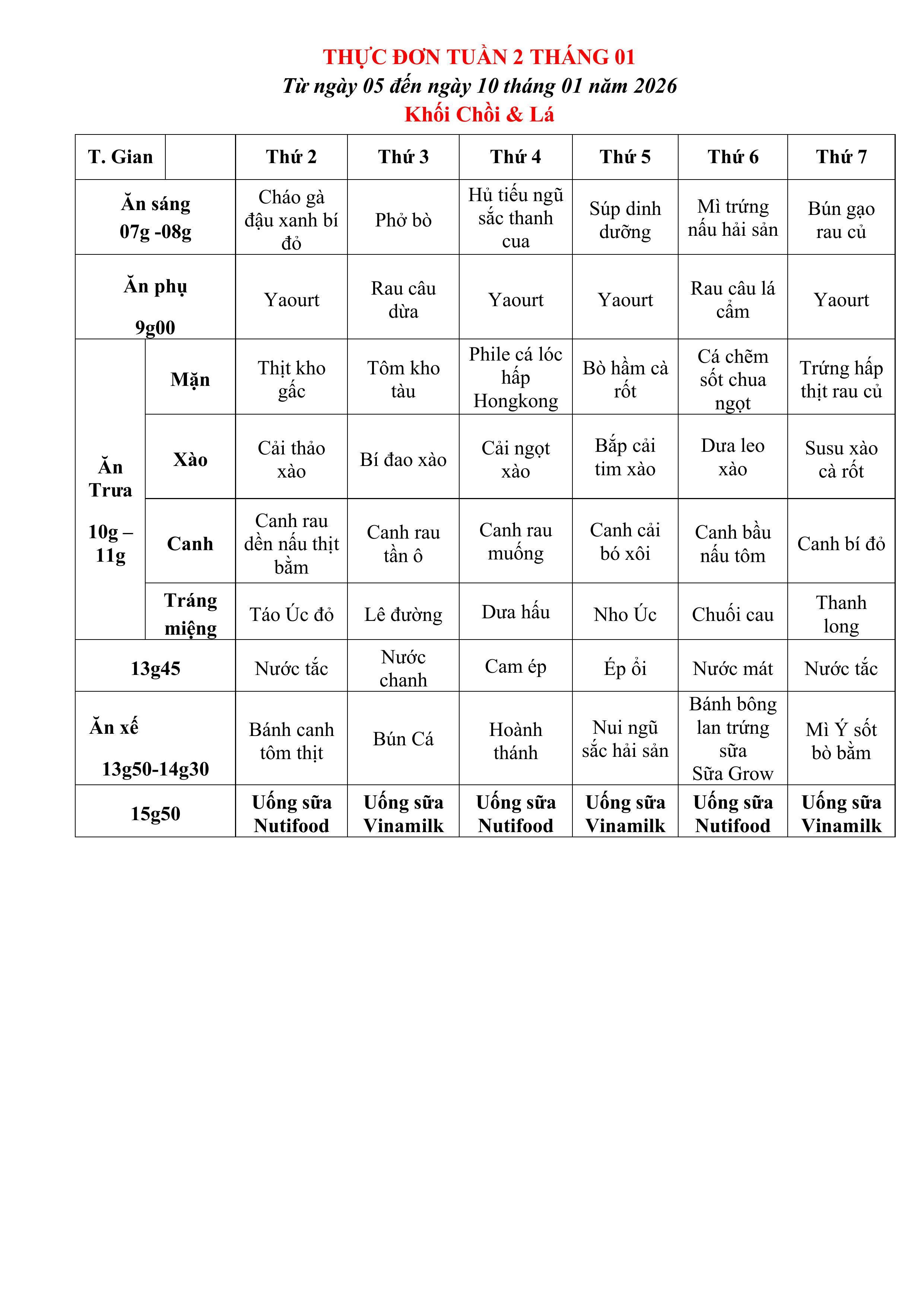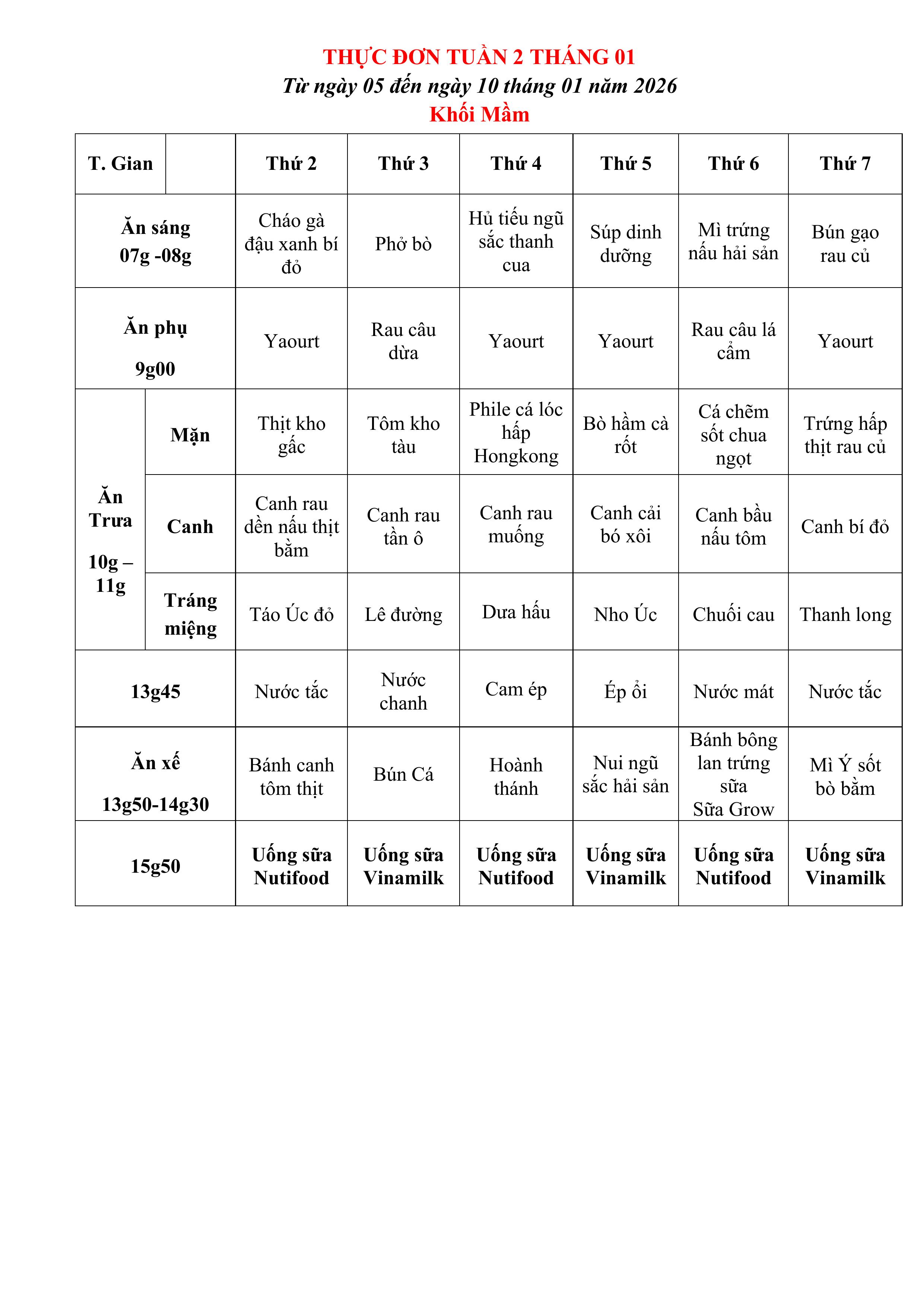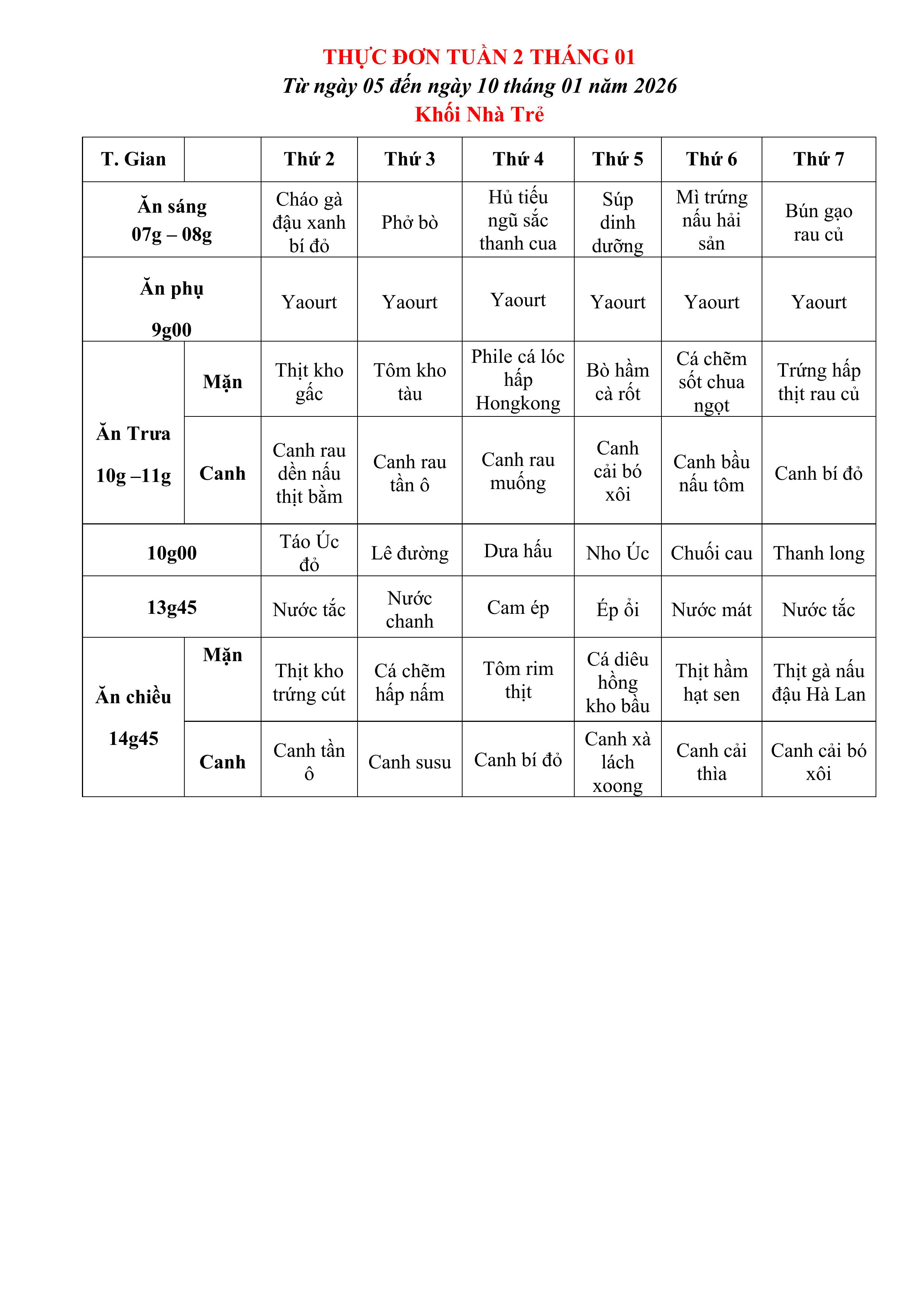 THỰC ĐƠN TUẦN 02 THÁNG 01/2026 (Từ ngày 05/01 đến ngày 10 tháng 01 năm 2026)