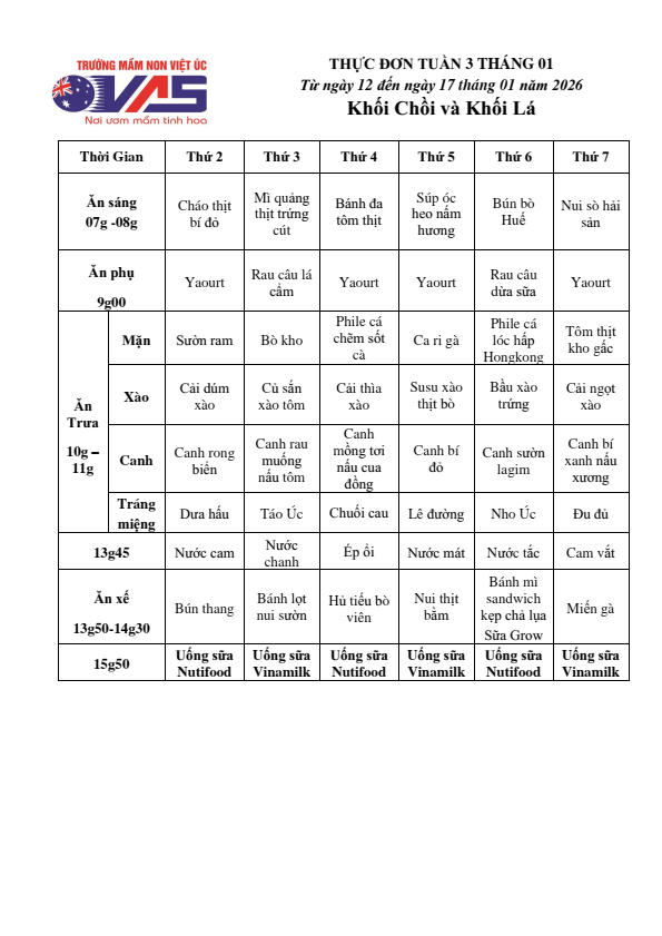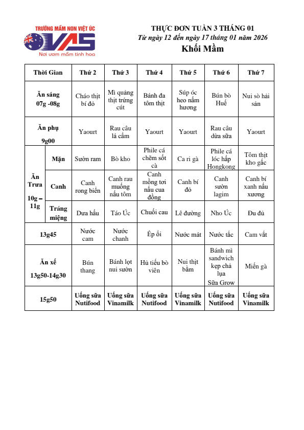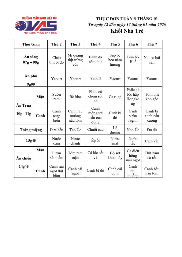 Mời Quý phụ huynh xem Thực đơn tuần 03 tháng 01 năm 2026 (Từ ngày 12/01 đến ngày 17 tháng 01 năm 2026) của bé