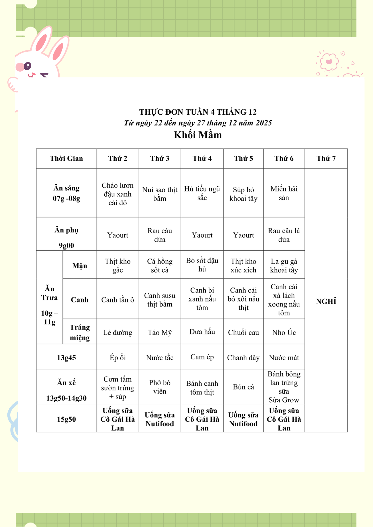 THỰC ĐƠN TUẦN 04 THÁNG 12/2025 (Từ ngày 22/12 đến ngày 27 tháng 12 năm 2025)