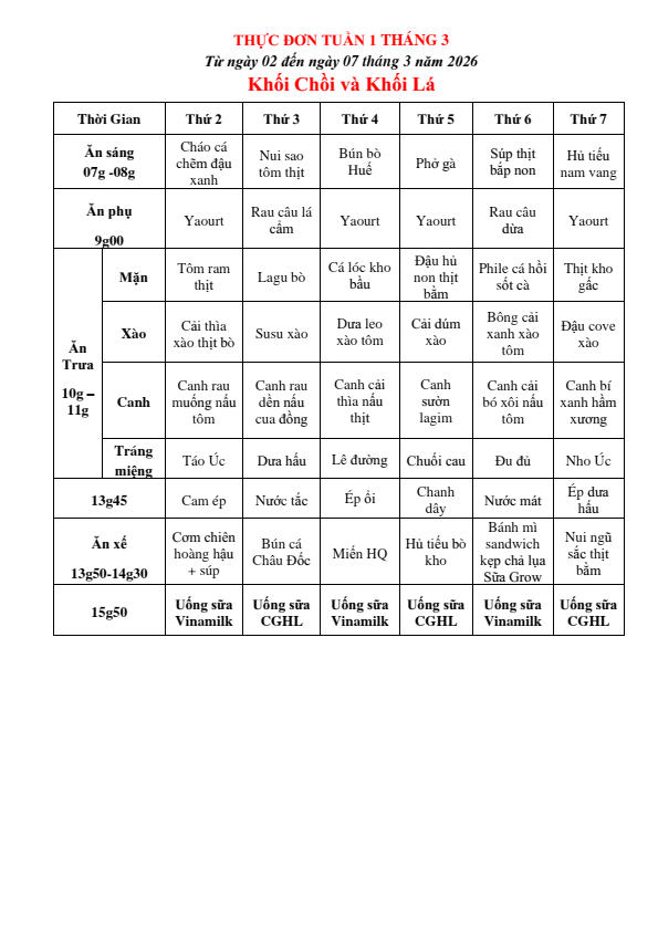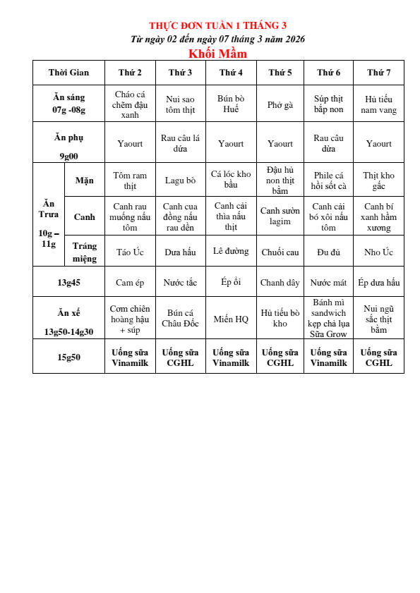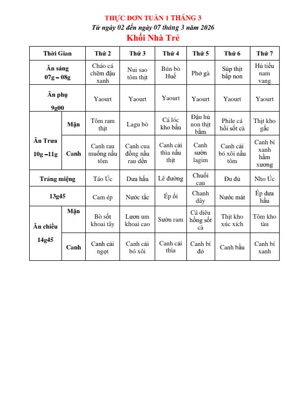 Mời Quý phụ huynh xem Thực đơn tuần 01 tháng 03 năm 2026 (Từ ngày 02/03 đến ngày 07 tháng 03 năm 2026) của bé: