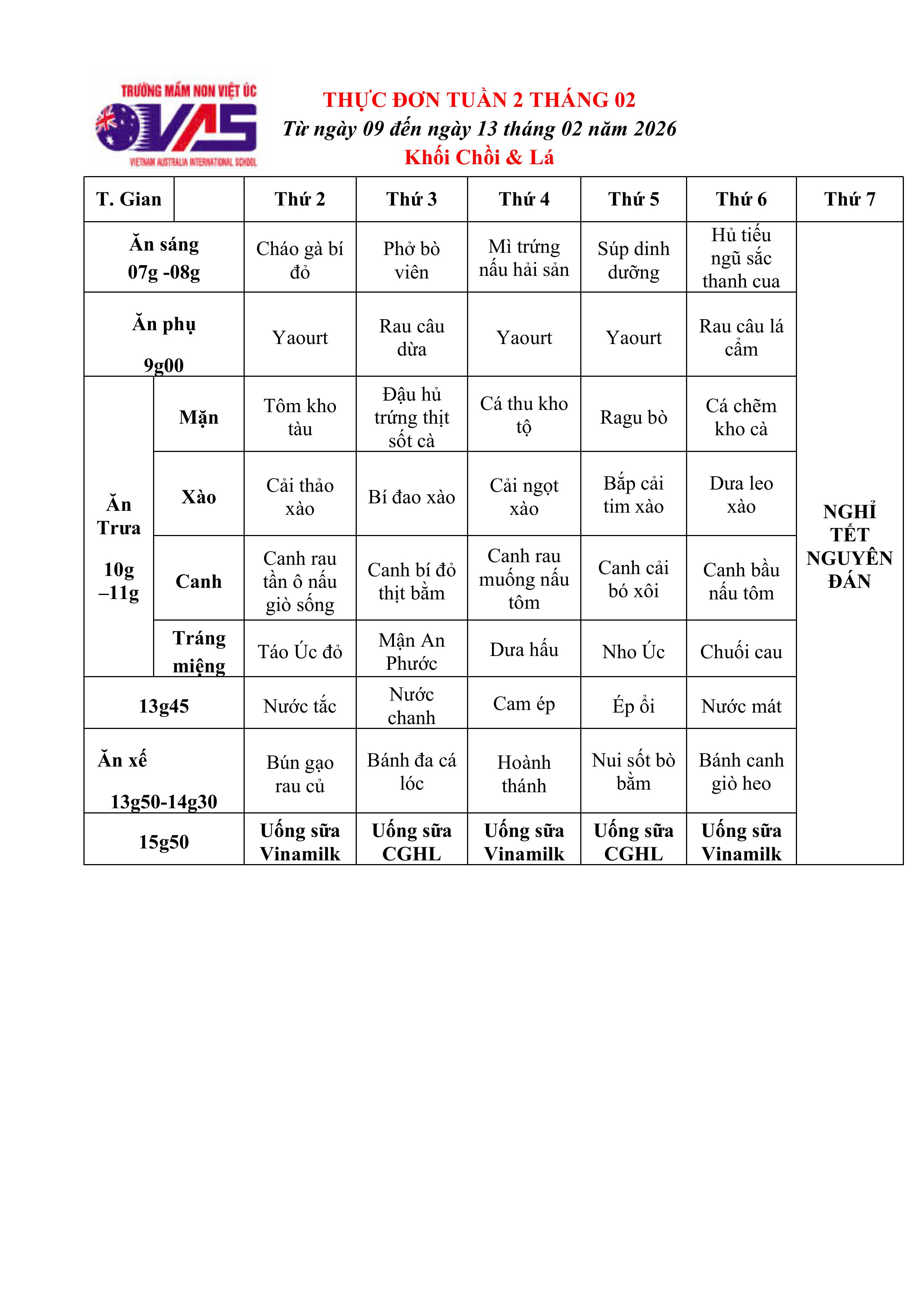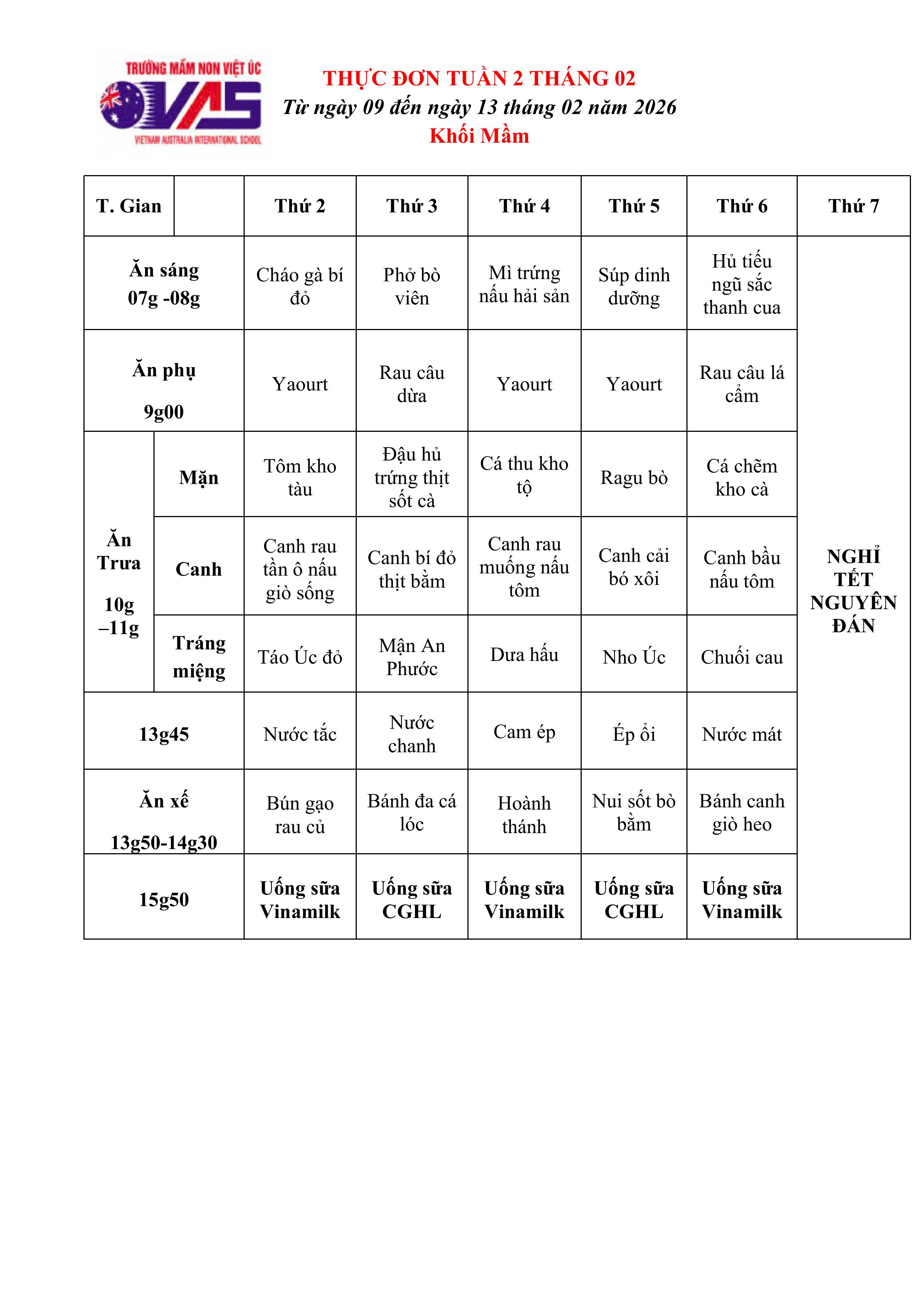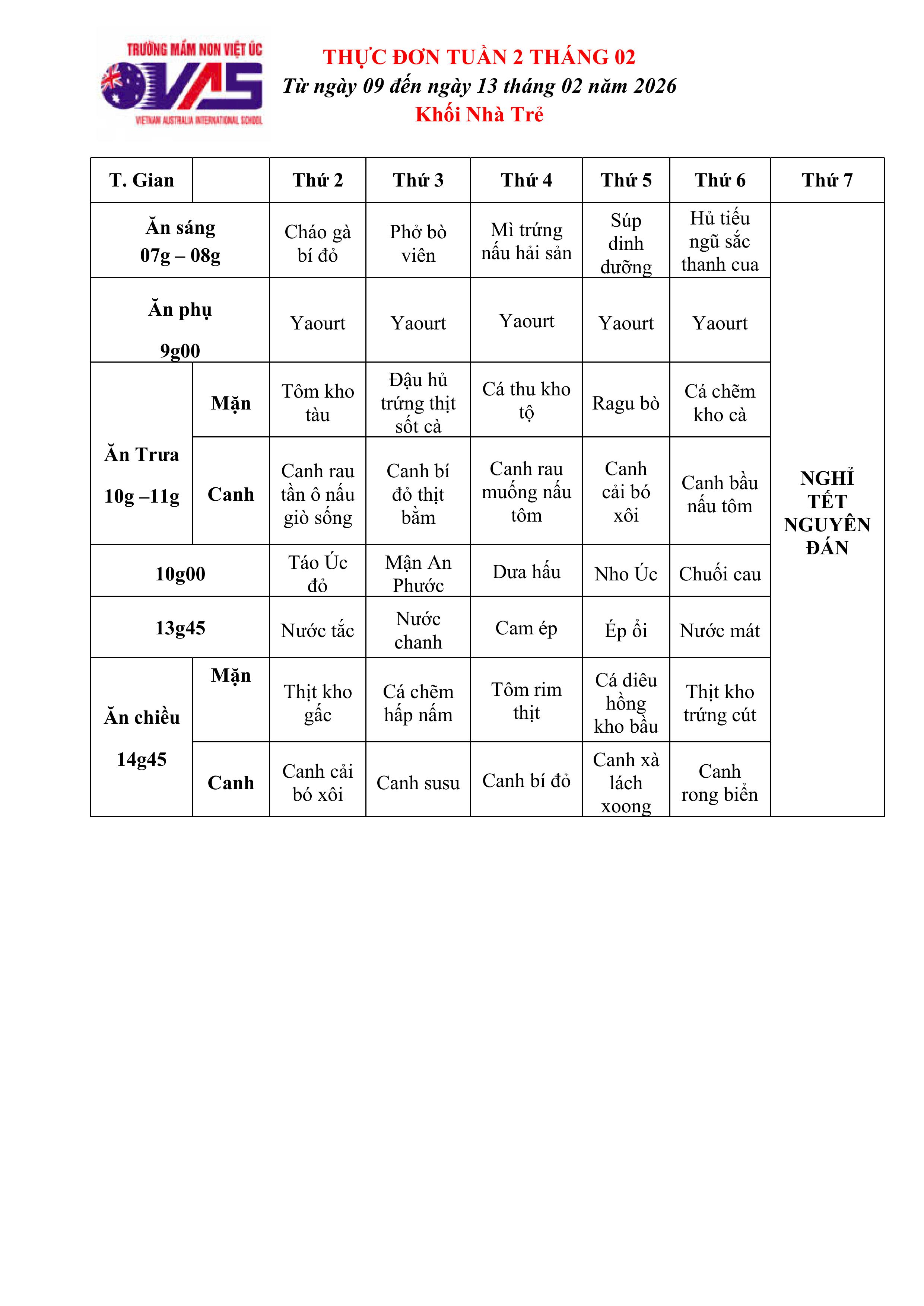 Mời Quý phụ huynh xem Thực đơn tuần 2 tháng 02 năm 2026 (Từ ngày 09/02 đến ngày 13 tháng 02 năm 2026) của bé